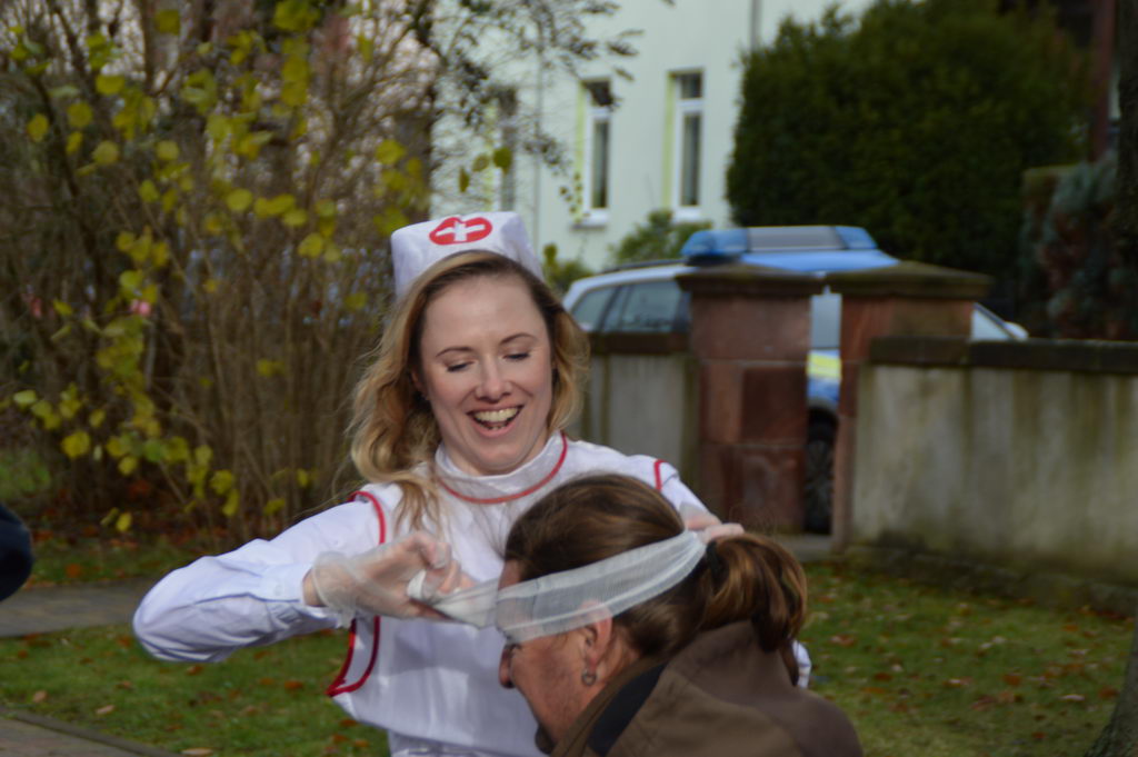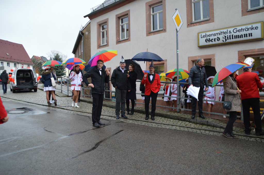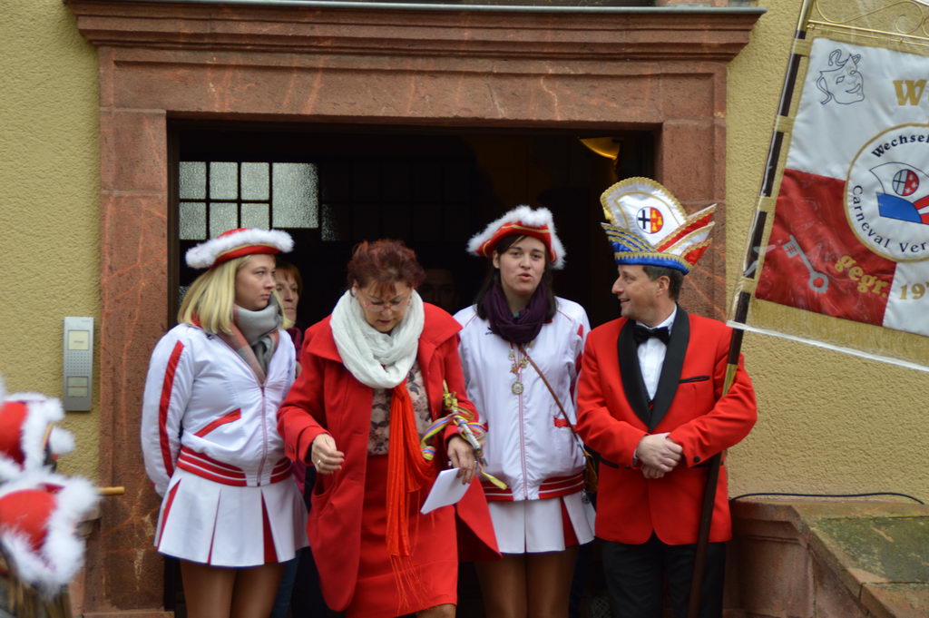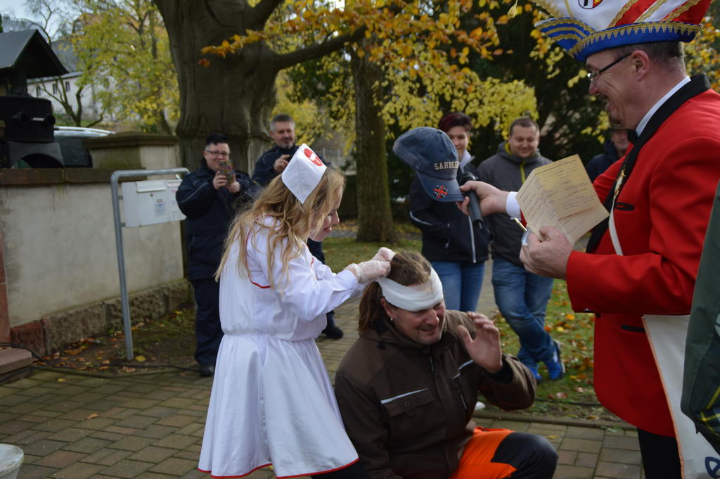 Pünktlich um 11 Uhr 11 war der Zug vor dem Wechselburger Rathaus angekommen. Hier wurde er bereits von den Zuschauern erwartet. Nachdem die Bürgermeisterin, Frau Renate Naumann, von den Ordonanzen der Funkengarde aus ihren Büroräumen geholt wurde, übergab sie den Rathausschlüssel an das noch amtierende Prinzenpaar. Jetzt hatten die Narren symbolisch die Macht im Rathaus übernommen. Damit auch jeder weiß, wie der Hase jetzt läuft, mussten die Gemeindearbeiter einige Aufgaben lösen. Angelehnt war dies an Berufe und Einrichtungen, die es im Verlaufe der Zeit im Rathaus schon gegeben hatte. Zu all den einzelnen Programmpunkten wurden durch unseren Präsidenten Udo Modes ein paar begleitende Worte gesagt. Die Bürgermeisterin musste sich zum Beispiel als Schäferin (Schaftstall) beweisen. Silvio Dost hatte sich als Kellnerin (Gaststätte mit Außenterassen) verkleidet und kredenzte ihr ein Getränk. Der neue Kämmerer der Gemeindeverwaltung, Herr Christian Schleußner, musste ein Kegeldress anziehen und versuchen, alle Neune zu spielen (ehemalige Kegelbahn). Und Jens Gerstenberger musste sich als „Schwerverletzter“ von unserer Krankenschwester Jessica Pester (Arztpraxen) verarzten lassen. Als Ausblick, was aus dem Rathaus einmal werden könnte, kamen auch schon mal die drei ersten Neubewohner (Andreas Vollstädt, Klaus-Peter Ziemann und Sven Benndorf) für ein mögliches Wechselburger Altenheim.