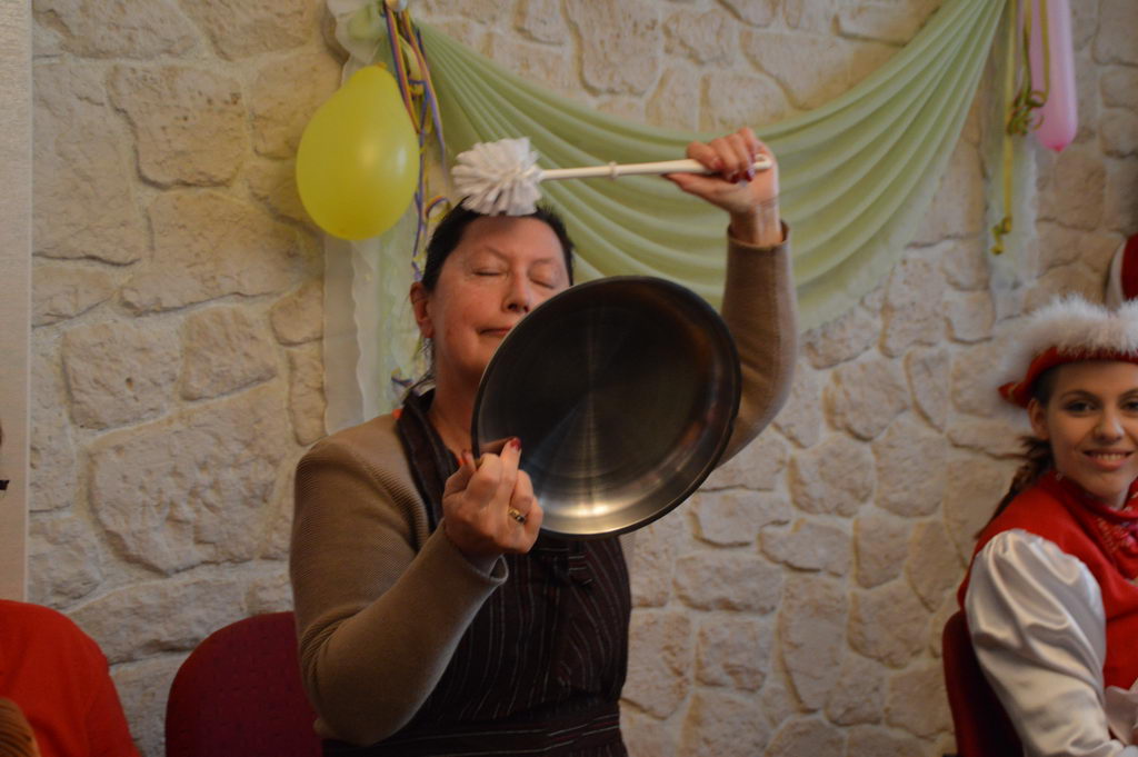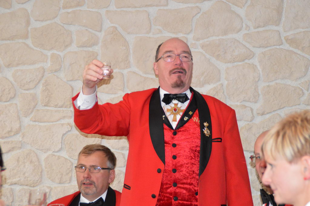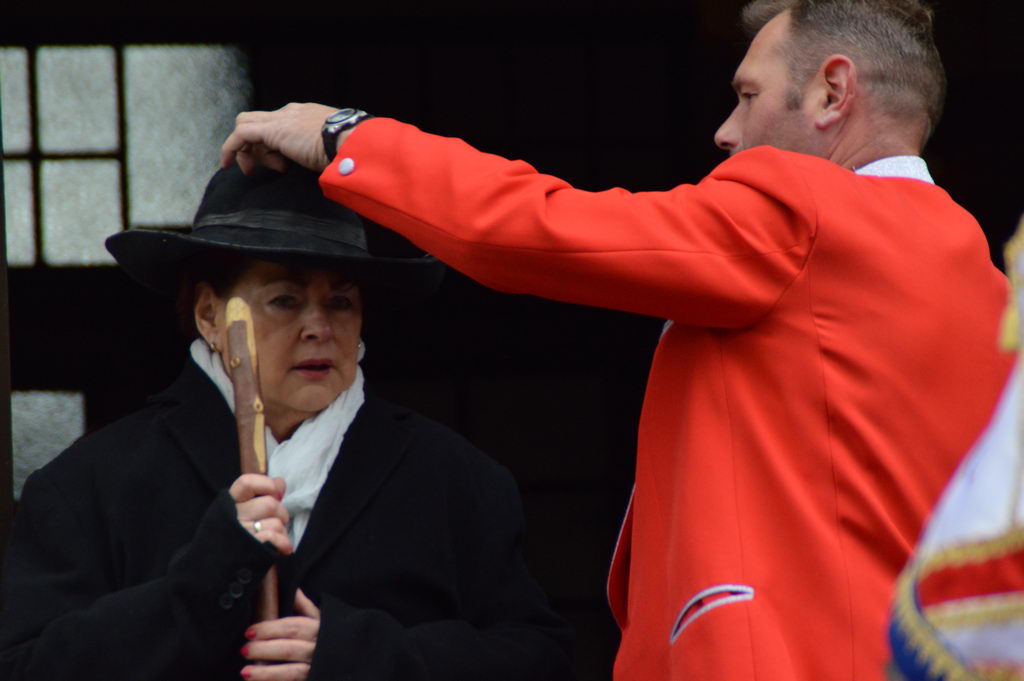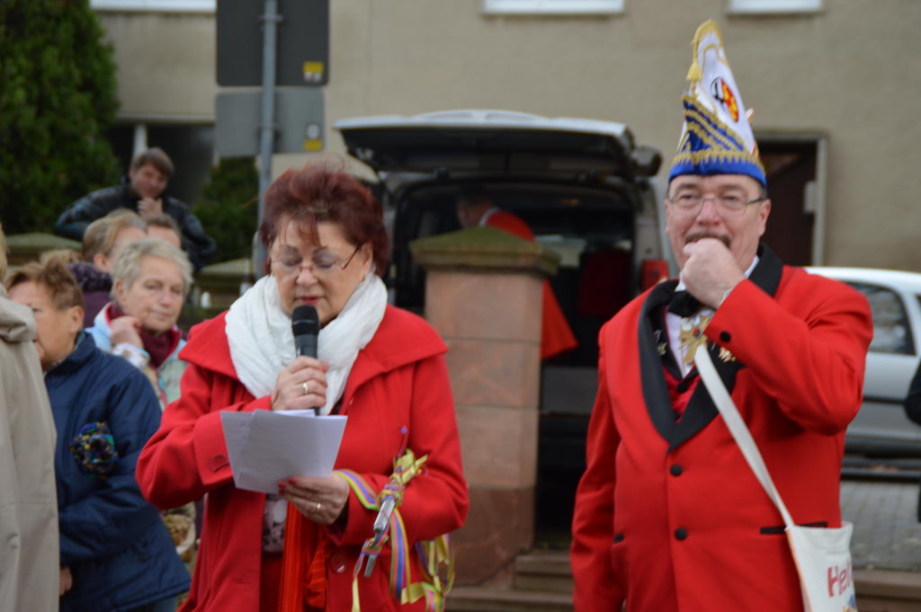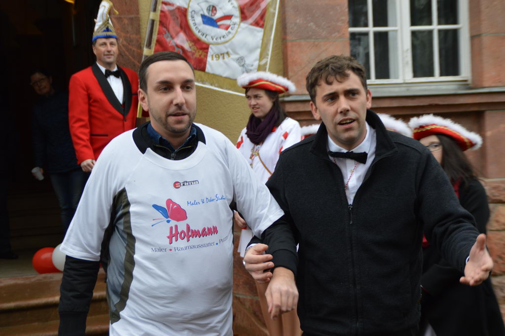 Pünktlich um 11 Uhr 11 war der Zug vor dem Wechselburger Rathaus angekommen. Hier wurde er bereits von den Zuschauern erwartet. Nachdem die Bürgermeisterin, Frau Renate Naumann, von den Ordonanzen der Funkengarde aus ihren Büroräumen geholt wurde, übergab sie den Rathausschlüssel an das noch amtierende Prinzenpaar. Jetzt hatten die Narren symbolisch die Macht im Rathaus übernommen. Damit auch jeder weiß, wie der Hase jetzt läuft, mussten die Gemeindearbeiter einige Aufgaben lösen. Angelehnt war dies an Berufe und Einrichtungen, die es im Verlaufe der Zeit im Rathaus schon gegeben hatte. Zu all den einzelnen Programmpunkten wurden durch unseren Präsidenten Udo Modes ein paar begleitende Worte gesagt. Die Bürgermeisterin musste sich zum Beispiel als Schäferin (Schaftstall) beweisen. Silvio Dost hatte sich als Kellnerin (Gaststätte mit Außenterassen) verkleidet und kredenzte ihr ein Getränk. Der neue Kämmerer der Gemeindeverwaltung, Herr Christian Schleußner, musste ein Kegeldress anziehen und versuchen, alle Neune zu spielen (ehemalige Kegelbahn). Und Jens Gerstenberger musste sich als „Schwerverletzter“ von unserer Krankenschwester Jessica Pester (Arztpraxen) verarzten lassen. Als Ausblick, was aus dem Rathaus einmal werden könnte, kamen auch schon mal die drei ersten Neubewohner (Andreas Vollstädt, Klaus-Peter Ziemann und Sven Benndorf) für ein mögliches Wechselburger Altenheim.