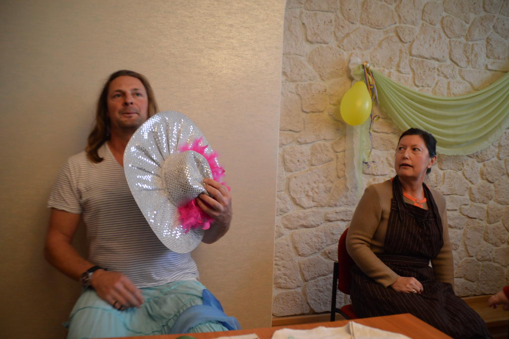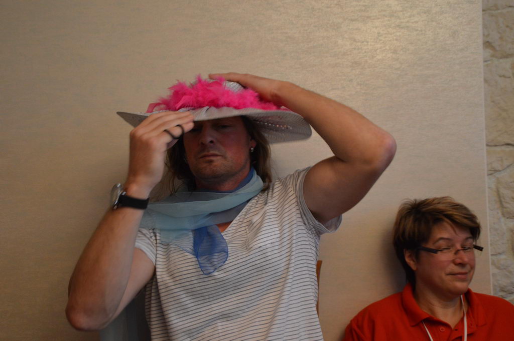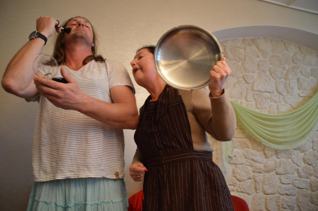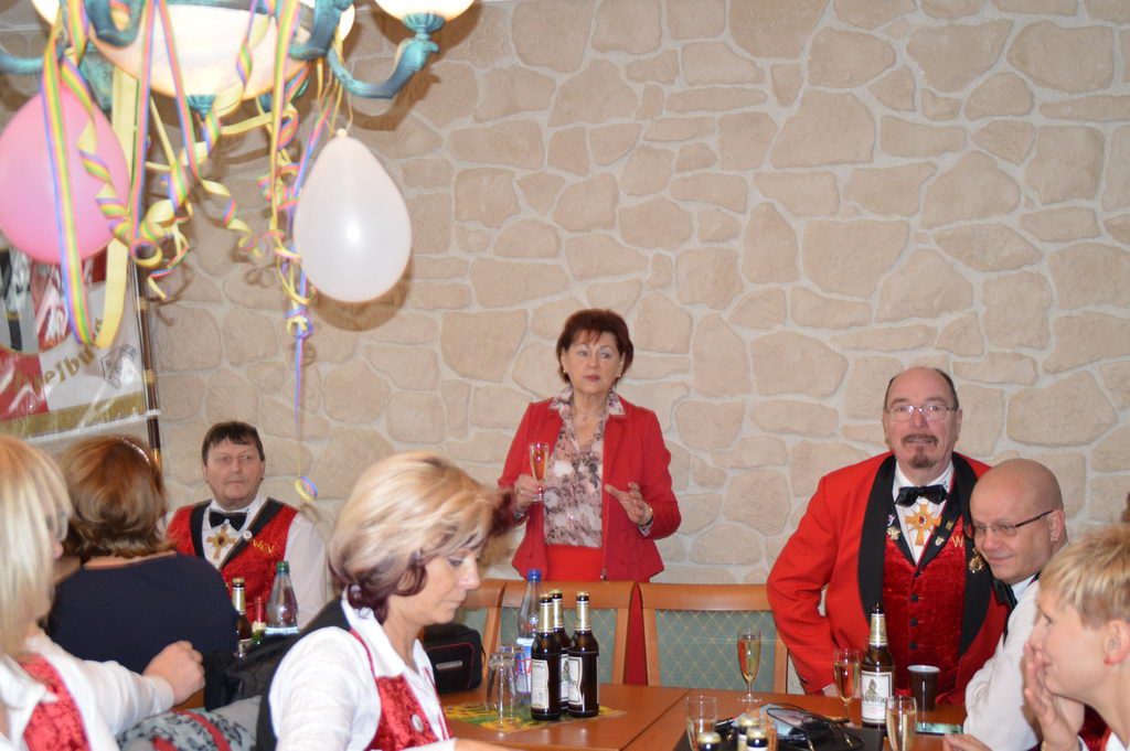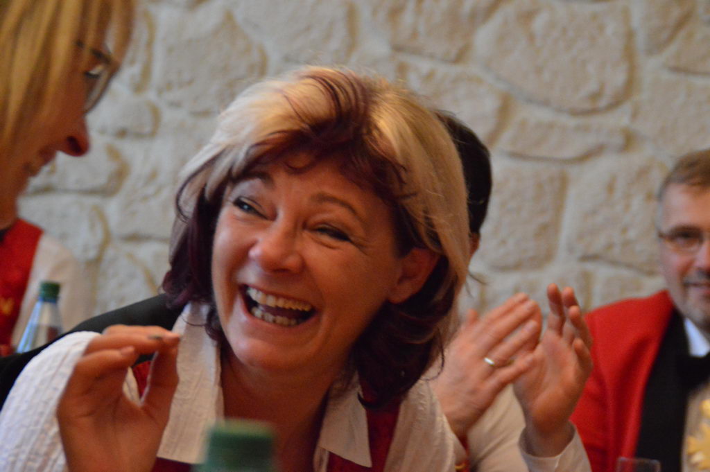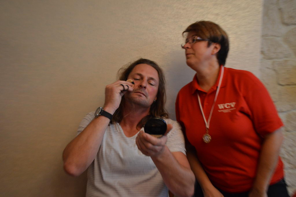 Weiter ging es dann im Rathaus mit einer ersten öffentlichen Ratssitzung der fünften Jahreszeit. So einen vollen Ratssaal haben wir zum 11.11. lange nicht gesehen. Es waren nicht nur über 40 Vereinsmitglieder, sondern auch zahlreiche Wechselburger Bürger ins Rathaus gekommen. Hierzu hatte sich die Gemeindeverwaltung wieder etwas einfallen lassen. Frau Naumann kündigte einen Intercity von Berlin in Richtung Wechselburger Hauptbahnhof an. Die einzigen Mitreisenden waren Bettina Voigt und Jens Gerstenberger. Diese versuchten sich gegenseitig im Schminken zu übertreffen. Jens Gerstenberger als Diva und Bettina Voigt als eher einfache Bäuerin mit ihren Mitteln. Also zum Beispiel verwendete sie anstatt Lippenstift Tomatenmark. Die Überraschung dieses Auftrittes war, welche schauspielerischen Leistungen in Jens Gerstenberger bis jetzt für uns ungenutzt schlummerten.