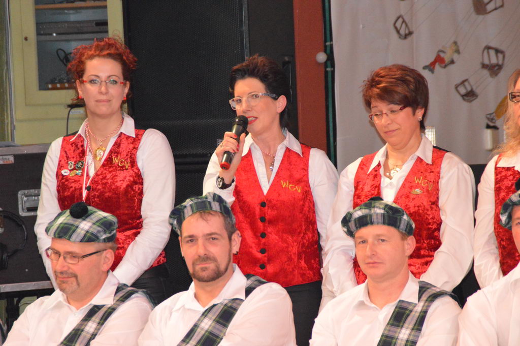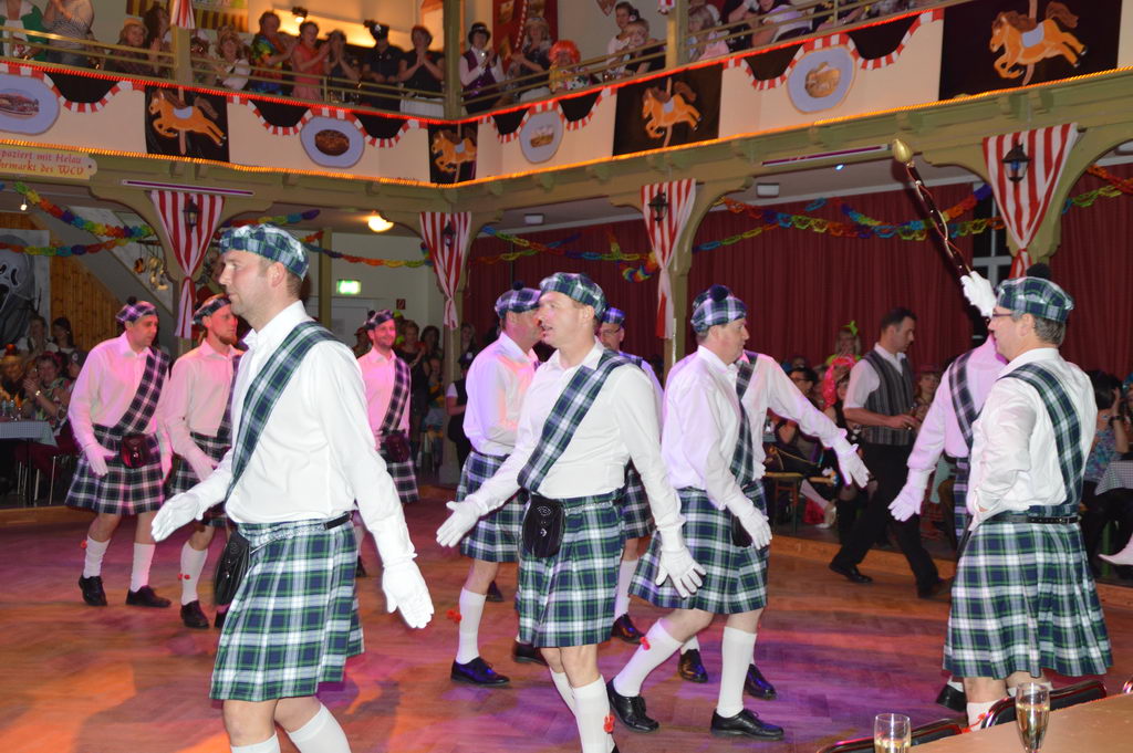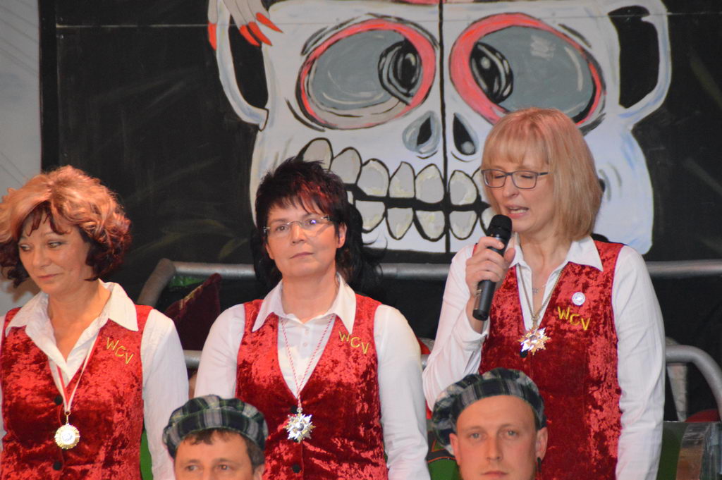 Nachdem die ankommenden 'Weiber' mit einem Gläschen Sekt von den Männern der Funkengarde in ihren Schottenröcken empfangen wurden, eröffnete genau diese Funkengarde mit ihrem Marsch den 12. Weiberfasching des WCV. Nach der Befrüßung durch Karina Baronius zogen der weibliche Elferrat und das Prinzenpaar in den Sall ein. Unser Prinzenpaar mit vertauschten Rollen wurden als