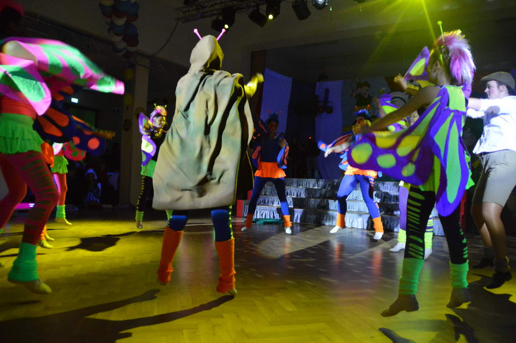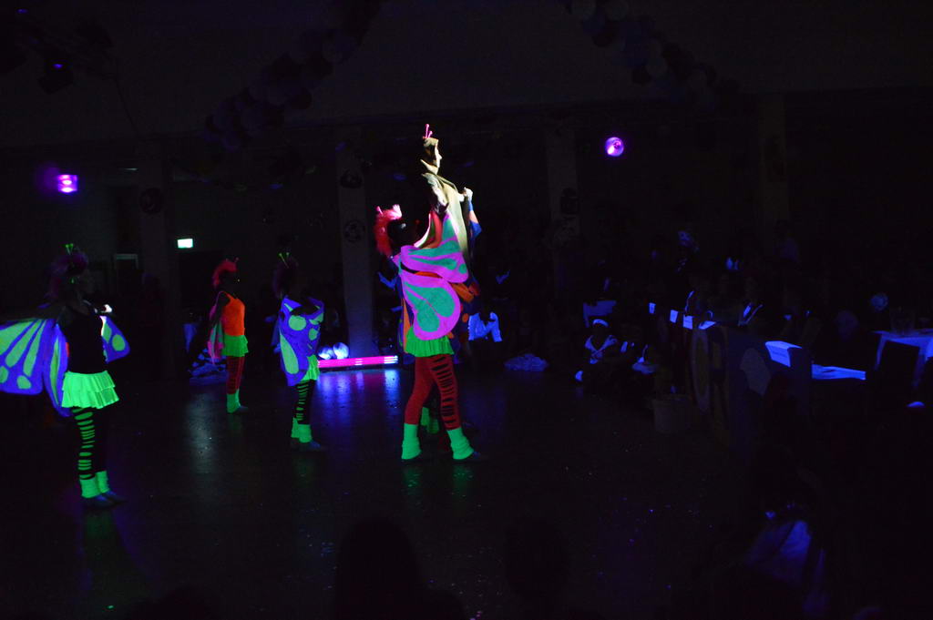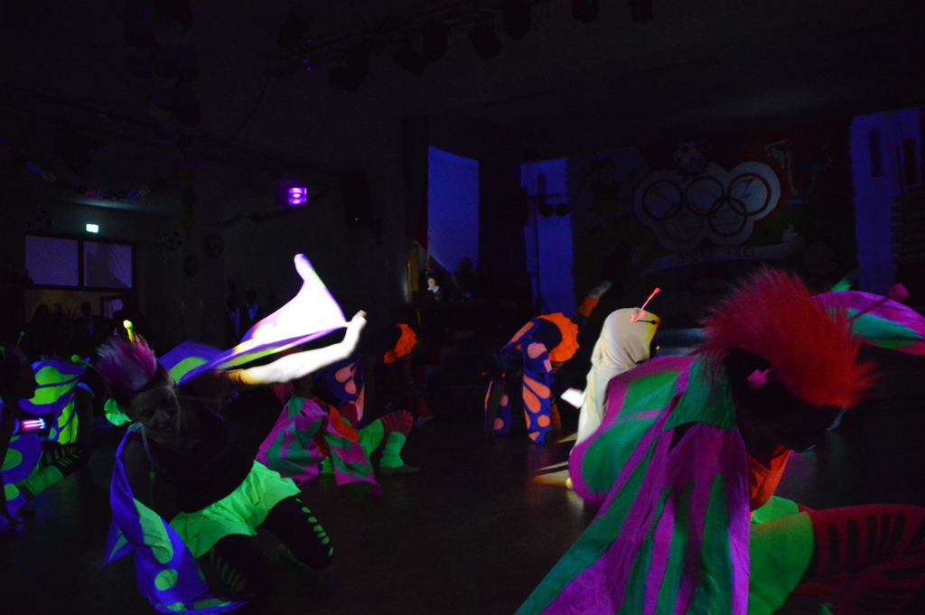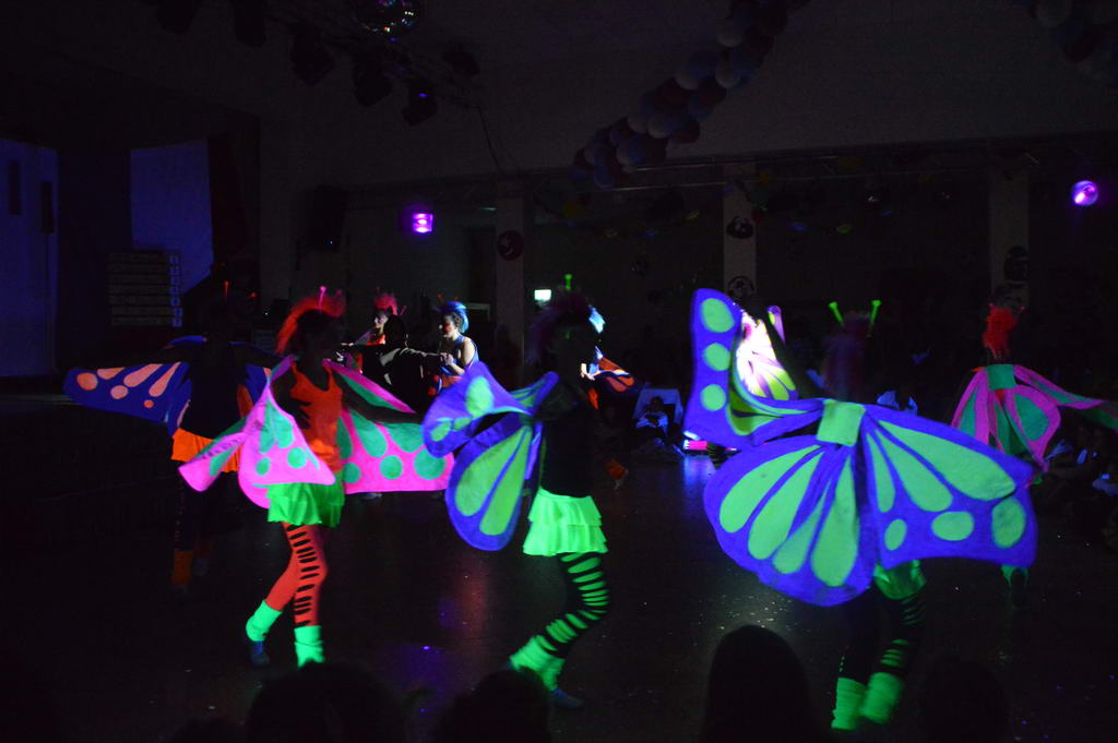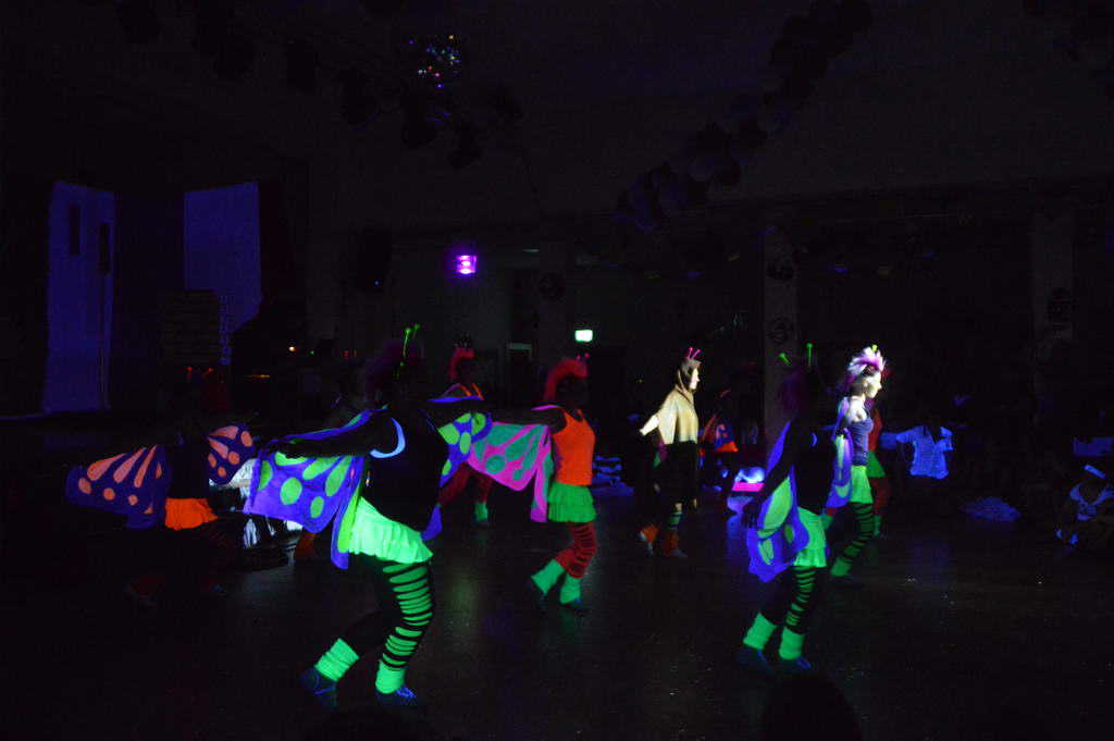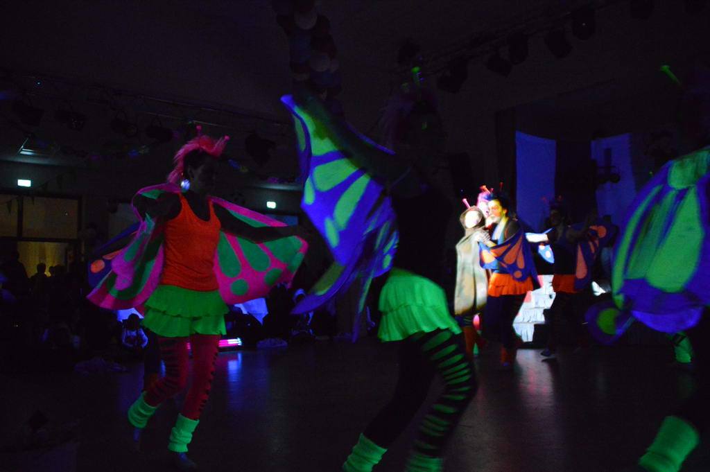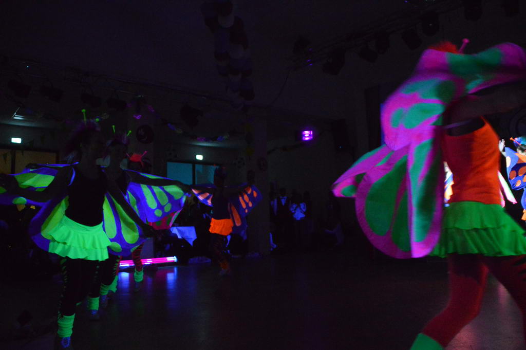 Vor dem Start unserer Mädchen wurde im Saal extra noch zusätzliche Schwarzlicht-Strahler aufgebaut. Der durchs Programm Führende bemerkte dazu, dass unser Schwarzlicht wahrscheinlich dunkler ist als das, welches im Bürgerhaus installiert ist. Aber unabhängig davon war es einfach wichtig, dass der Wow-Effekt beim "Schlüpfen" der Schmetterlinge auch so richtig zur Geltung kommt.