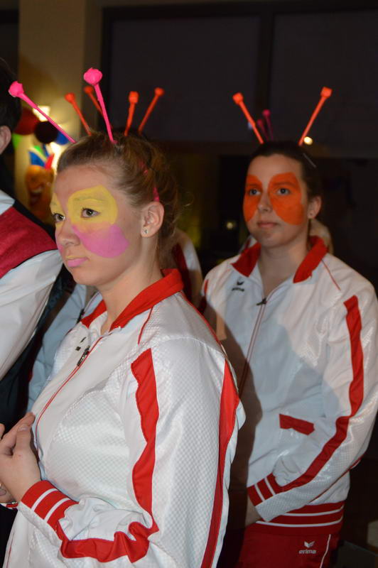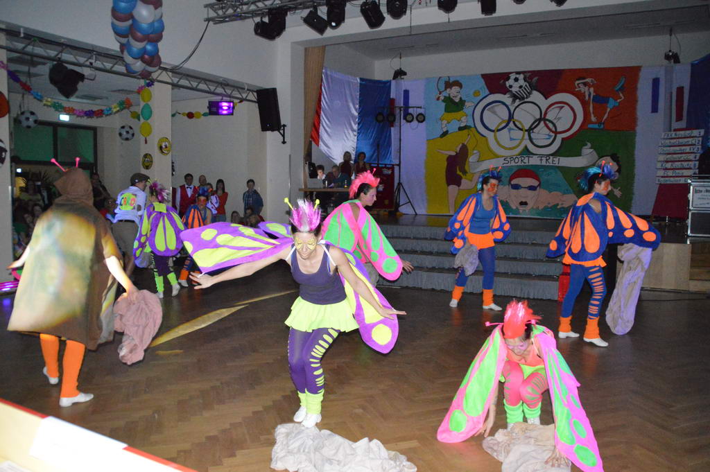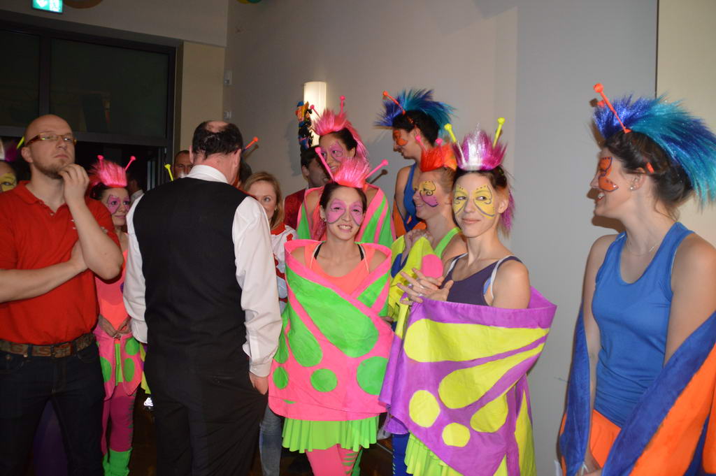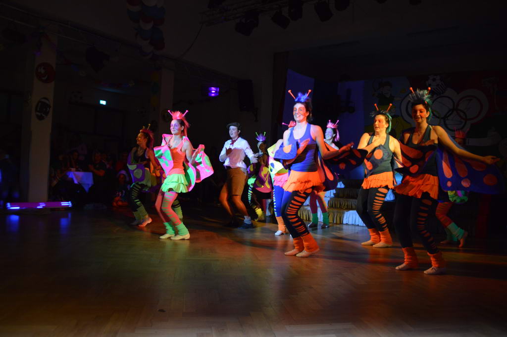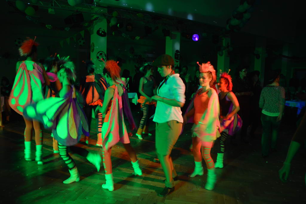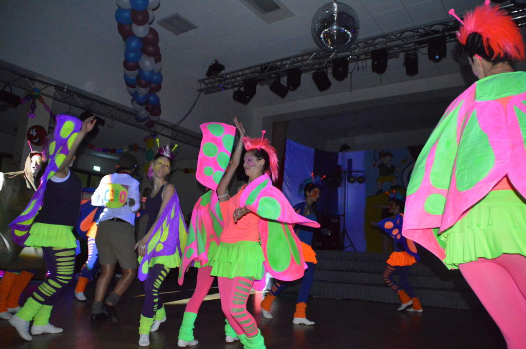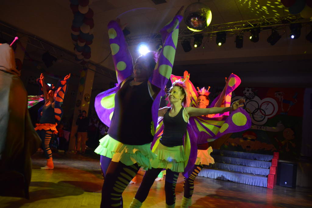 Vor dem Start unserer Mädchen wurde im Saal extra noch zusätzliche Schwarzlicht-Strahler aufgebaut. Der durchs Programm Führende bemerkte dazu, dass unser Schwarzlicht wahrscheinlich dunkler ist als das, welches im Bürgerhaus installiert ist. Aber unabhängig davon war es einfach wichtig, dass der Wow-Effekt beim "Schlüpfen" der Schmetterlinge auch so richtig zur Geltung kommt.