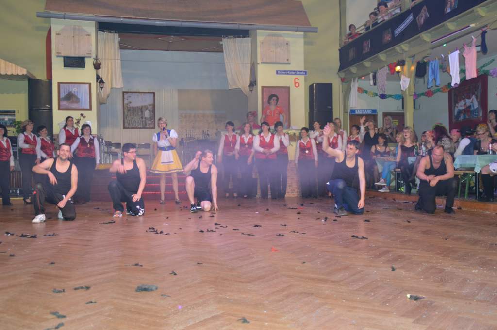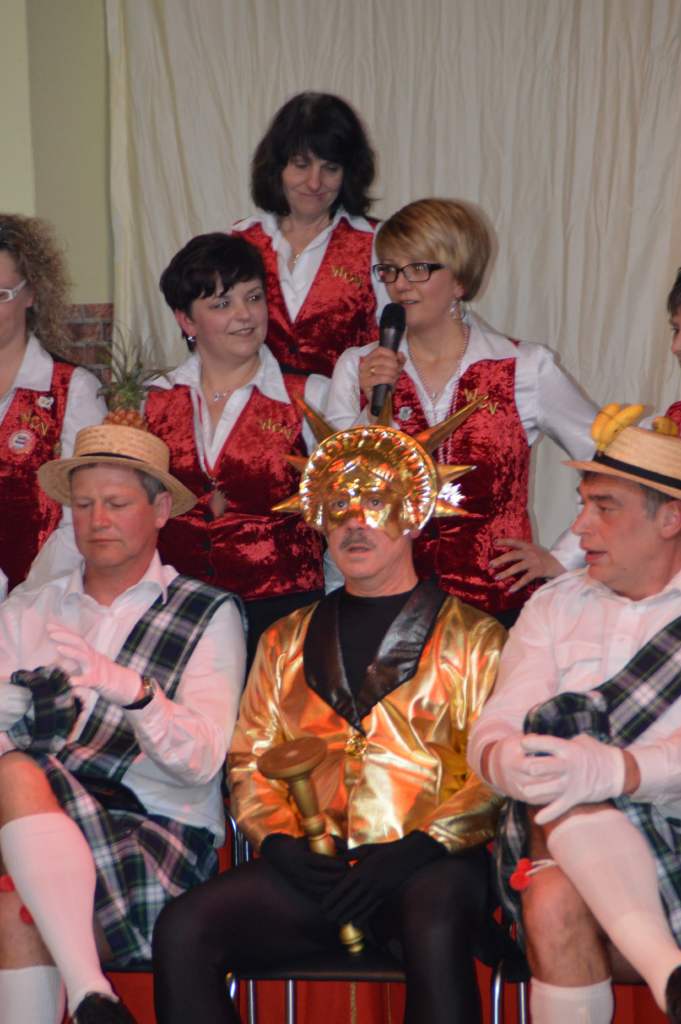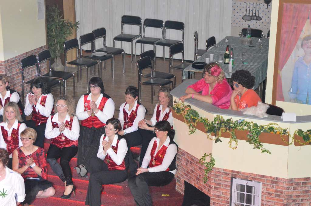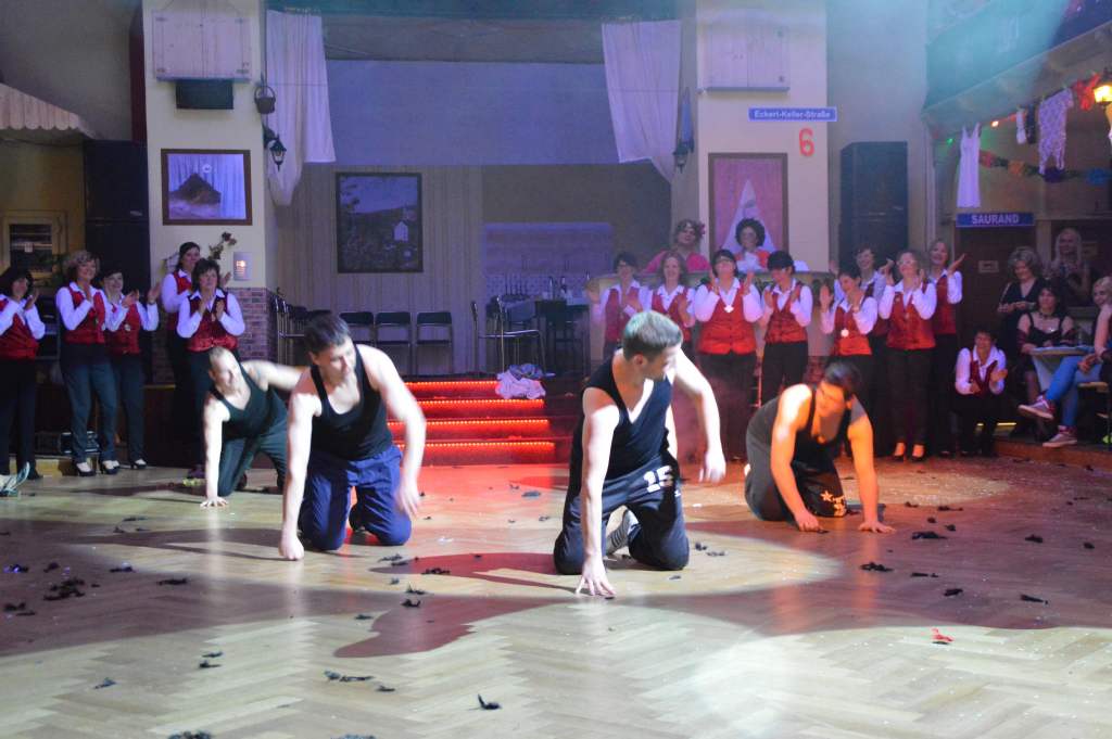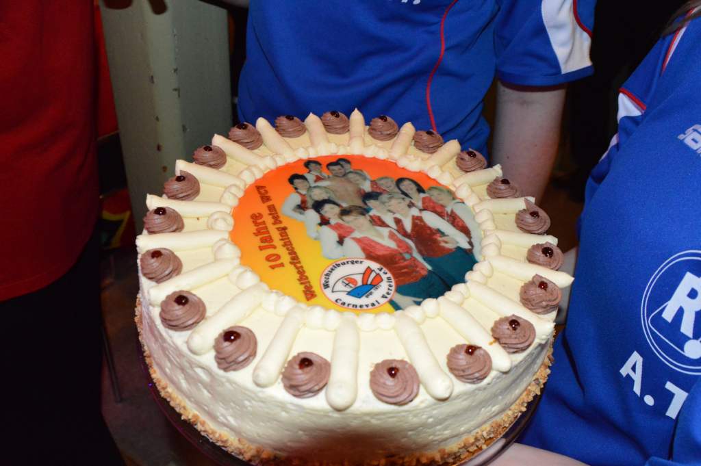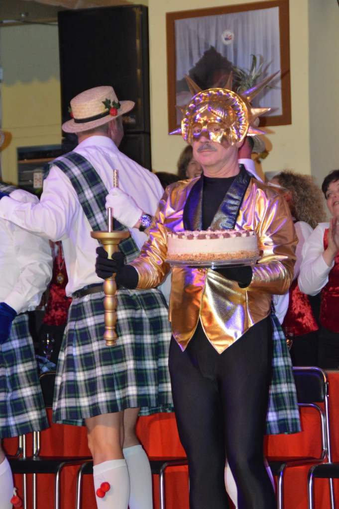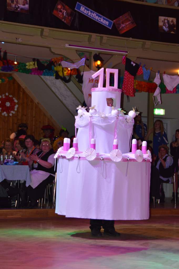 Nachdem sich die wenigen im Saal als Akteure anwesenden Männer nun bereits zehn Mal die mehr oder weniger männerfeindlichen Sprüche anhören mussten, wurde nun erstmals zurück "geschossen" anstatt mit ihrem Gardetanz zu beginnen, gab es erst einmal zwölf Sprüche zum "Gegenhalten" von den Männern. Doch sie machten es mit ihrem Gardetanz auch gleich wieder gut. Nach den Klängen zu "Aber bitte mit Sahne" überbrachten sie zuerst eine symbolische und dann eine tatsächliche Geburtstagstorte für die Frauen des WCV.