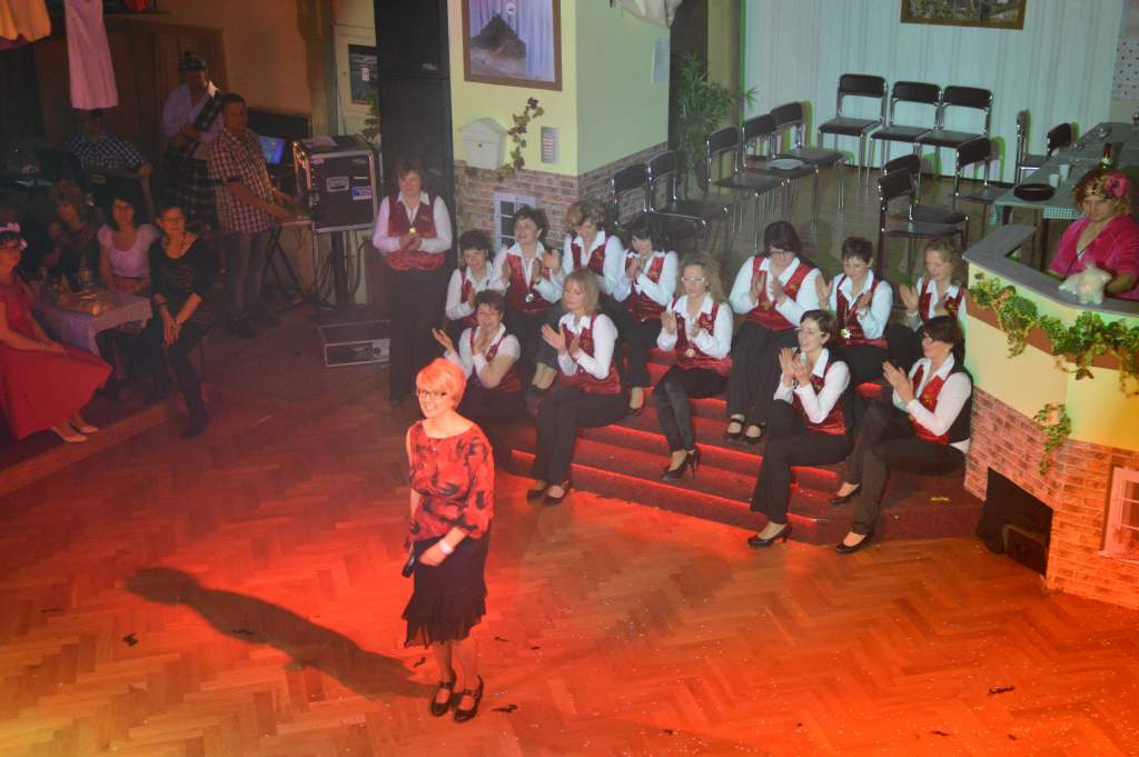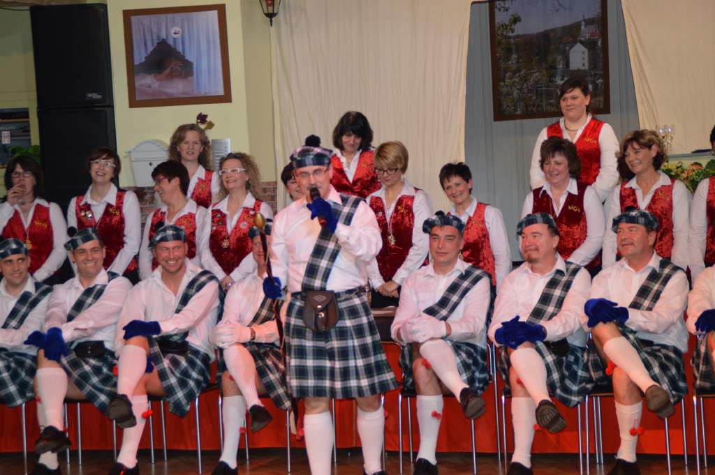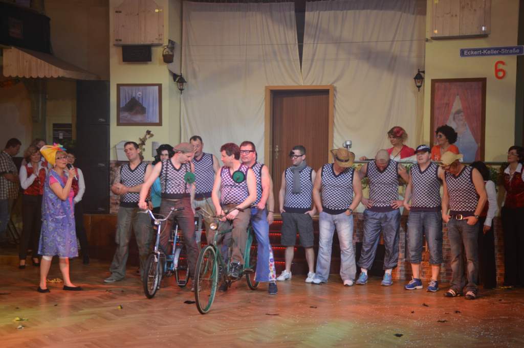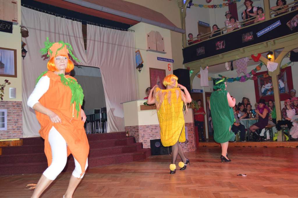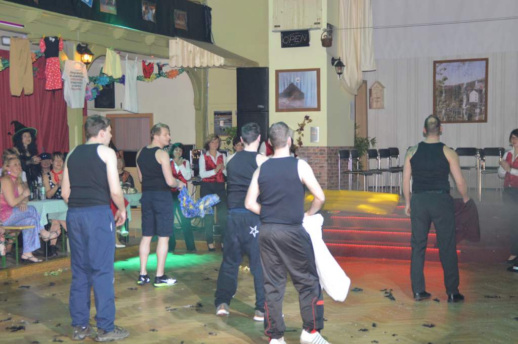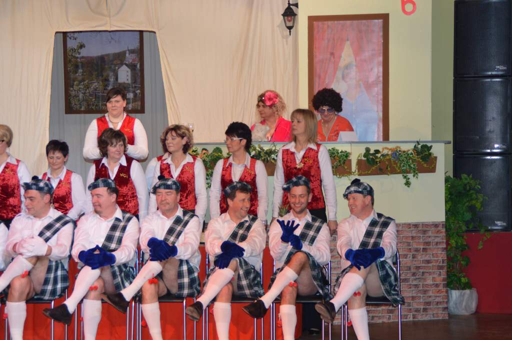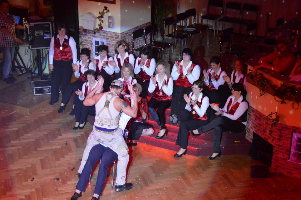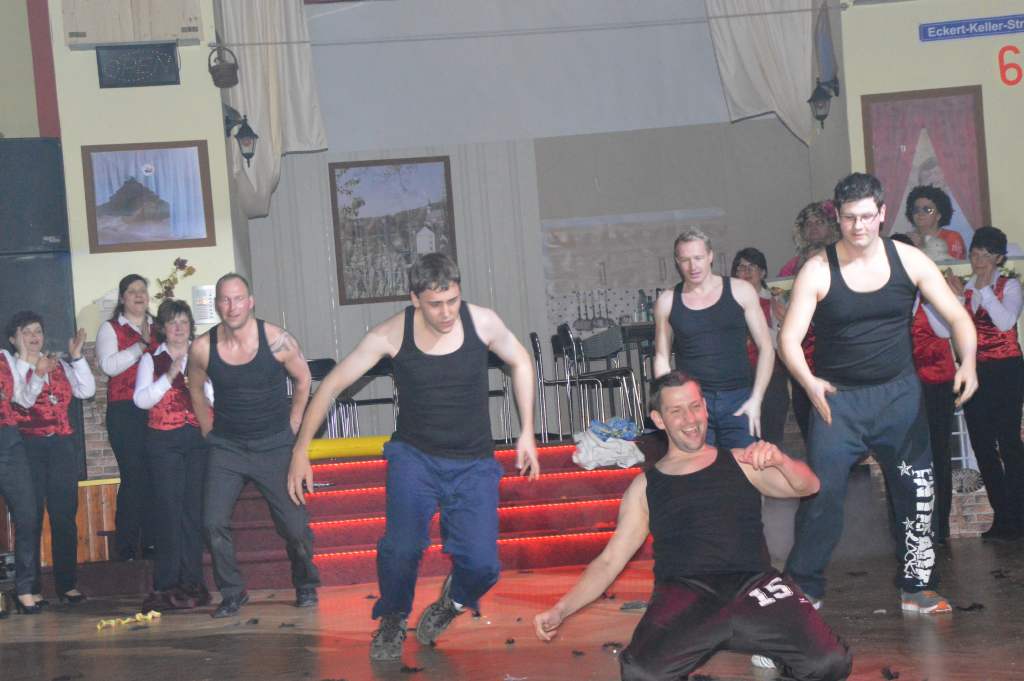 Nachdem sich die wenigen im Saal als Akteure anwesenden Männer nun bereits zehn Mal die mehr oder weniger männerfeindlichen Sprüche anhören mussten, wurde nun erstmals zurück "geschossen" anstatt mit ihrem Gardetanz zu beginnen, gab es erst einmal zwölf Sprüche zum "Gegenhalten" von den Männern. Doch sie machten es mit ihrem Gardetanz auch gleich wieder gut. Nach den Klängen zu "Aber bitte mit Sahne" überbrachten sie zuerst eine symbolische und dann eine tatsächliche Geburtstagstorte für die Frauen des WCV.