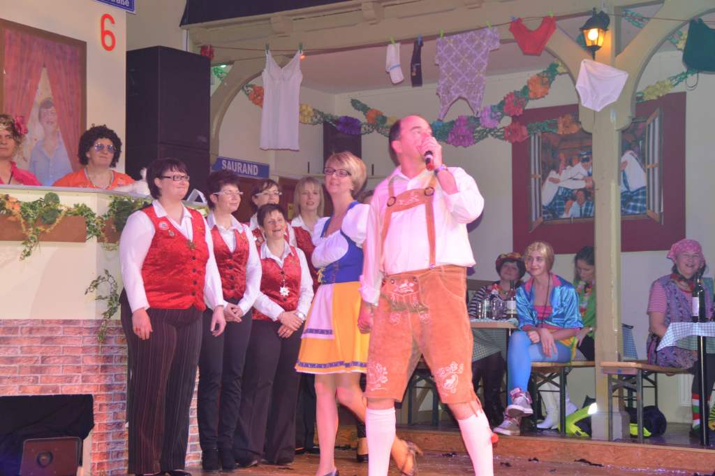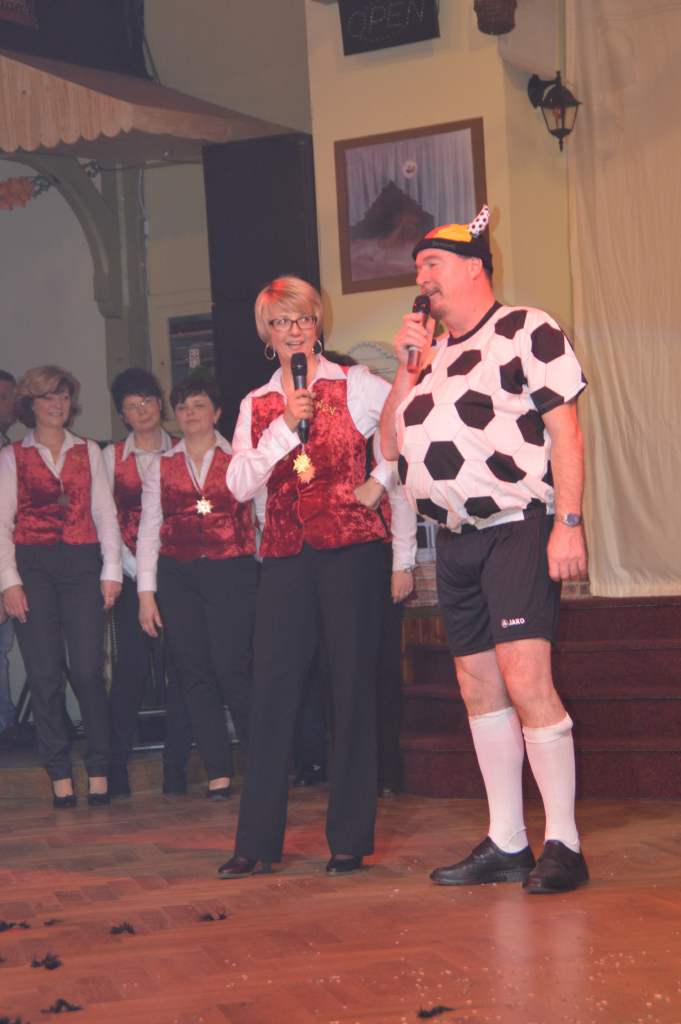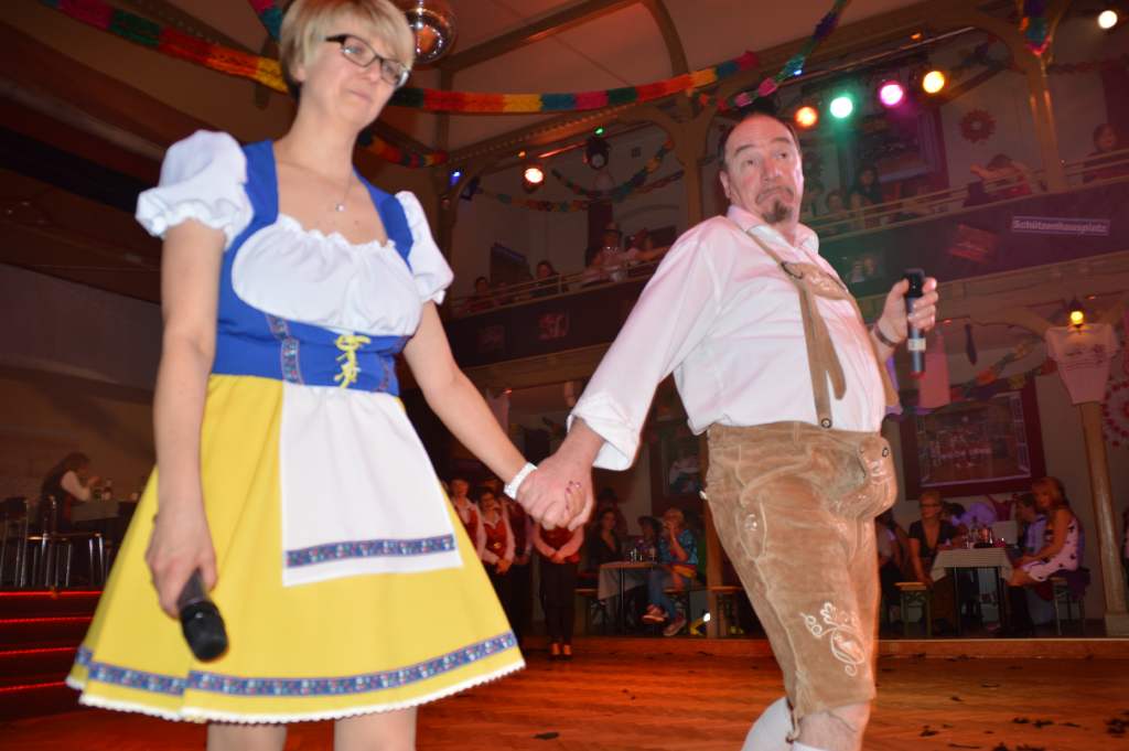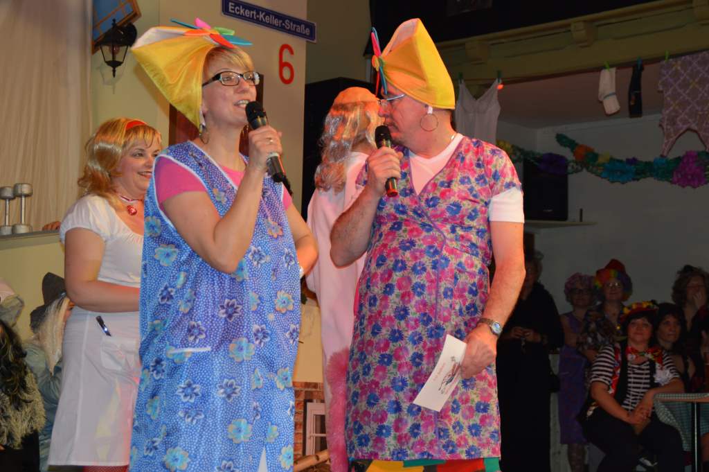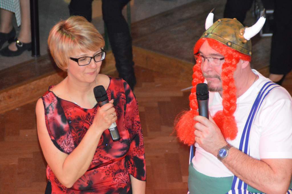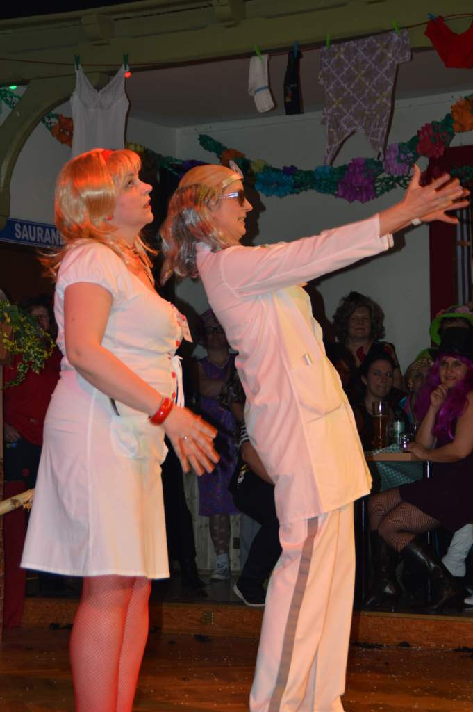 Durch das anschließende Programm des 10. Weiberfaschings führten Karina Baronius und Udo Modes. Diese Beiden hatten eigentlich den stressigsten Job des Abends. Denn zu jedem Programmteil zogen sie sich passend um. Und da war nicht wirklich viel Zeit dazu.