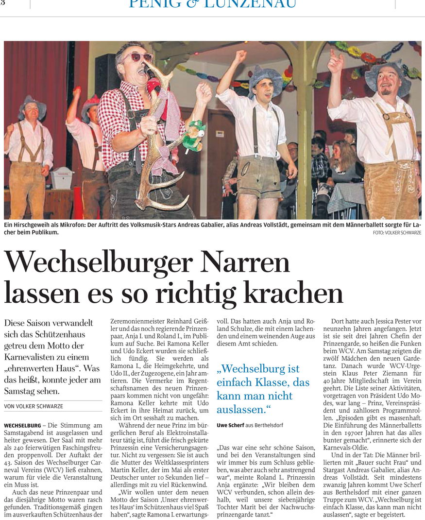 Pünktlich 19 Uhr 11 marschierte die Funkengarde des WCV ins Schützenhaus und eröffnete damit die erste der beiden Auftaktveranstaltungen der 43. Saison des Wechselburger Carneval Verein. In ihrem Spalier zogen der Elferrat und das Prinzenpaar der vergangenen Saison, Prinz Roland und Prinzessin Anja, in den Saal ein. Angeführt wurden sie vom Zeremonienmeister und der Vereinsfahne. Vervollständigt wurde dieses Ensemble durch die Kinderfunkengarde. Eines der jüngsten Mitglieder dieser Garde ist Marit Schulze, die Tochter des (noch) Prinzenpaares.
