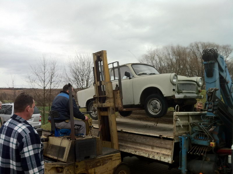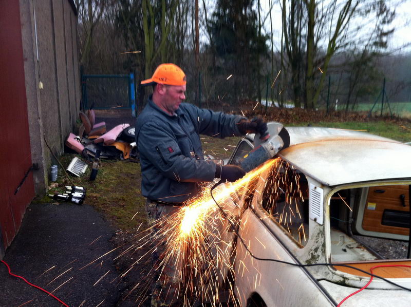 Nachdem die Idee einmal geboren war (wir bauen auf de rBühne aus einem PKW-Vorderteil eine Prinzenloge) ging es an die Suche eines möglichen PKW. Am Ende standen zwei mögliche Fahrzeuge zur Auswahl. Die Wahl fiel dann auf eien Trabent, der uns freundlicherweise vom Autohaus Sturne in Rochlitz zur Verfügung gestellt wurde. Der Trabi hatte den großen Vorteil, dass wir das Vorderteil ohne zerlegen, oder ohne Umbau an Türen oder Fenstern im Schützenhaus auch in den Saal bekommen. Fast jedes andere Auto wäre für die örtlichen Begebenheiten zu groß gewesen.