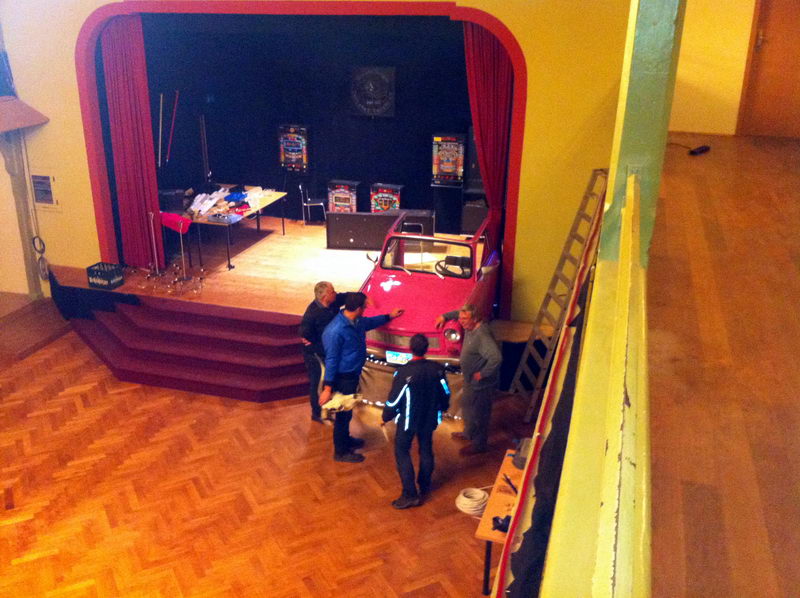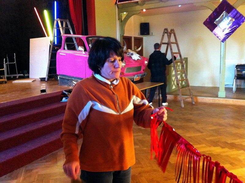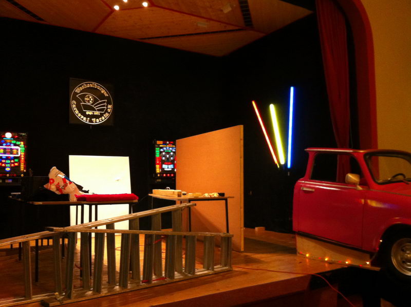 Parallel dazu wurde von Sibyll Listner die Dekoration des Saales und von der "Gruppe Bühne" - die eigentlich identisch mit dem "Trabi-Team" ist - die Gestaltung der Bühne vorbereitet. Der Saal sollte ja ein großes Casino in Las Vegas werden. David Meliczek hatte extra für die Bühne vier ausrangierte Spielautomaten besorgt, so dass die Bühne sich tatsächlich in eine Spielhölle verwandelte.