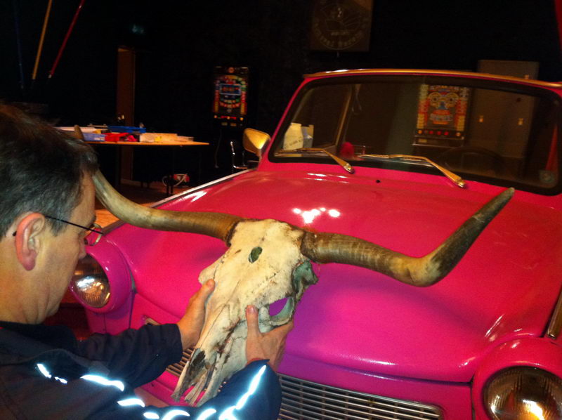 Nach dem Abholen vom Autohaus Sturne wurden auf dem Firmengelände von Stefan Theuer der Trabi ausgeweidet und (seit vielen Jahren) einer ersten Grundwäsche unterzogen. Danach wurde er ins Schützenhaus transportiert. Hochkant von vier Mann getragen, passte er gerade so durch die Türen des Schützenhauses. Hier ging es erst einmal an die farbliche Gestaltung. Pink sollte es werden. - Das war der Wunsch von Prinz Rudi. auch wenn dies farblich wohl nicht ganz zum Kostüm der Prinzessin passt. Aber hier konnten wir keine Rücksicht nehmen. Frisch gestrichen wurde er dann auf sein neu gebautes Podest gehoben und entsprechend schick hergerichtet. Bis fast zum letzten Tag wurden am Trabi noch An- und Umbauten vorgenommen. Sei es die wieder-Inbetriebnahme der Beleuchtungsanlage. der Einbau einer Nebelmaschine oder das Anbringen von roten Augen am Bullenschädel.