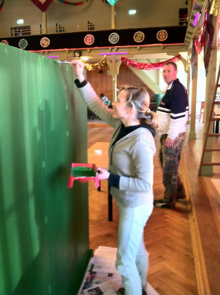 An den zwei Aufbauwochenenden wurden von vielen fleißigen Helfern des Vereines die vorbereiteten Dekomaterialien, Girlanden und ähnliches an die Wände und Decken gepappt und der Saal gesäubert. Außerdem wurden noch die notwendigen Requisiten für die einzelnen Auftritte angefertigt.