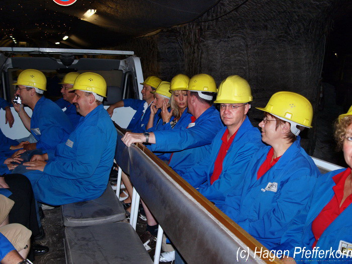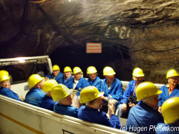 Im Erlebnisbergwerk ging es dann erst einmal an's Umkleiden. Denn Sicherheitskleidung (blauer Kittel und gelber Helm waren angesagt - wahrscheinlich gesponsort von Lok Leipzig) war angesagt. Die ca. halbstündige Wartezeit wurde mit allerlei Gequatsche verbracht. Man musste ja Einige davon ablenken, dass es gleich in einem engen Transportkorb für knapp 700 Meter hinab in den Bauch von Mutter Erde gehen sollte. So nebenbei wurde auch ein Gruppenfoto gemacht. Man wusste ja nicht, wer von den Anwesenden sich zwei Stunden später wieder an der Erdoberfläche zurückmelden würde. Dann ging es endlich los. Immer ca. 15 Personen quetschten sich in einen engen Förderkorb - und ab ging es in die Tiefe. Schon die Größe der Halle, die wir dort unten aus dem Förderkorb betraten, war gigantisch. Aufgeteilt auf insgesamt vier LKW's (es waren mehrere Gruppen, die das Wagnis "Bergwerk" auf sich genommen hatten) ging es dann los mit der Untertagetour. Und diese Fahrt war hammerhart. Laut Prospekt wird nur mit maximal 25 km/h gefahren. Unser Führer sprach von maximal 40 km/h. Doch wahrscheinlich sind wir zeitweilig um einiges schneller unterwegs gewesen (gefühlte 60 - 79 km/h). Und das alles in engen Tunnelröhren mit engen - zum Teil 120 Grad - Kurven. Und immer schön bergauf und bergab. Unser Führer sagte dazu "alle, die hier unten fahren, haben oben keinen Führerschein". Zwischendurch gab es eine Vorführung eines 10-Tonnen-Radladers. Auch die Vorbeifahrt an hunderten alten Fahrzeugen ("Fahrzeugfriedhof") war beeindruckend. Aber das alles war noch gar nichts gegen den riesigen Konzertsaal in 700 Meter Tiefe. Dieser hat Platz für 350 Besucher und hat eine Superakustik. Aus einer der mit in die Tiefe gefahrenen Gruppen hatte sich eine junge Frau spontan bereit erklärt, uns ein Stück auf dem Klavier darzubieten. Der Klang war super (und ihr Mut, das überhaupt zu machen, war es auch). Seit wenigen Jahren gibt es dort unten sogar eine Zweibahnen-Kegelanlage. Das wäre sicher auch mal was besonderes: Eine Trainingsveranstaltung unserer Vereinskegler in Vorbereitung auf den nächsten Wagner-Bau-Pokal in 700 Meter Tiefe. Da müssen wir halt mal mit unserem Schatzmeister sprechen. Nach der Besichtigung des Festsaales (hier könnte König Artus Tafelrunde stattgefunden haben) ging es dann endlich wieder in Richtung Erdoberfläche. Obwohl uns vorher freundlicherweise mitgeteilt wurde, dass 10 Prozent Verluste normal und eingeplant sind, haben es zumindest dieses Mal alle wieder zurück nach oben geschafft.