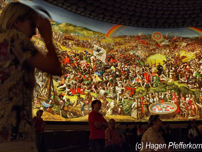 Nach einer kleinen Stärkung (manche sagen Mittagessen dazu) ging es dann los in Richtung Bad Frankenhausen. Unser Ziel: das größte WC der Welt, das "Elefantenklo" von Bad F. Humorlose sagen auch Bauernkriegspanorama dazu. Auf dem Weg dorthin ging es vorbei an den Häusern der Stadt Bad Frankenhausen. Beeindruckend war dort die Ansicht des Kirchturmes. Dieser hat - auf Grund des jahrhunderte langen Bergbaues in der Region eine Neigung, die größer ist als die des schiefen Turmes zu Pisa. Das Bauernkriegspanorama von Werner Tübke selbst war - zumindest für mich - eine Enttäuschung. Ich hatte es bisher noch nie gesehen. Doch sowohl die Bekanntmachungen zur Zeit der Eröffnung (Ende der 80er Jahre) als auch als auch meine Vorstellung über den Bauernkrieg an sich hatten dazu geführt, dass sich mit Vorstellungen in diese Ausstellung gegangen bin, die völlig über den Haufen geworfen wurden, als ich in den Saal der Ausstellung kam. Mit Bauernkrieg (oder dem, was ich mir unter diesem Thema vorgestellt habe) hatte das nur wenig zu tun. Aber - wie gesagt - dies ist meine persönliche Meinung. Und ich bin mit Sicherheit kein Experte, was bildnerische Kunst betrifft. Deshalb: nehmt mir diese Meinung nicht übel.