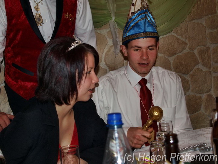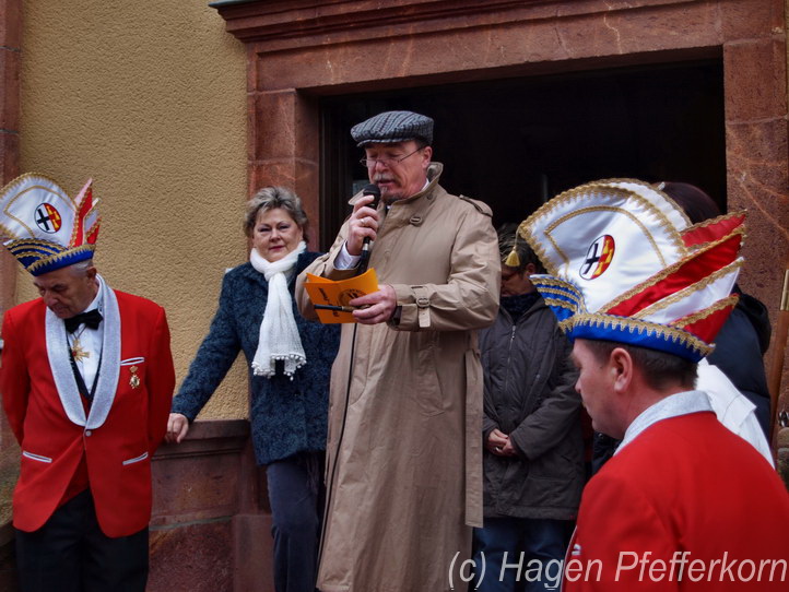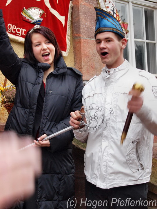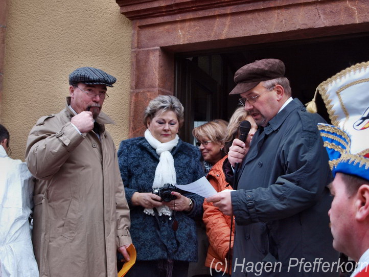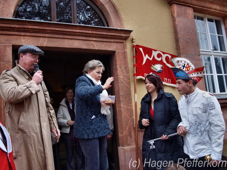 Nach dem offiziellen Teil der Schlüsselübergabe an das noch amtierende Prinzenpaar - Katja Pfefferkorn und Steve Goldammer - ging es dann hinein in das Rathaus, in den festlich geschmückten Ratssaal. Dort wurde die erste öffentliche Gemeinderratssitzung der fünften Jahreszeit der 39. Saison des WCV abgehalten. Dieser Teil wurde traditionell überwiegend von den Mitarbeiterinnen der Gemeindeverwaltung (Männer der Gemeindeverwaltung waren leider nicht anwesend) und der Bürgermeisterin, Frau Renate Naumann, gestaltet.
