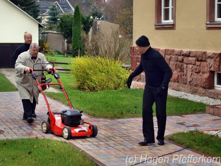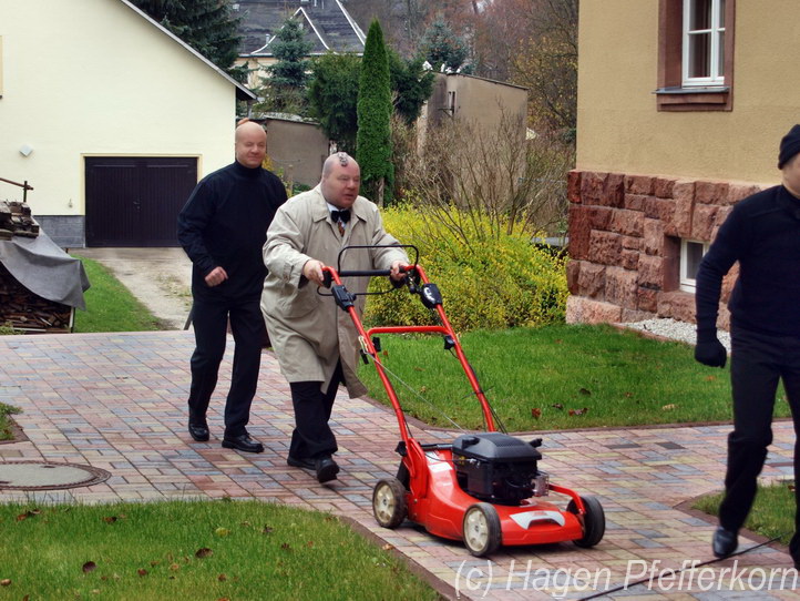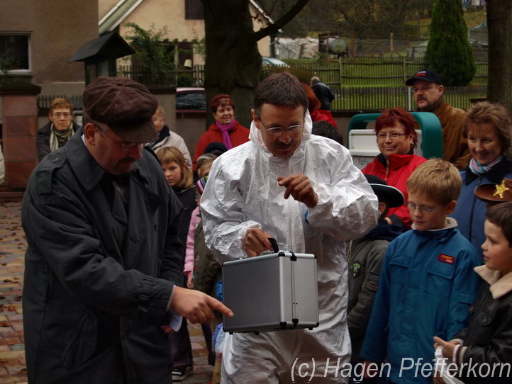 Vor dem Rathaus nahm Kriminalkommissar Udo Modes erst einmal die Fäden in die Hand. Denn in der jüngsten Vergangenheit wurde Wechselburg mehrfach von Kriminellen heimgesucht. Das musste natürlich erst einmal aufgeklärt werden. Da mussten Fußspuren gesichert werden, DNA-Proben von den Mitarbeitern der Gemeindeverwaltung genommen werden und und und ... Es war ja bekannt, dass der Bauhof der Gemeinde von dreisten Dieben heimgesucht wurde. doch dass diese es sich - in Form der Olsenbande - erdreisteten, vor den versammelten anwesenden Besuchern der Veranstaltung gleich noch einmal versuchten, Rasenmäher und Kettensäge der Gemeinde zu stehlen, dass war schon erstaunlich. Leider konnten weder der anwesende Abschnittsbevollmächtigte Ingo L. noch die aufmerksamen Kinder verhindern, dass die Diebesbande fast unbemerkt von dannen ziehen konnte.