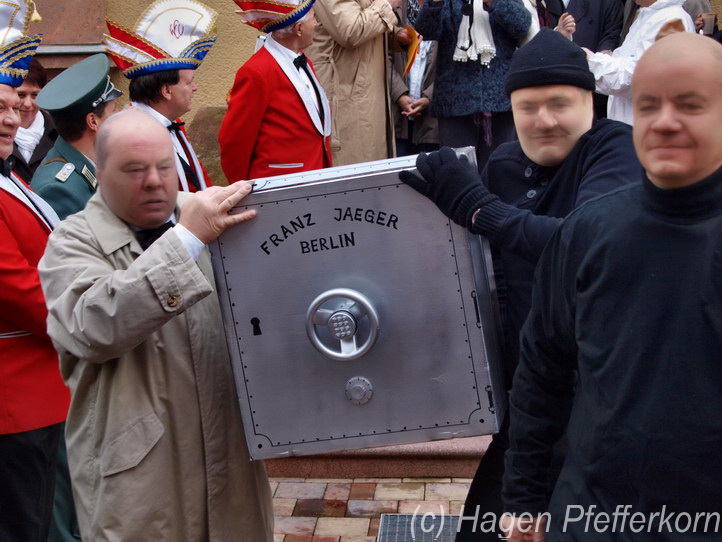 Inzwischen ging die Untersuchung des Tatortes durch das Spezialisten-Team der SOKO „Wechselburg“ weiter, doch auch die Spurensicherung kam nicht so richtig weiter. Man hatte schon fast den Eindruck, die Gemeindeverwaltung hätte aus den vergangenen Vorfällen eine Lehre gezogen und entsprechende Sicherungsmaßnahmen eingeleitet. Denn plötzlich trugen drei Herren in korrekter schwarzer Kleidung (Sven B., Reiner T und HagenP.) eine Tresor der bekannten Marke "Franz Jäger" aus dem Rathaus. Aber wieso AUS dem Rathaus? Glücklicherweise bekam der Kriminalinspektor Udo M. noch rechtzeitig mit, dass dies die falsche Richtung war. Normalerweise hätte der Tresor ja IN und nicht AUS dem Rathaus getragen werden dürfen. Er konnte die anwesenden Kinder der Wechselburger Grundschule gerade noch dazu auffordern, die Täter der Wechselburger Olsenbande an der Flucht zu hindern. Glücklicherweise - für die Kinder - bestand der Inhalt des Tresores nur aus Süßigkeiten.