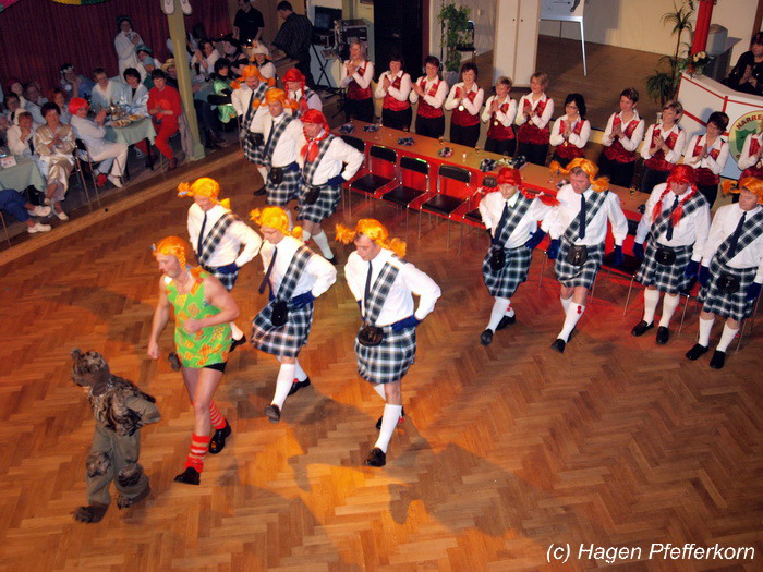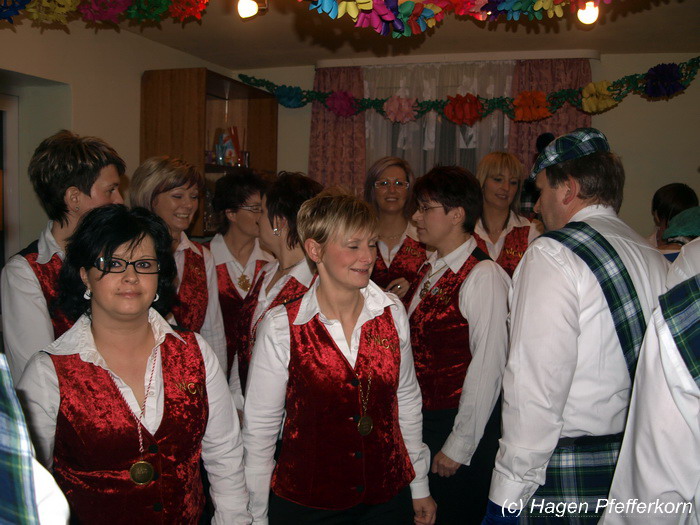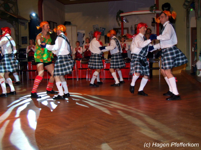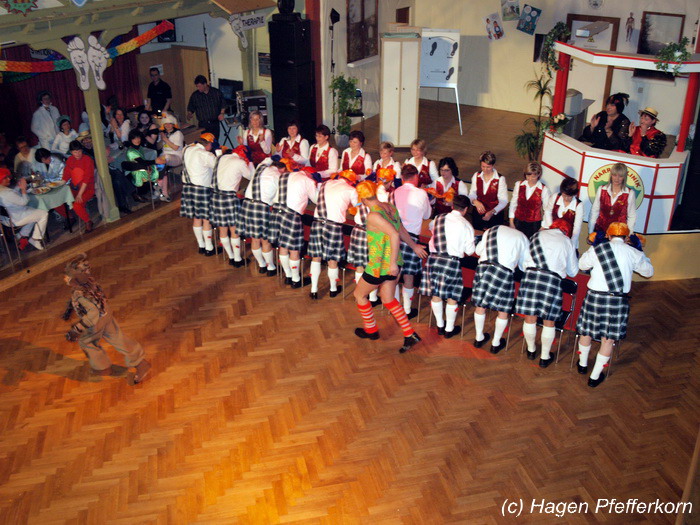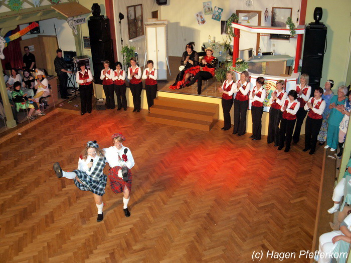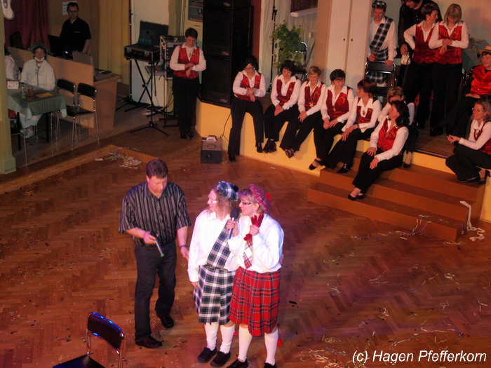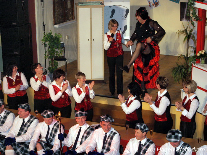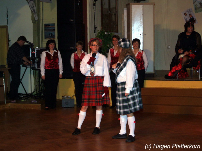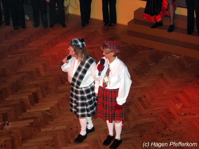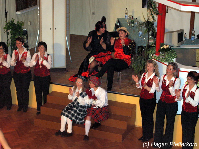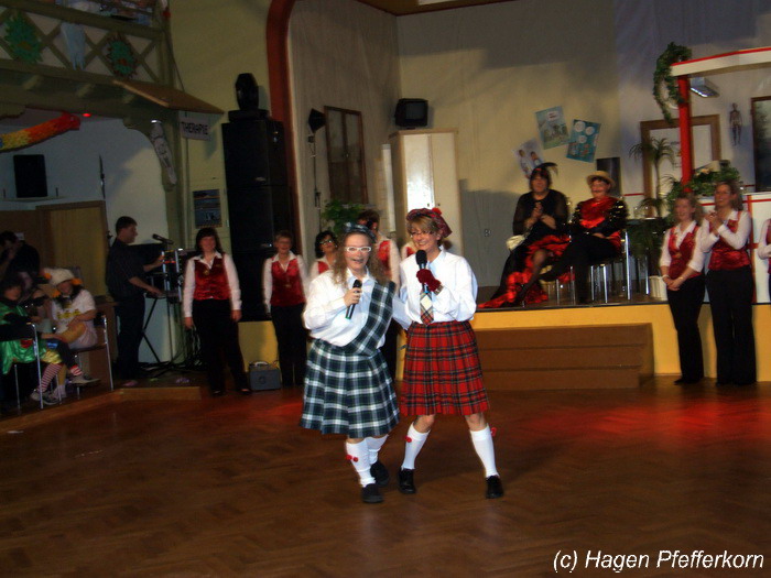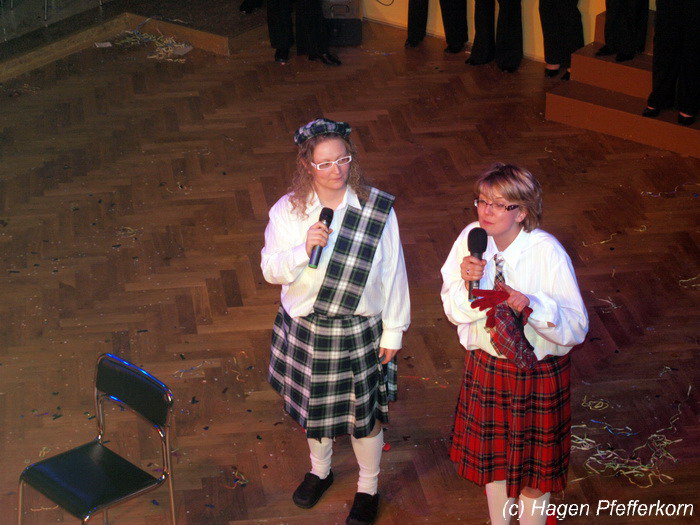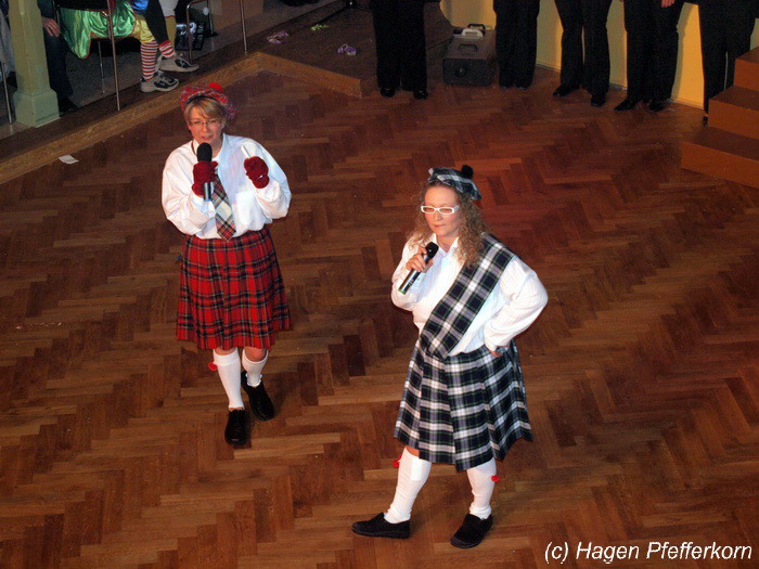Nach einer Pause, in der die Närrinnen fleißg das Tanzbein schwungen, kamen nach der Ankündigungsmelodie "Schnee, Berge, eine Hütte..."der nächste Programmteil. Durch den Abend führten dieses Jahr Karina Baronius und Mandy Schlimper - sie kamen als Schotten verkleidet. Der erste Beitrag war ein Auftritt der "richtigen" Prinzengarde mit einem Tanz nach dem Titel "Da simmer dabei" von "De Höhner". Das Beeindruckenste für die Eingeweihten war dabei, das dieser Tanz ja bereits vor vier Jahren einmal getanzt wurde. Allerdings sind aus der damaligen Formation nur noch drei Tänzerinnen aktiv bei der Garde dabei bzw. konnten an diesem Donnerstag auch an der Veranstaltung teilnehmen. Also musste mit dem größten Teil der Gardemädchen dieser Tanz zum Teil parallel zu den normalen Vorbereitungen auf die Faschingsveranstaltungen neu einstudiert werden. Aber das Ergebnis konnte sich sehen lasssen, was man am kräftigen Beifall der Närrinnen spüren konnte.
