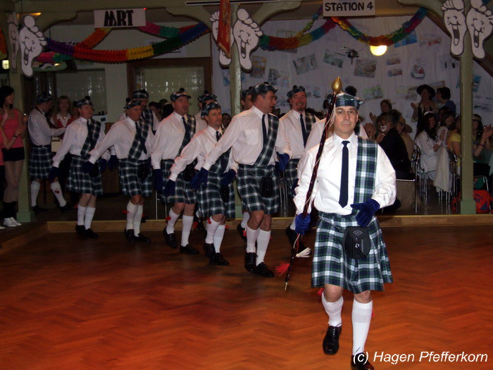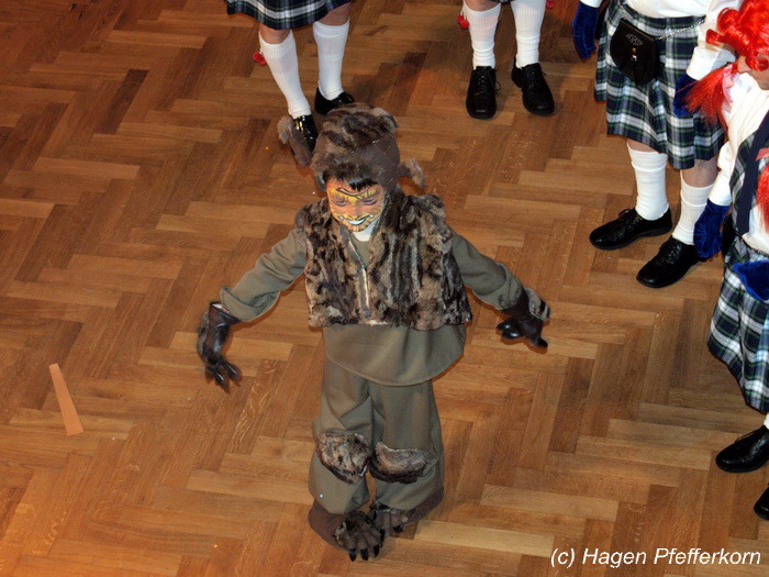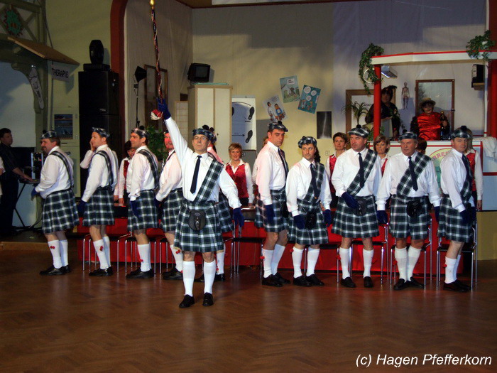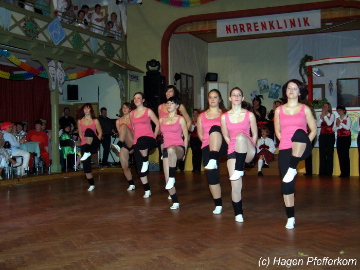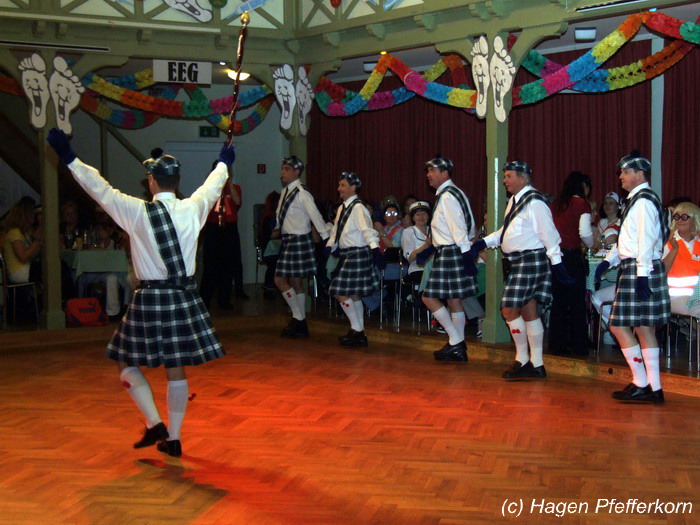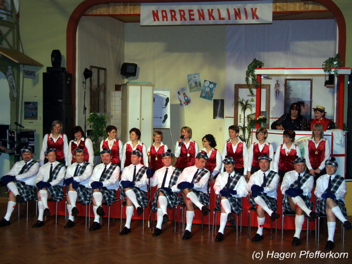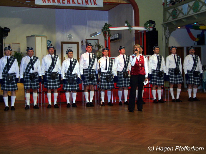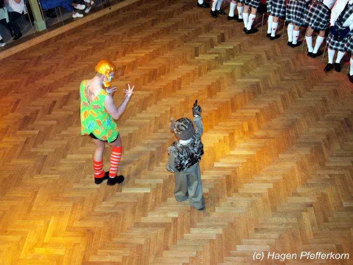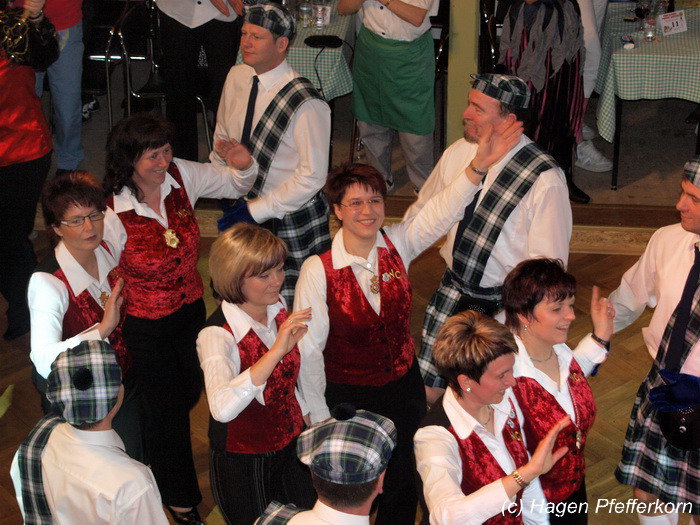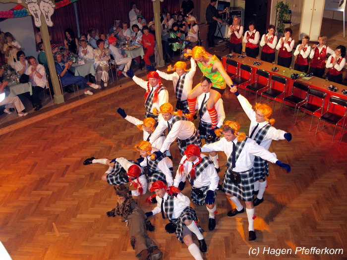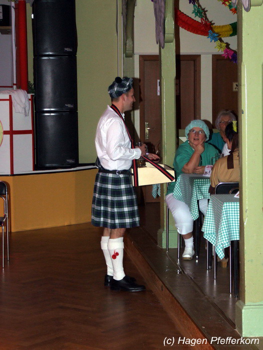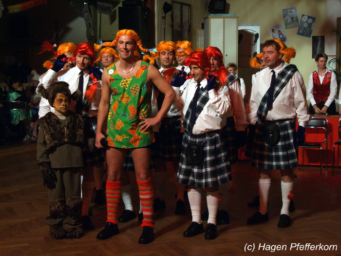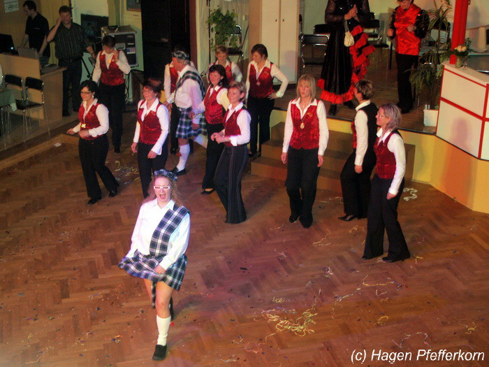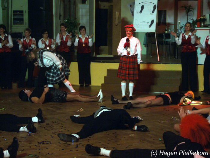 Nach einer Pause, in der die Närrinnen fleißg das Tanzbein schwungen, kamen nach der Ankündigungsmelodie "Schnee, Berge, eine Hütte..."der nächste Programmteil. Durch den Abend führten dieses Jahr Karina Baronius und Mandy Schlimper - sie kamen als Schotten verkleidet. Der erste Beitrag war ein Auftritt der "richtigen" Prinzengarde mit einem Tanz nach dem Titel "Da simmer dabei" von "De Höhner". Das Beeindruckenste für die Eingeweihten war dabei, das dieser Tanz ja bereits vor vier Jahren einmal getanzt wurde. Allerdings sind aus der damaligen Formation nur noch drei Tänzerinnen aktiv bei der Garde dabei bzw. konnten an diesem Donnerstag auch an der Veranstaltung teilnehmen. Also musste mit dem größten Teil der Gardemädchen dieser Tanz zum Teil parallel zu den normalen Vorbereitungen auf die Faschingsveranstaltungen neu einstudiert werden. Aber das Ergebnis konnte sich sehen lasssen, was man am kräftigen Beifall der Närrinnen spüren konnte.