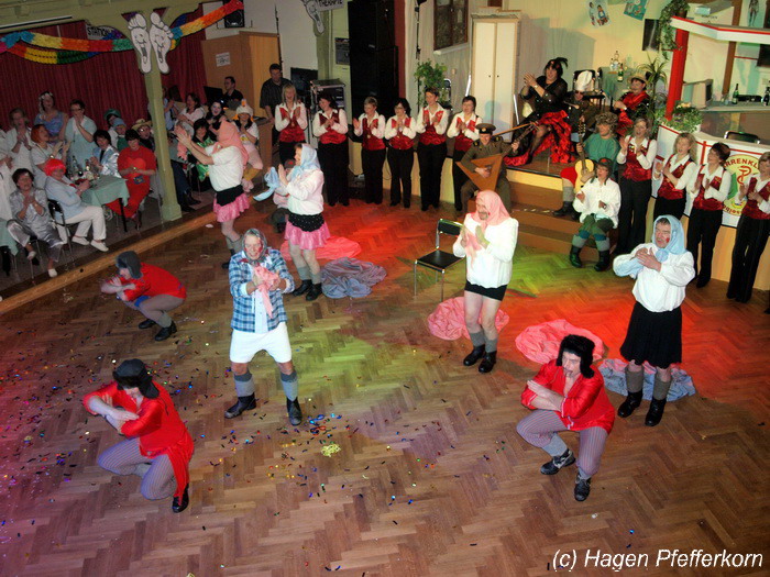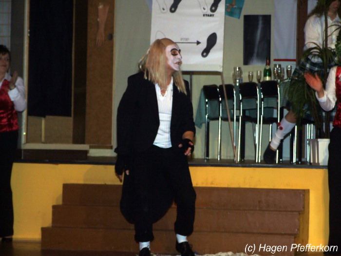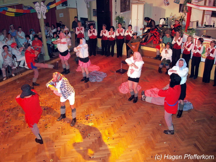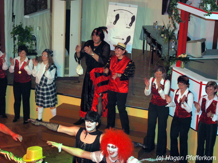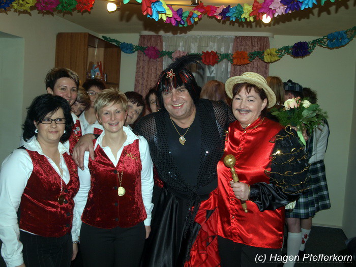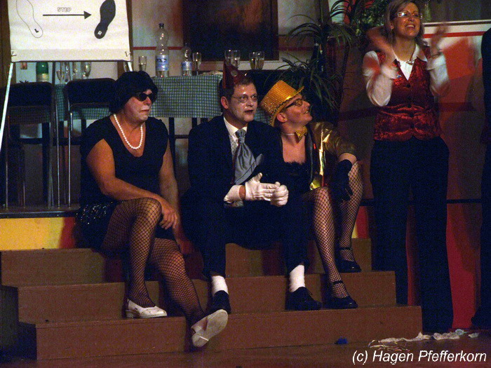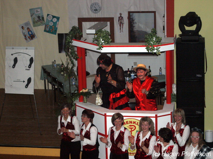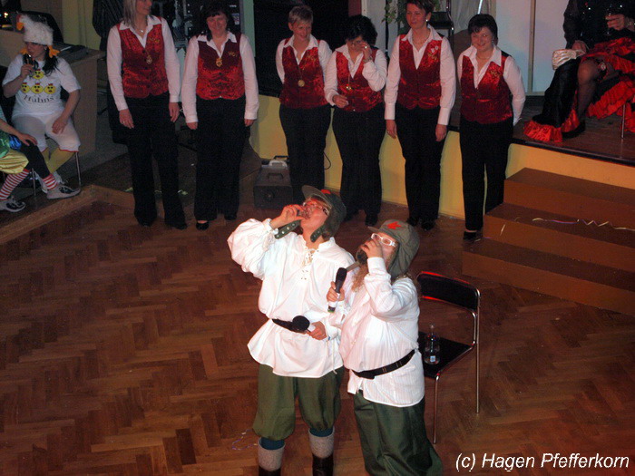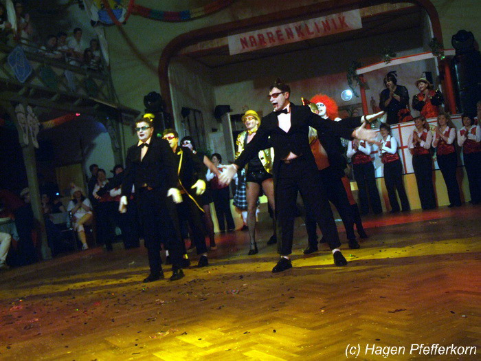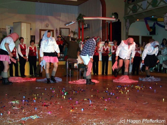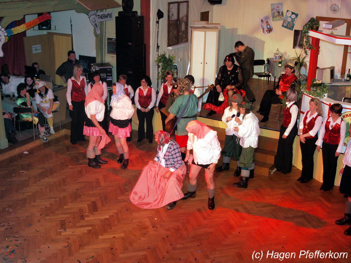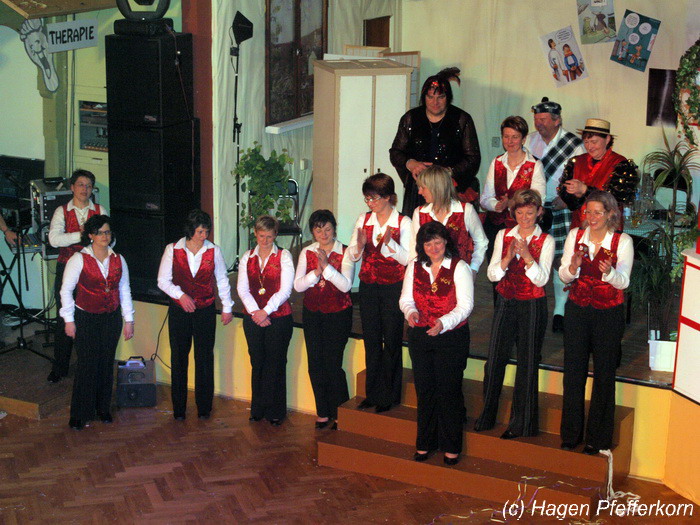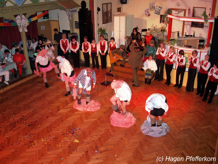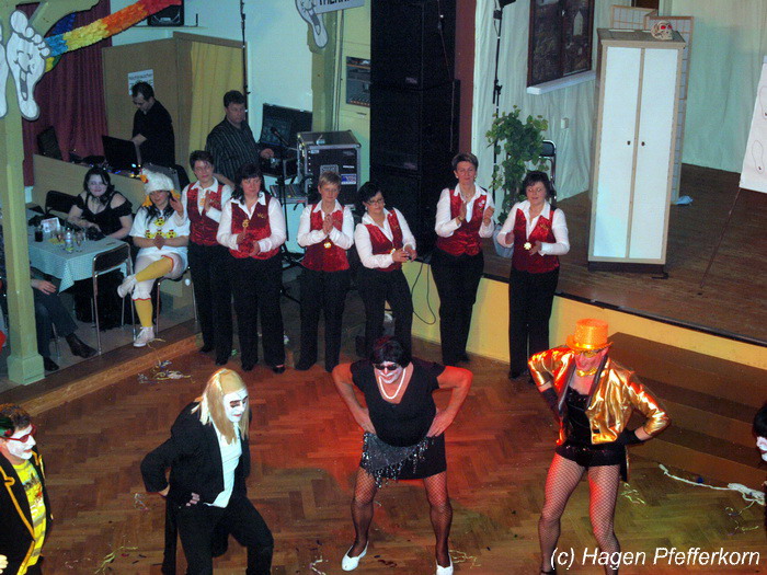 Während im Schützenhaus eine seeehhhr lange Polonaise durchgezogen wurde, hieß es in der Feuerwehr: Schminken, schminken, schminken. Als das endlich geschafft war, ging es los mit diesem Auftritt. Vorher hatten sich die Männer darüber verständigt, dass es bei diesem Auftritt keine Zugabe geben soll. Doch dabei hatten die Männer die Rechnung ohne den Wirt, oder besser ohne die Weiber gemacht. Karina kündigte das schon mit den Worten an: "Heute machen wir se färdsch!". Nach dem Auftritt gab es also erst einmal eine Zugabe. Danach hatten sich Sven und Micha gleich von der Tanzfläche verdrückt. Doch Karina rief sie zur Ordnung und in den Saal zurück. Denn die närrischen Weiber forderten noch eine zweite Zugabe. Danach sah man den Männer an, dass sie "färdsch" waren.