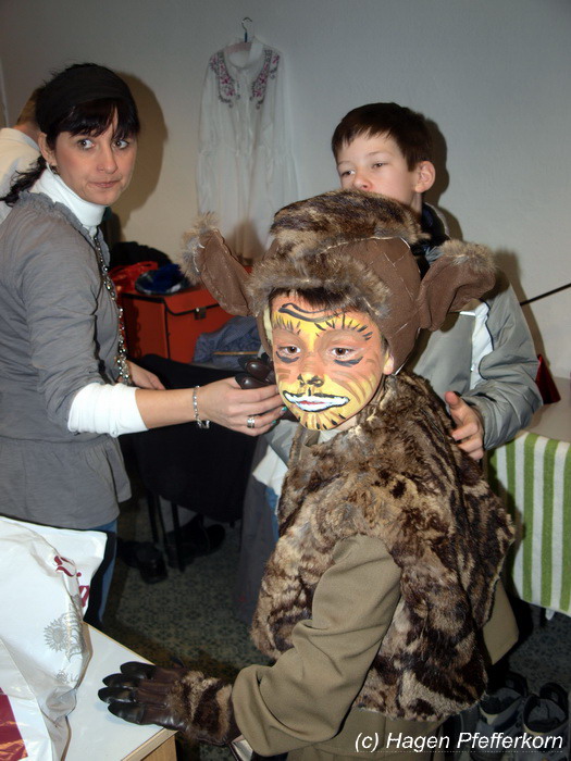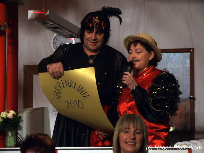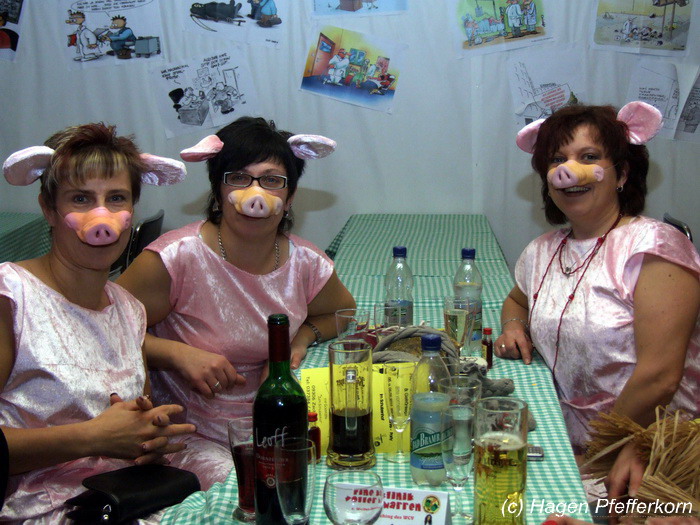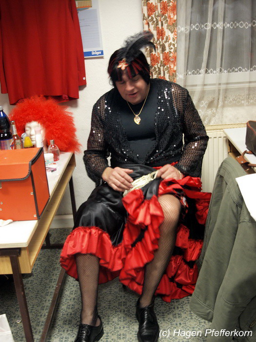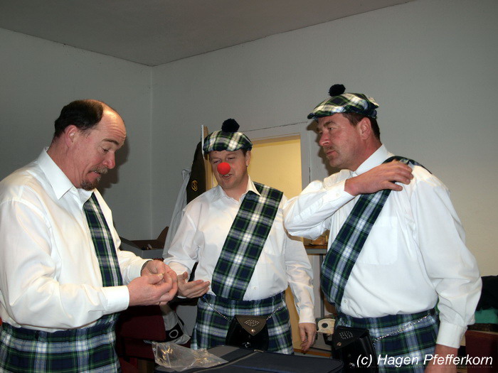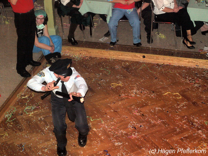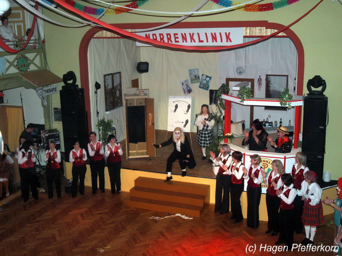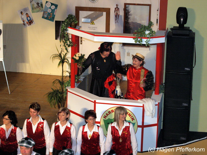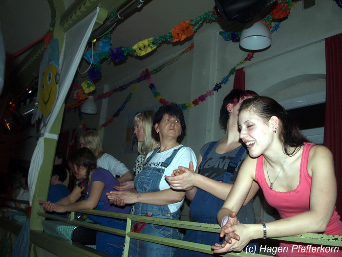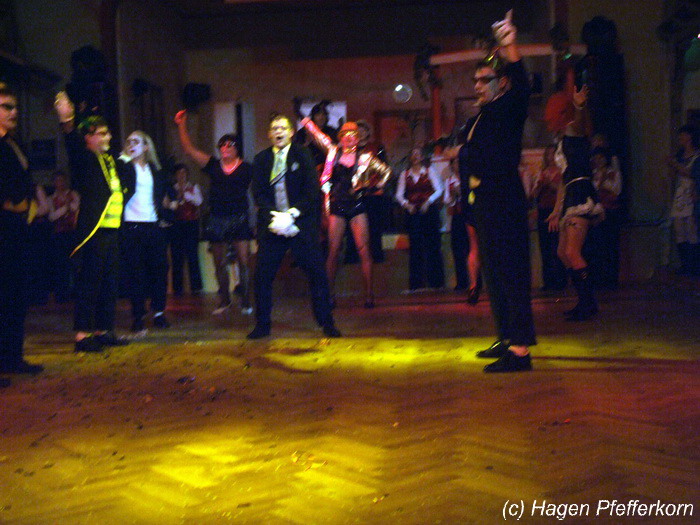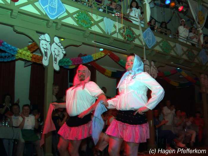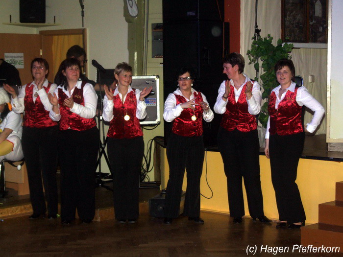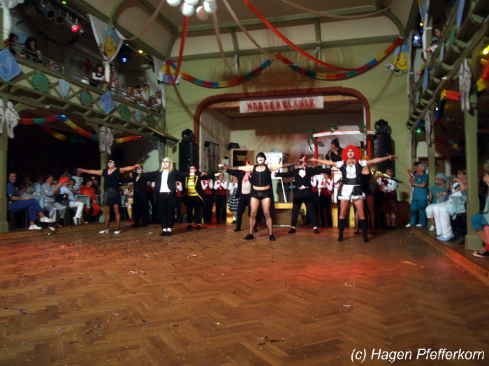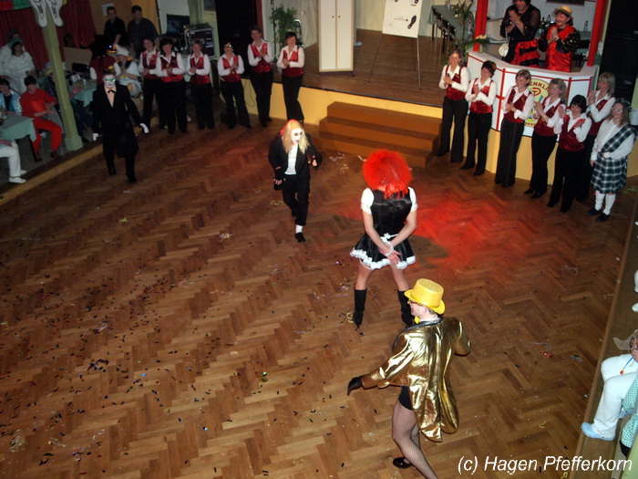 Während im Schützenhaus eine seeehhhr lange Polonaise durchgezogen wurde, hieß es in der Feuerwehr: Schminken, schminken, schminken. Als das endlich geschafft war, ging es los mit diesem Auftritt. Vorher hatten sich die Männer darüber verständigt, dass es bei diesem Auftritt keine Zugabe geben soll. Doch dabei hatten die Männer die Rechnung ohne den Wirt, oder besser ohne die Weiber gemacht. Karina kündigte das schon mit den Worten an: "Heute machen wir se färdsch!". Nach dem Auftritt gab es also erst einmal eine Zugabe. Danach hatten sich Sven und Micha gleich von der Tanzfläche verdrückt. Doch Karina rief sie zur Ordnung und in den Saal zurück. Denn die närrischen Weiber forderten noch eine zweite Zugabe. Danach sah man den Männer an, dass sie "färdsch" waren.