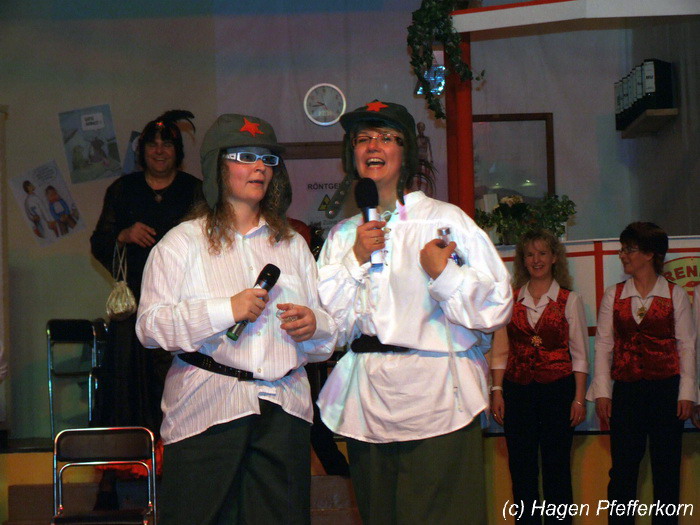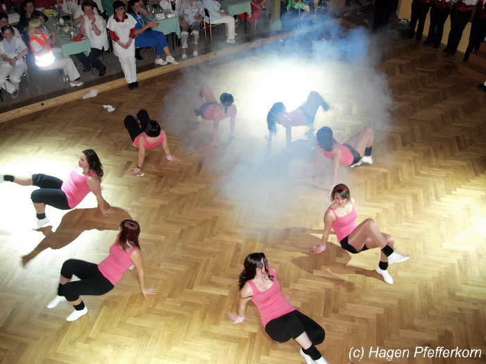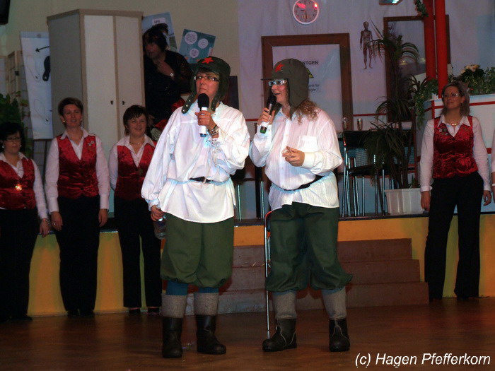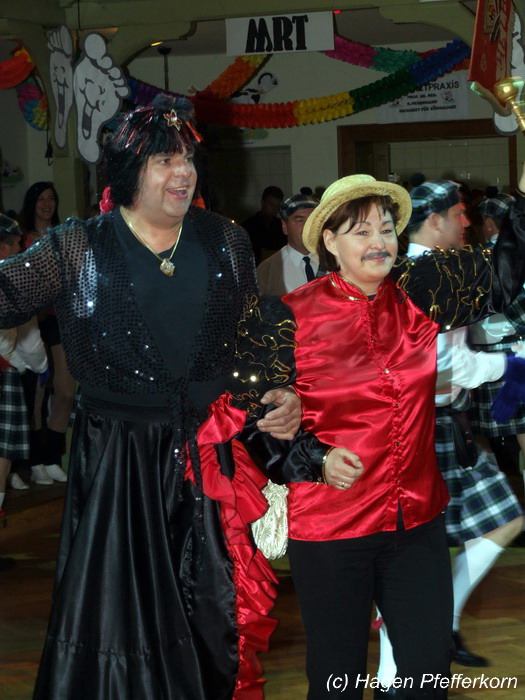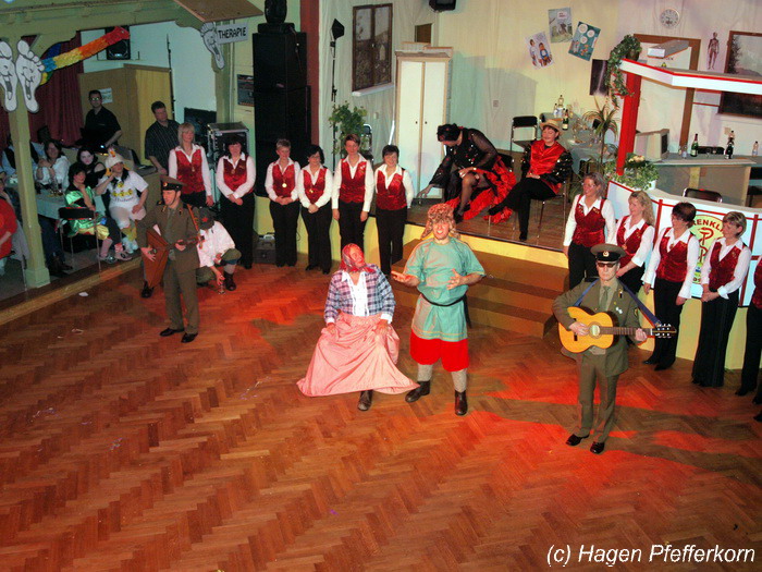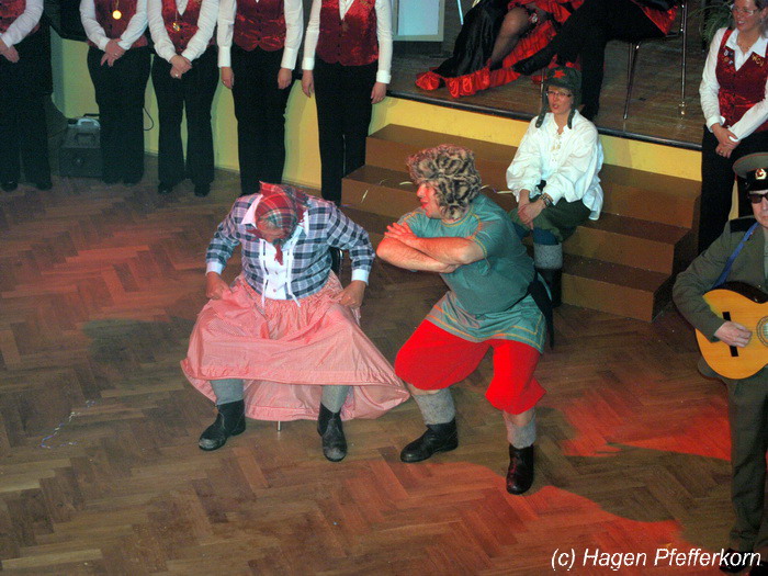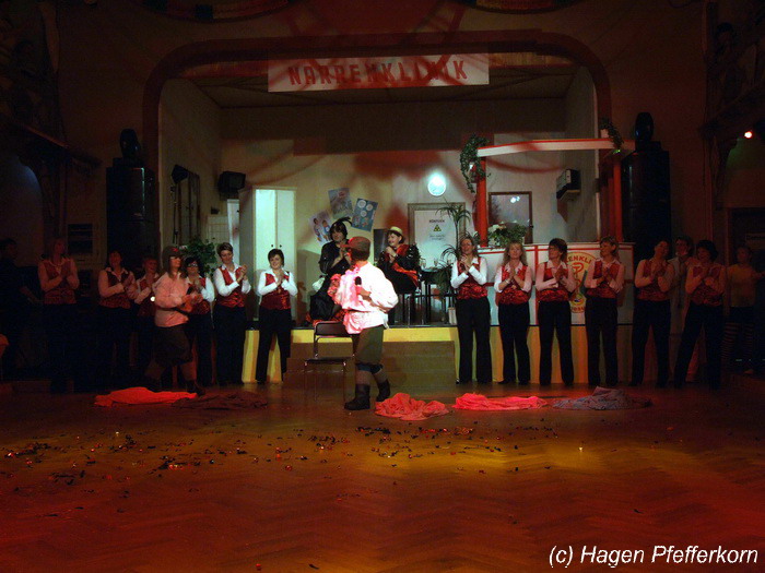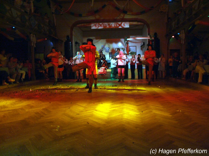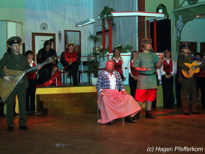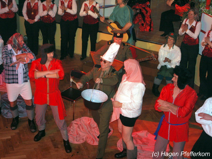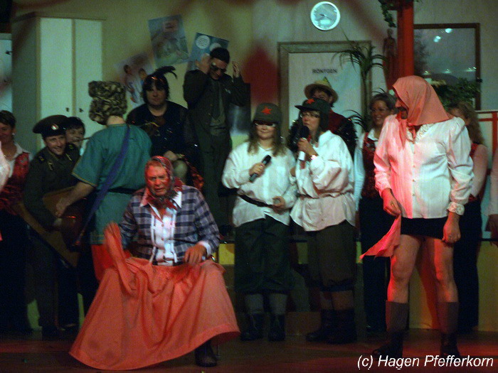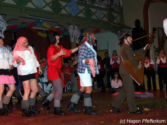 Karina und Mandy kamen dieses Mal verkleidet als russische Soldat(innen) in den Saal und tranken auf den schönen Abend erst mal einen Wodka aus der Pulle. Das Männerballett kam dann zum Titel "Tamara" (Gruppe "MTS" - der Ossi wird sich sicher noch erinnern) und führte einen russischen Tanz inkl. Kassatschok auf. Auch dabei stimmte alles: abwechslungsreiche Kostüme, schöne Stimmungsmusik und eine super Choreografie. Der Höhepunkt war dann natürlich der Abschluß mit - wie schon angedeutet - "Soljanka". Die Närrinnen im Saal waren davon so beeindruckt, dass hier natürlich eine Zugabe fällig war.