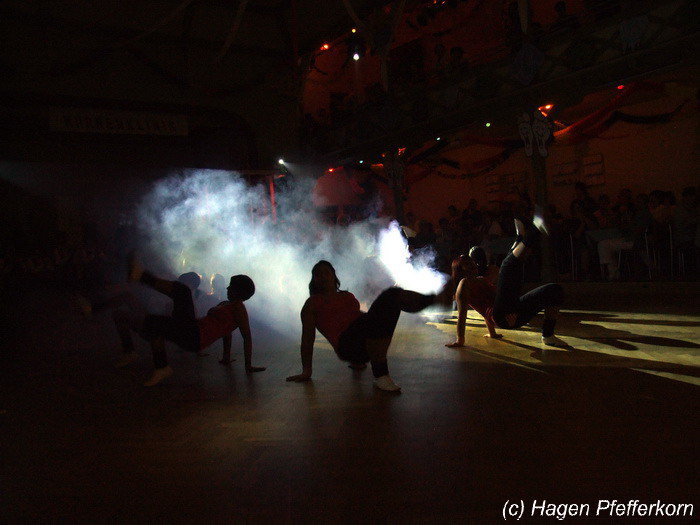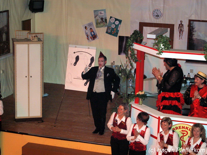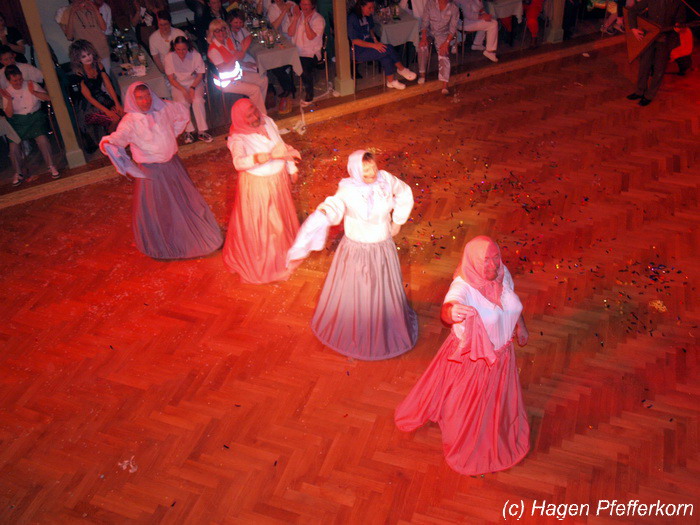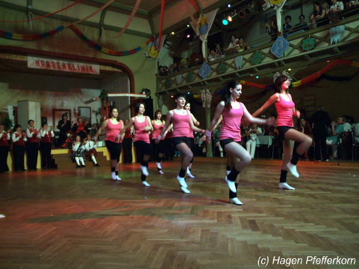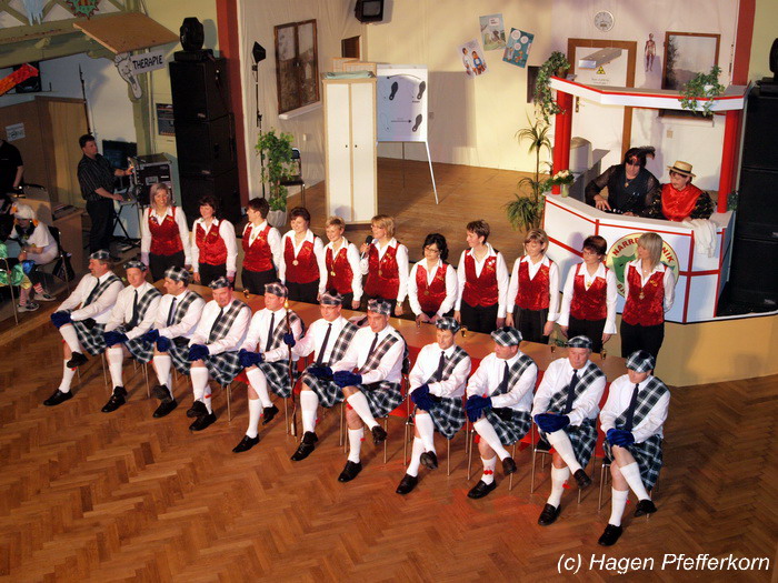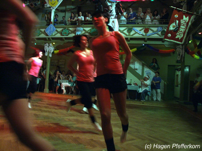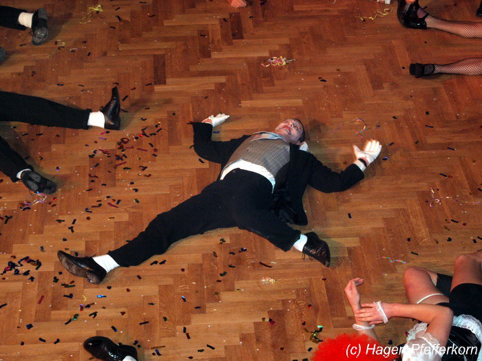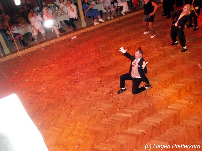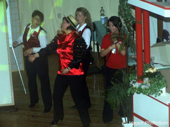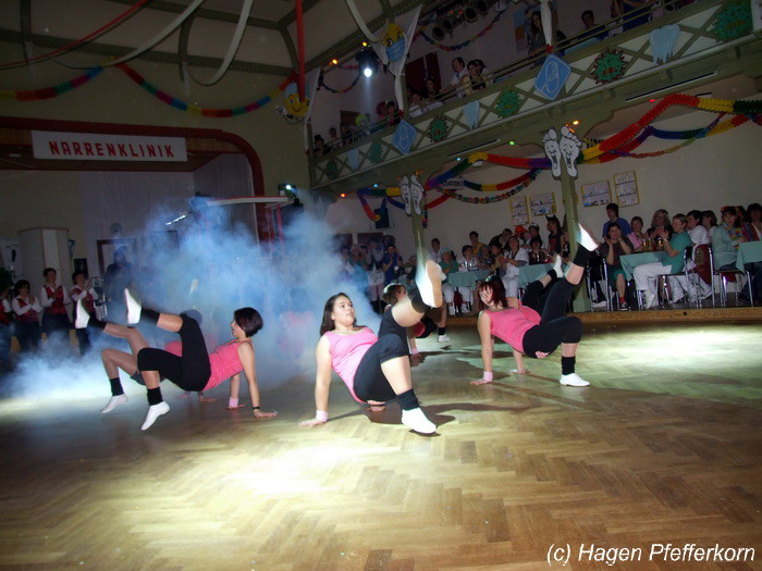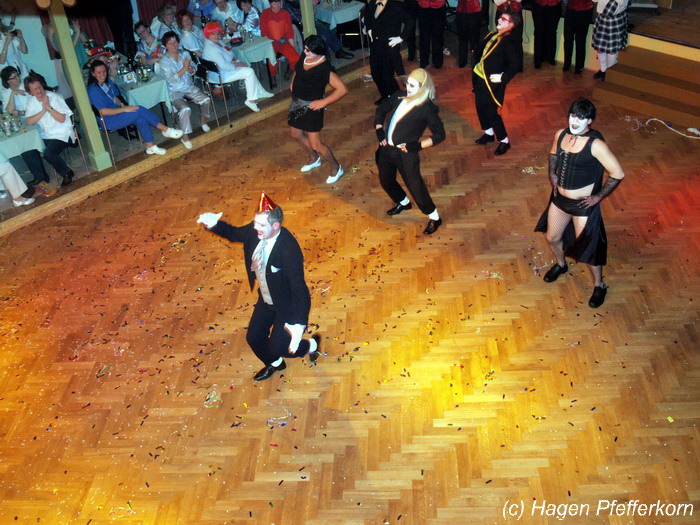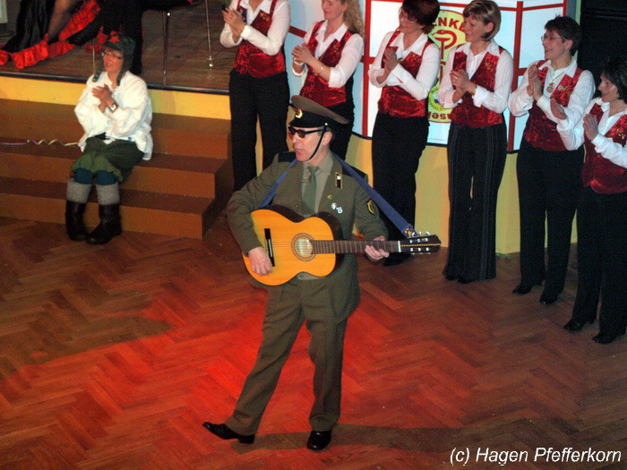 Karina und Mandy kamen dieses Mal verkleidet als russische Soldat(innen) in den Saal und tranken auf den schönen Abend erst mal einen Wodka aus der Pulle. Das Männerballett kam dann zum Titel "Tamara" (Gruppe "MTS" - der Ossi wird sich sicher noch erinnern) und führte einen russischen Tanz inkl. Kassatschok auf. Auch dabei stimmte alles: abwechslungsreiche Kostüme, schöne Stimmungsmusik und eine super Choreografie. Der Höhepunkt war dann natürlich der Abschluß mit - wie schon angedeutet - "Soljanka". Die Närrinnen im Saal waren davon so beeindruckt, dass hier natürlich eine Zugabe fällig war.