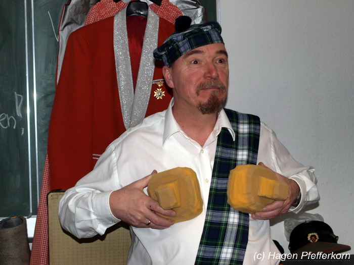 In der nächsten Tanzpause ging es dann auch in der Feuerwehr richtig heiß her. Prinzessin Gerda zeigte besonders viel Bein. Ihm merkte man so richtig an, welchen Spaß ihm auch dieser Weiberfasching macht. Zur Einstimmung auf den nächsten Auftritt (dieser endet mit einem Titel "Soljanka ...") gab es - gesponsort von Torsten Knorr - für jeden in der Feuerwehr einen Pott heiße Soljanka.