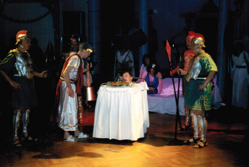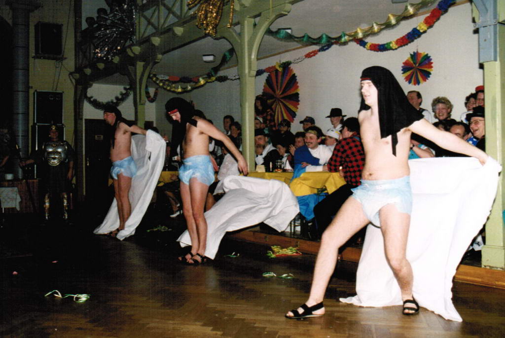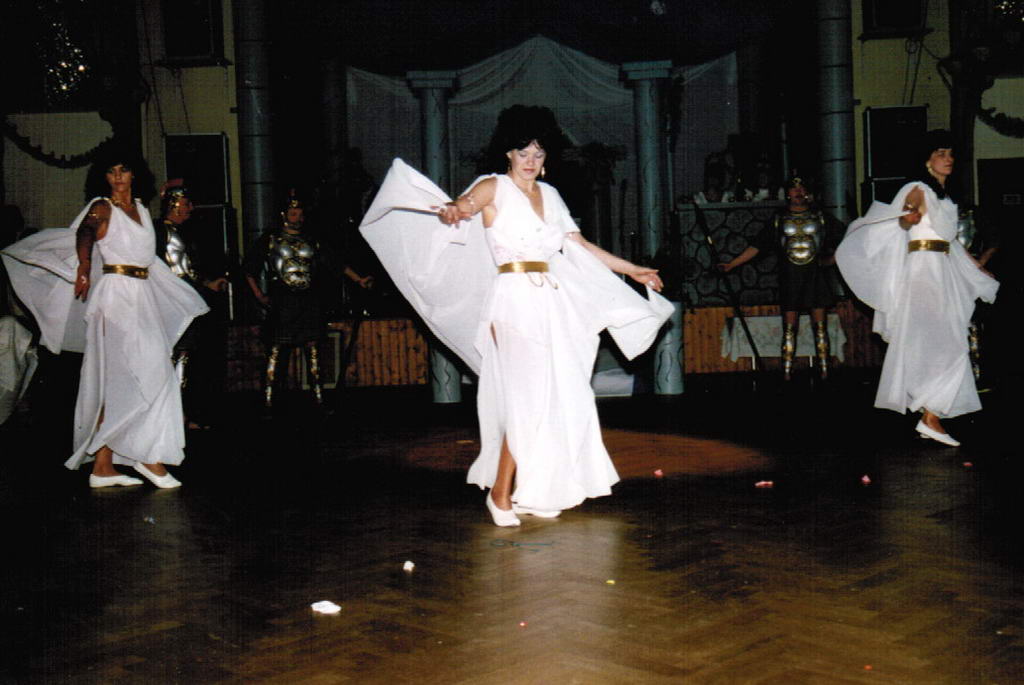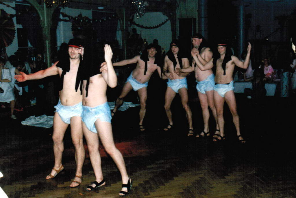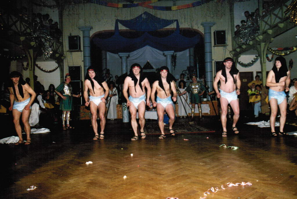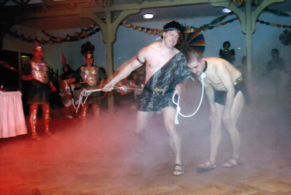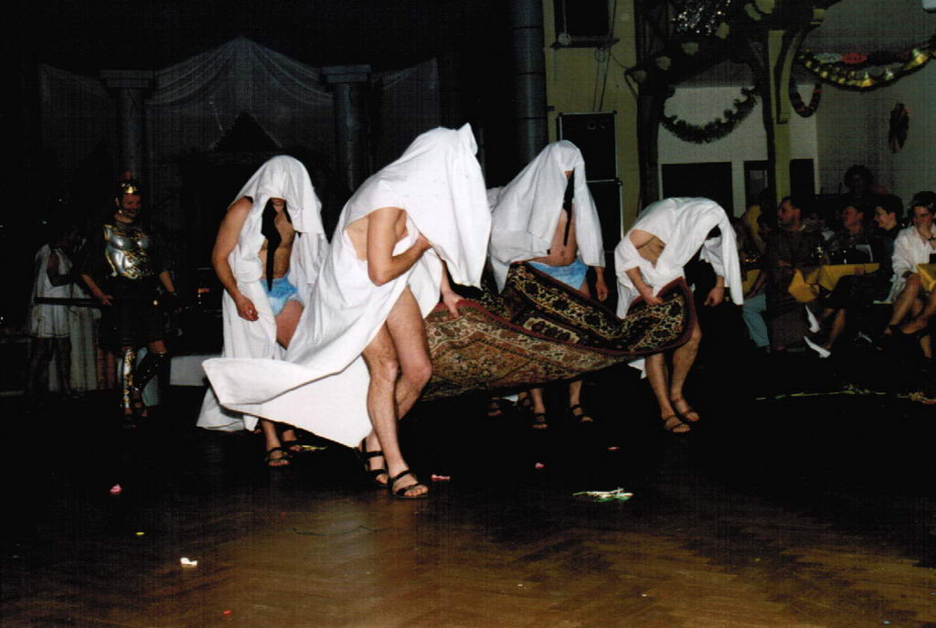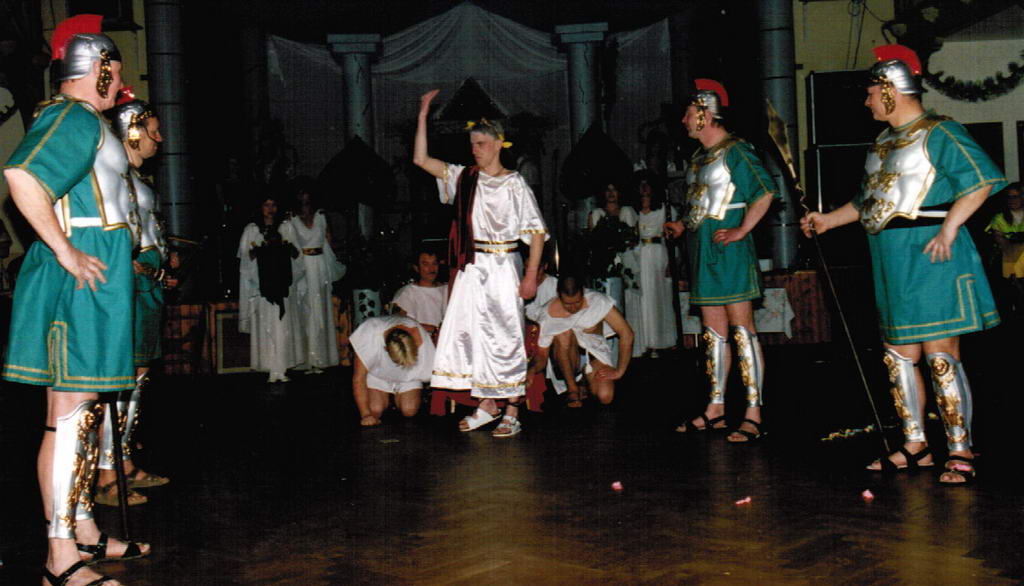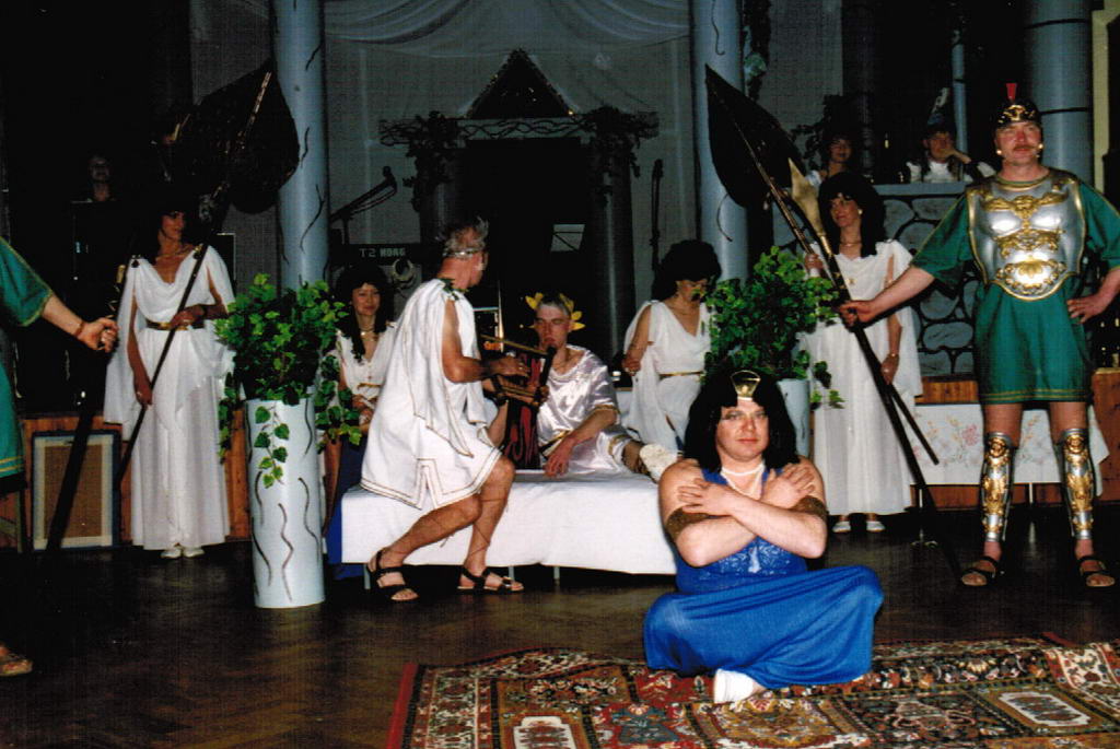 Nachdem unser Julius Falk Cäsar unter dem Gejohle seines Publikums in den Saal getragen und er auf dem Thron Platz genommen hatte, wurde seine durchaus nicht gute Laune durch den anmutigen Tanz der Sklavinnen etwas aufgebessert. Diese wurde noch besser, als ihm eine Abordnung aus Ägypten als Zeichen der Unterwerfung die hinreißende Prinzessin Cleopatra (Reiner Thiele) zu Füßen legte und er sich im Fortgang der Geschehnisse mit dieser vergnügen konnte. Dabei zeigte die Abordnung aus Ägypten in Form des Männerballetts des WCV Tänze, die bereits zu Beginn durch ihre Kostüme aufsehen und Erheiterung beim Cäsar und seinem ganzen Gefolge auslösten: Die Tänzer waren nach dem Ablegen Ihrer Umhänge nur noch mit Pampers bekleidet.