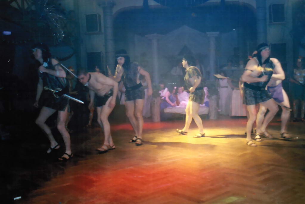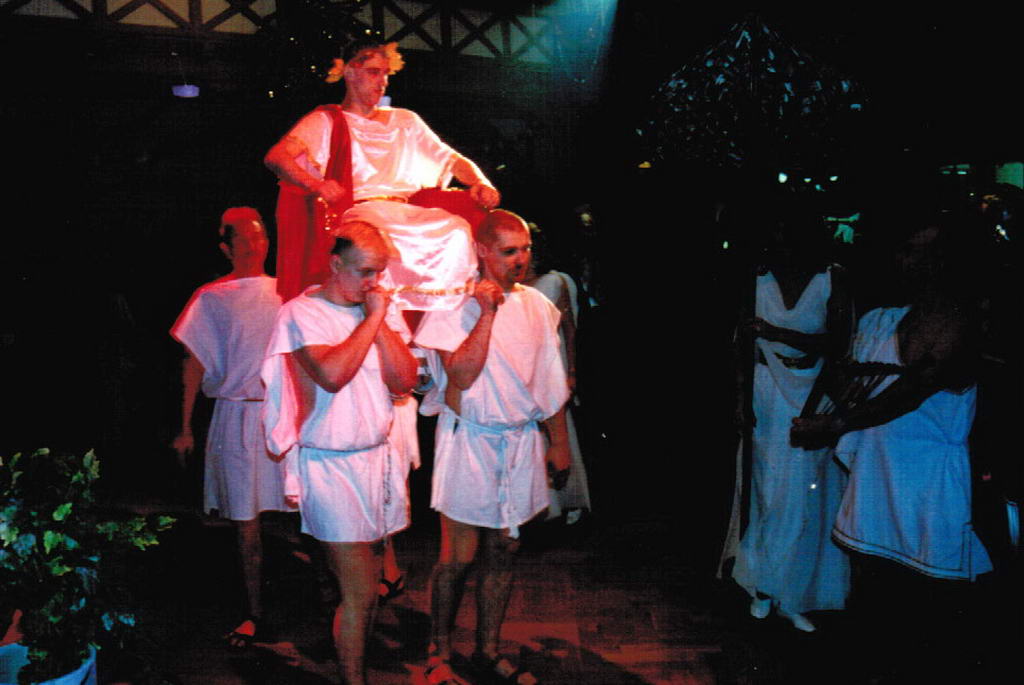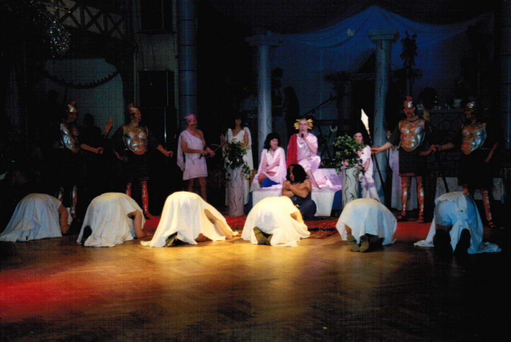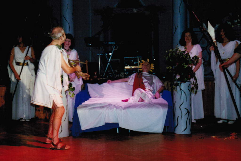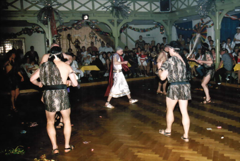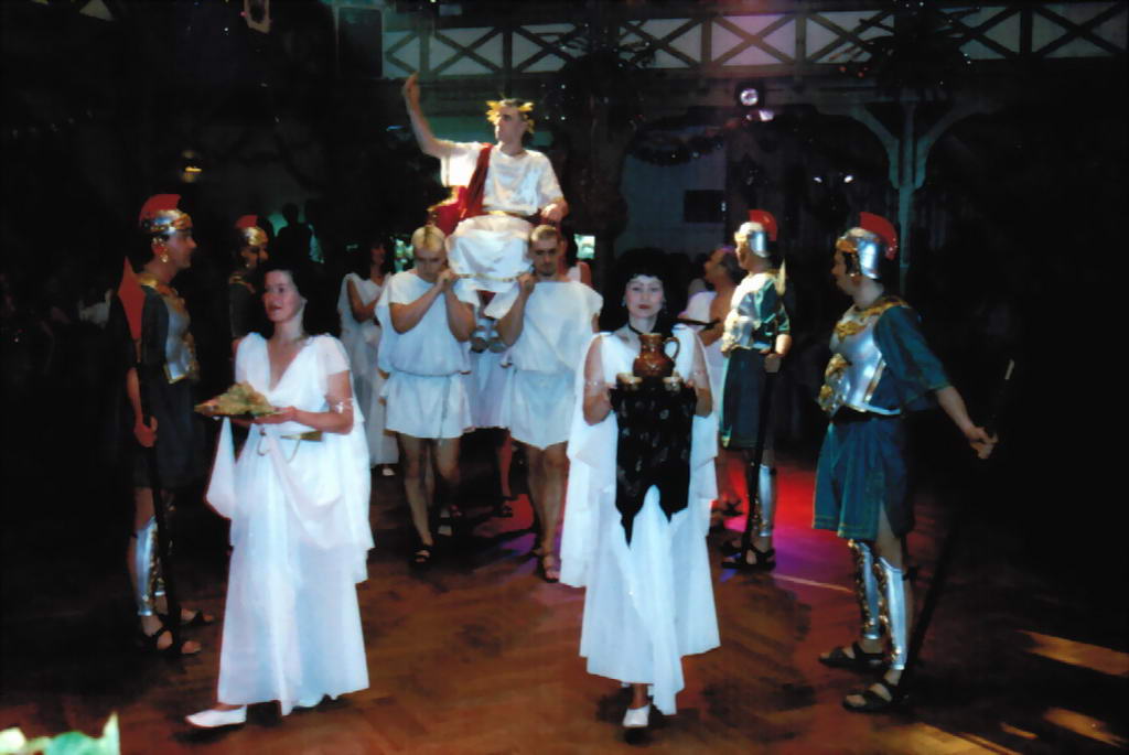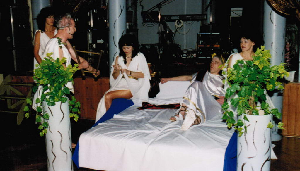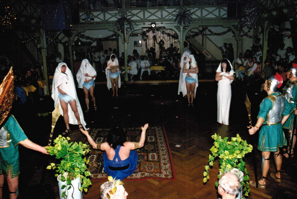 Nachdem unser Julius Falk Cäsar unter dem Gejohle seines Publikums in den Saal getragen und er auf dem Thron Platz genommen hatte, wurde seine durchaus nicht gute Laune durch den anmutigen Tanz der Sklavinnen etwas aufgebessert. Diese wurde noch besser, als ihm eine Abordnung aus Ägypten als Zeichen der Unterwerfung die hinreißende Prinzessin Cleopatra (Reiner Thiele) zu Füßen legte und er sich im Fortgang der Geschehnisse mit dieser vergnügen konnte. Dabei zeigte die Abordnung aus Ägypten in Form des Männerballetts des WCV Tänze, die bereits zu Beginn durch ihre Kostüme aufsehen und Erheiterung beim Cäsar und seinem ganzen Gefolge auslösten: Die Tänzer waren nach dem Ablegen Ihrer Umhänge nur noch mit Pampers bekleidet.