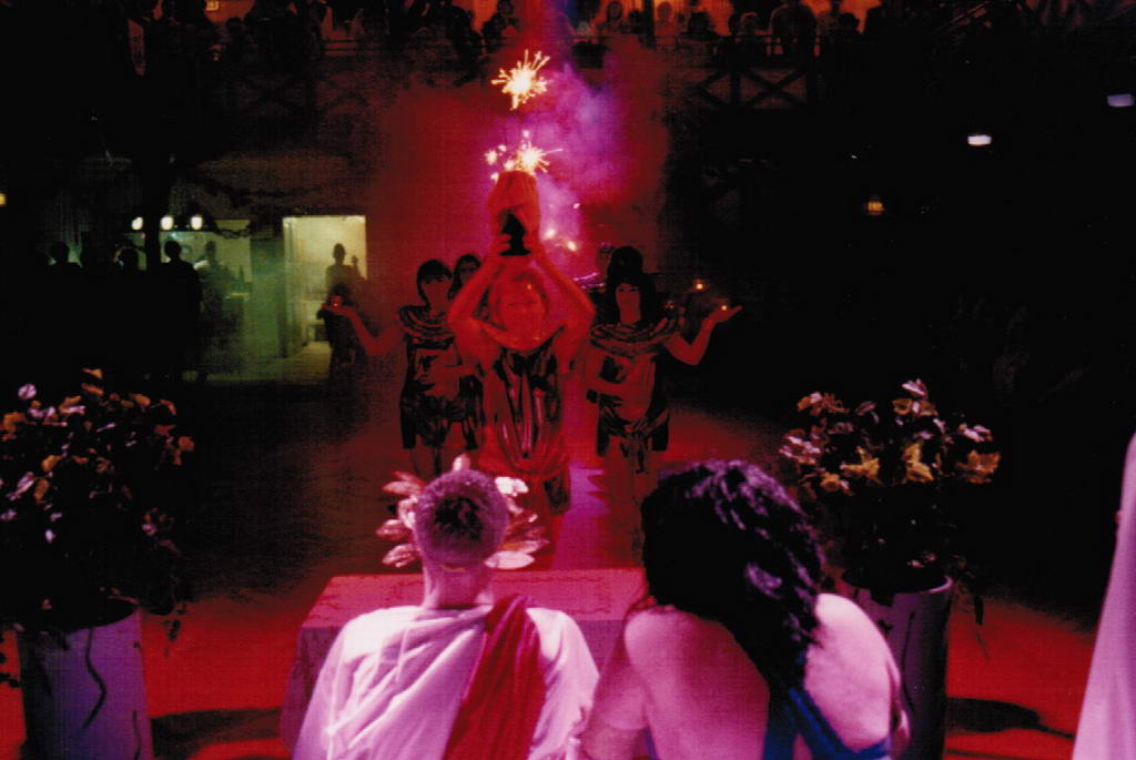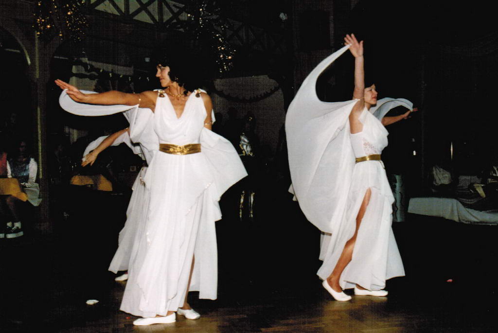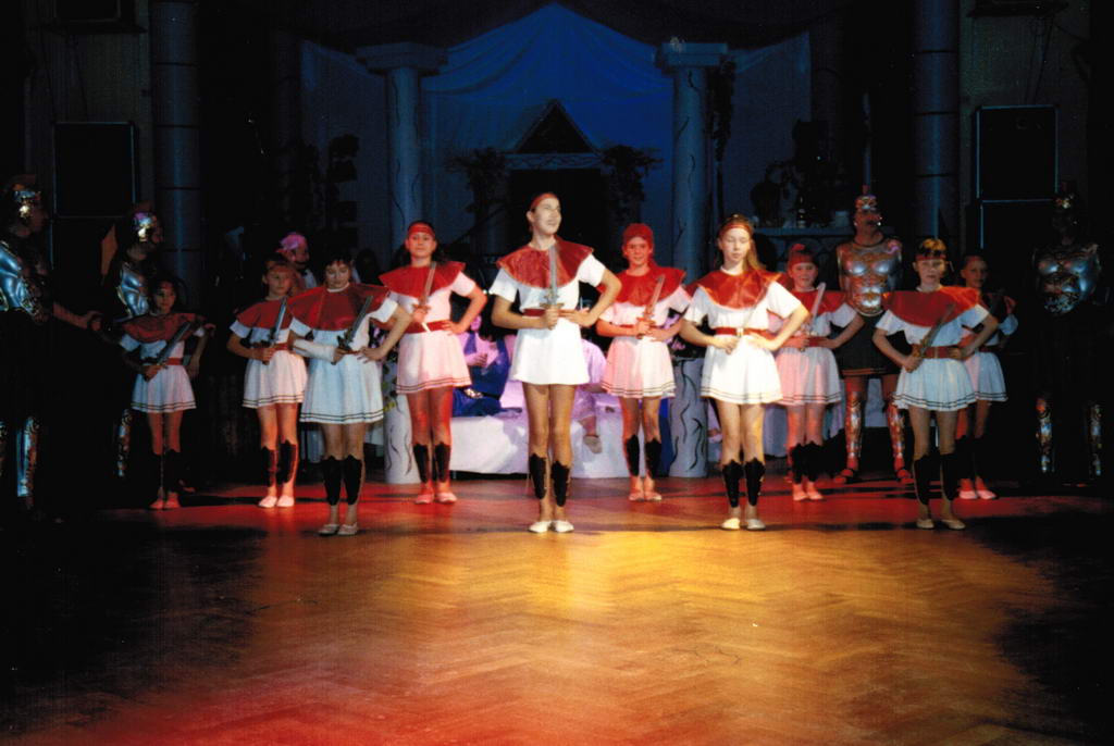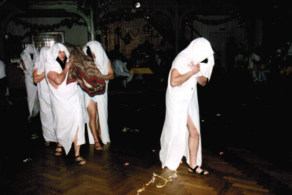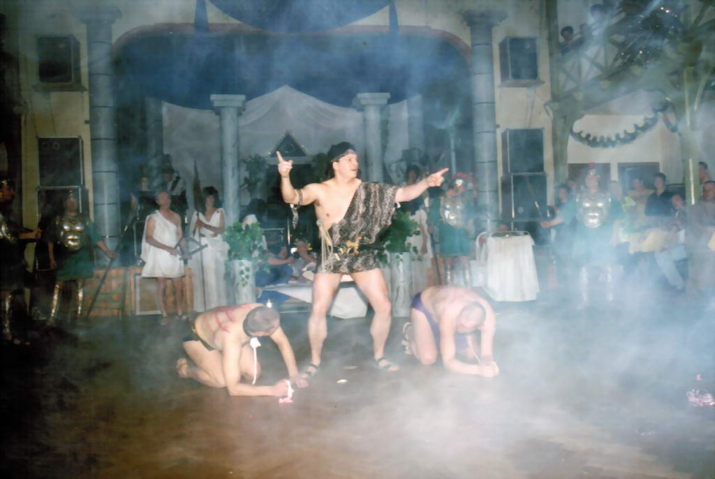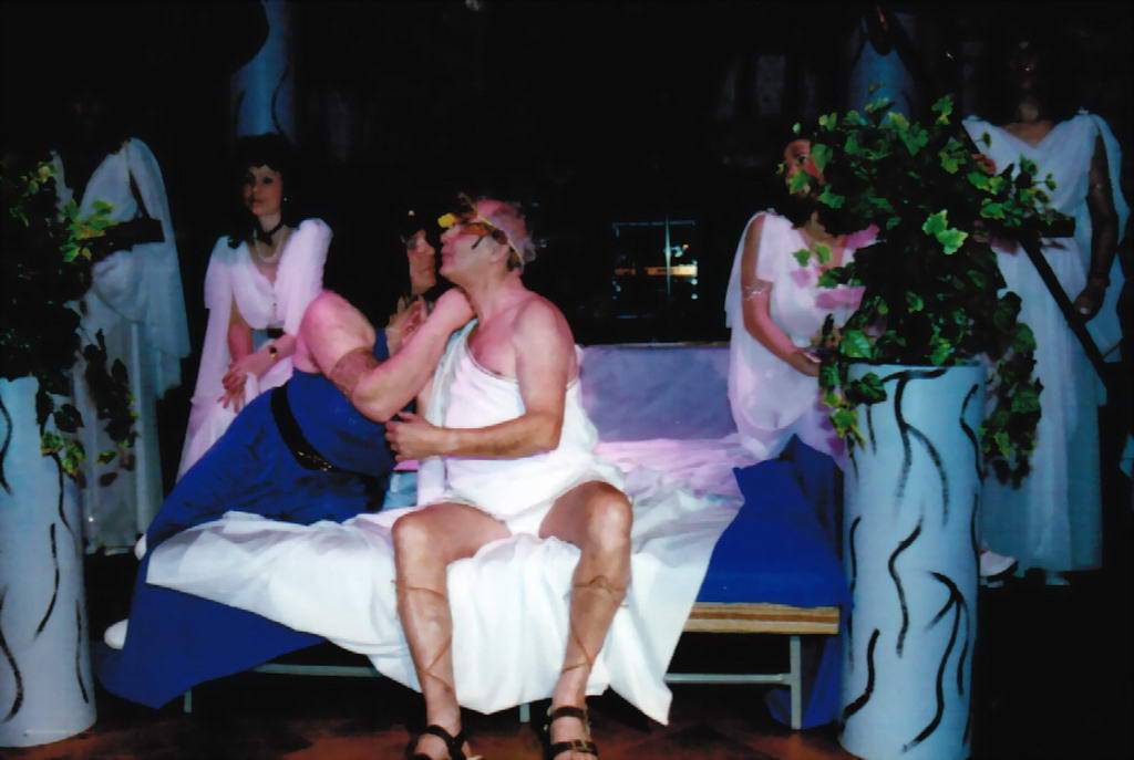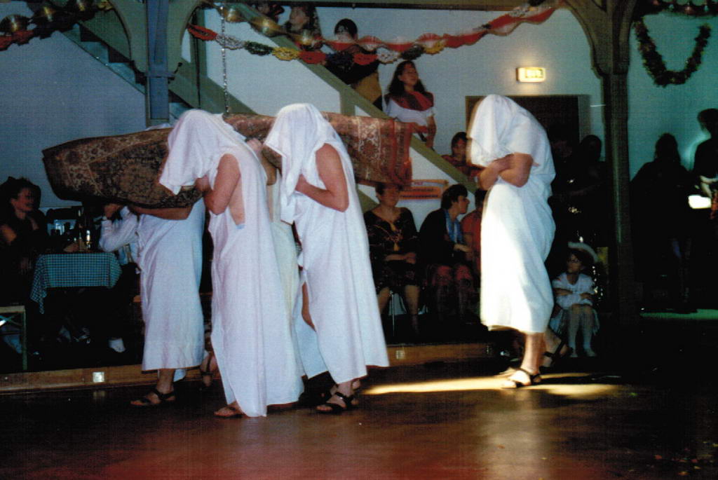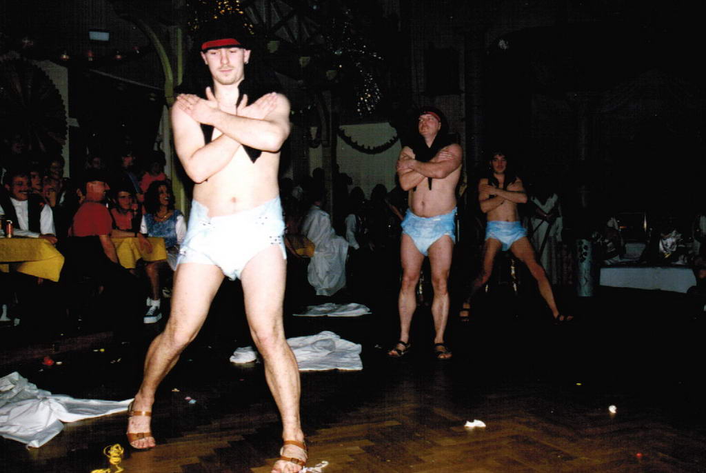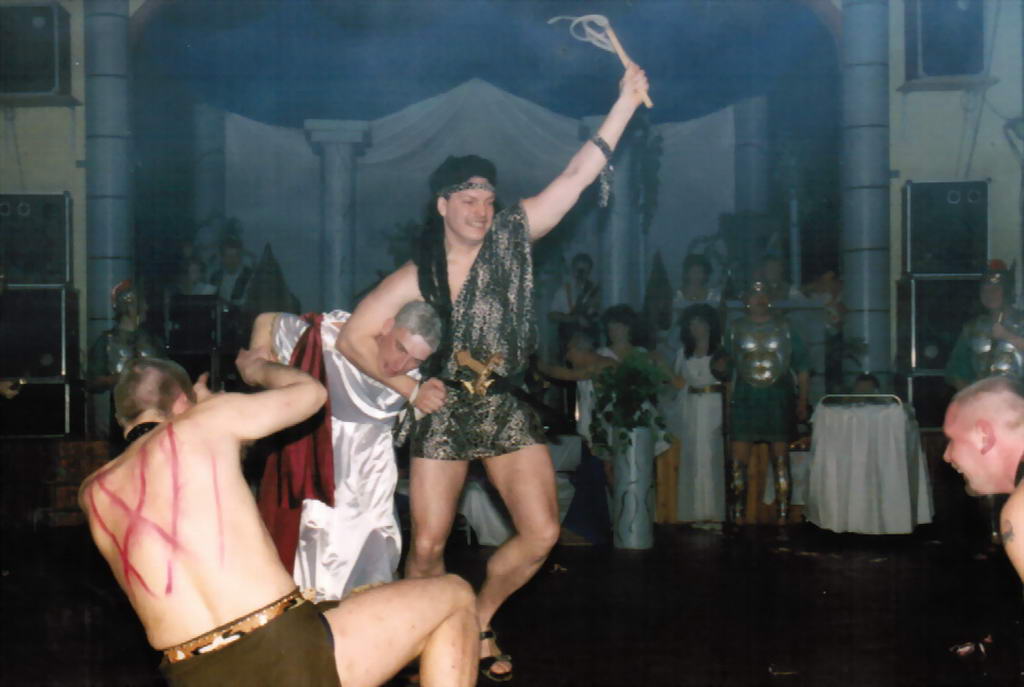 Nachdem unser Julius Falk Cäsar unter dem Gejohle seines Publikums in den Saal getragen und er auf dem Thron Platz genommen hatte, wurde seine durchaus nicht gute Laune durch den anmutigen Tanz der Sklavinnen etwas aufgebessert. Diese wurde noch besser, als ihm eine Abordnung aus Ägypten als Zeichen der Unterwerfung die hinreißende Prinzessin Cleopatra (Reiner Thiele) zu Füßen legte und er sich im Fortgang der Geschehnisse mit dieser vergnügen konnte. Dabei zeigte die Abordnung aus Ägypten in Form des Männerballetts des WCV Tänze, die bereits zu Beginn durch ihre Kostüme aufsehen und Erheiterung beim Cäsar und seinem ganzen Gefolge auslösten: Die Tänzer waren nach dem Ablegen Ihrer Umhänge nur noch mit Pampers bekleidet.