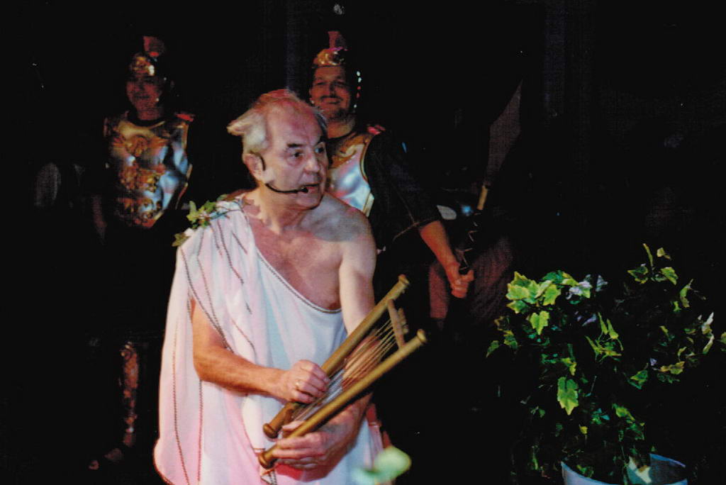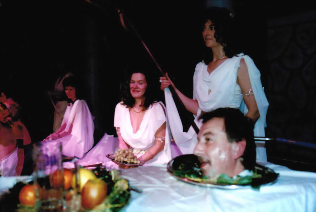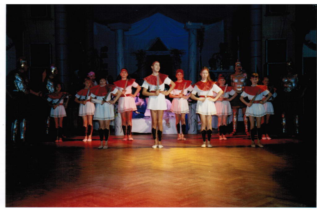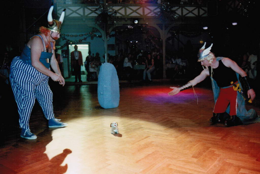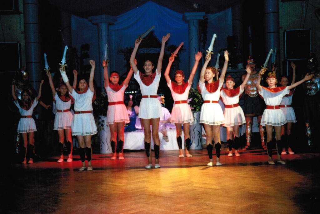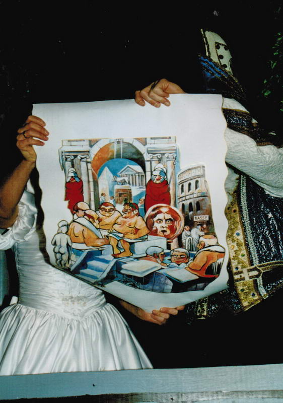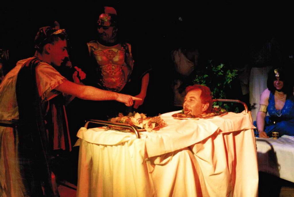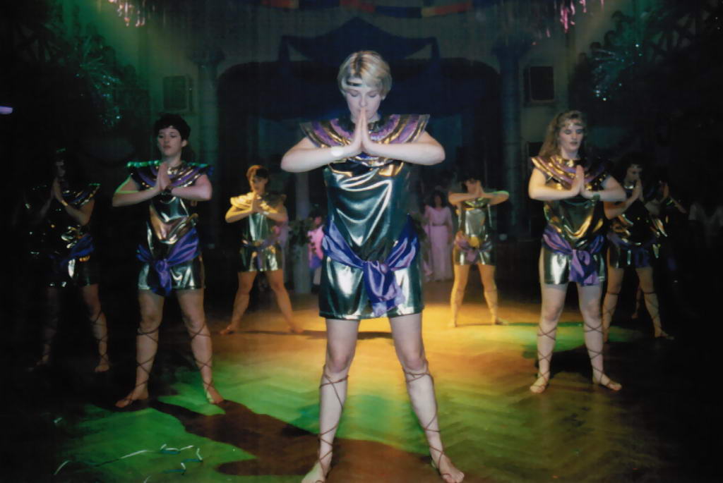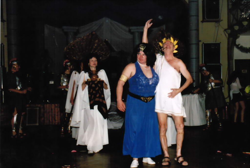 Nachdem unser Julius Falk Cäsar unter dem Gejohle seines Publikums in den Saal getragen und er auf dem Thron Platz genommen hatte, wurde seine durchaus nicht gute Laune durch den anmutigen Tanz der Sklavinnen etwas aufgebessert. Diese wurde noch besser, als ihm eine Abordnung aus Ägypten als Zeichen der Unterwerfung die hinreißende Prinzessin Cleopatra (Reiner Thiele) zu Füßen legte und er sich im Fortgang der Geschehnisse mit dieser vergnügen konnte. Dabei zeigte die Abordnung aus Ägypten in Form des Männerballetts des WCV Tänze, die bereits zu Beginn durch ihre Kostüme aufsehen und Erheiterung beim Cäsar und seinem ganzen Gefolge auslösten: Die Tänzer waren nach dem Ablegen Ihrer Umhänge nur noch mit Pampers bekleidet.