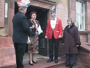 Mit lautstarker Unterstützung der anwesenden Zuschauer wurde die Bürgermeisterin, Frau Renate Naumann vor die Rathaustür gerufen. Nach etwas Ziererei und Palaver war sie dann endlich dazu bereit, dem noch amtierenden Prinzen Stefan den I. Teuren den Rathausschlüssel zu überlassen.
