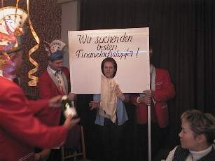 Die Übergabeverhandlung wurde dann durch die Kämmerin eingeleitet, die die Karnevalisten auf die Probleme der Gemeinde - vor allem in finanzieller Hinsicht - hinwies. Auch dicke Zigarren wurden verteilt, so z.B. an den Präsidenten des WCV. Dem Prinzen wurde als umweltfreundliches Transportmittel für Ihre Lieblichkeit, Prinzessin Martin !. von der Waterkant ein Handwagen zur Verfügung gestellt.