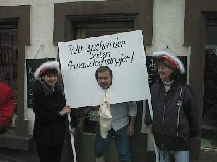 Anschließend gab es noch eine Überprüfung der weiblichen Mitglieder der Gemeindeverwaltung, die uns auf Grund der Großen Finanzlöcher im Finanzhaushalt dringend angeraten erschienen: Wir suchten die beste Finanzlochstopferin. Das beste Ergebnis lieferte dabei Frau Mäding ab.