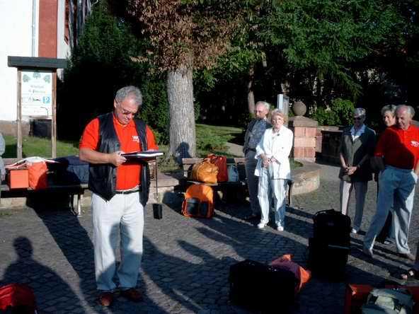 Am 28. und 29. Juni 2003 startete die Vereinsausfahrt des WCV mit insgesamt 20 Paaren - es waren sowohl Vereinsmitglieder als auch Sponsoren und Freunde des Vereines. Dieses Mal geht es ins "Ausland" - nach Thüringen und Sachsen-Anhalt. Treffpunkt war auf dem Markt in Wechselburg. Hier wurde durch das Organisationskomitee (Günter Winkler) geprüft, ob jedes Paar die gestellte Vereinsaufgabe (ein Gepäckstück musste die Farbe "RAL2009" haben) erfüllt hatte. Nur Thomas Mann hat sich der Aufgabe entzogen (Strafe: ein Kulturbeitrag zur Abendveranstaltung - siehe dort).