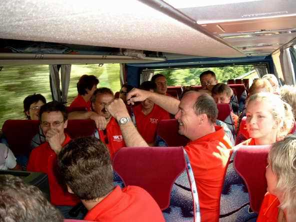 Mit dem Bus vom Reisebüro Ullmann aus Burgstädt ging es dann auf "Große Fahrt". Eine erste Rast wurde an der Raststätte Teufelstal eingelegt, wo man sich mit Speis und Trank (hier gab's zur Abwechslung mal kein Bier sondern Kaffee) stärken konnte. Weiter im Bus wurden durch Bernd Hofmann Fliegenklatschen verteilt. diese wurden sogleich zum Pflicht-Bekleidungsstück erklärt und wurden so neben unserer Vereinskleidung zum Erkennungszeichen während der Fahrt. Aus dem hinteren Teil des Busses wurden eine ganze Reihe von Damen-Unterwäsche durch den Bus nach vorne gereicht. - Sehr zur Freude von Günter Meinhold.