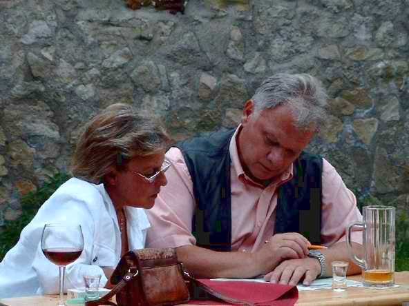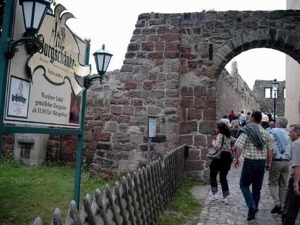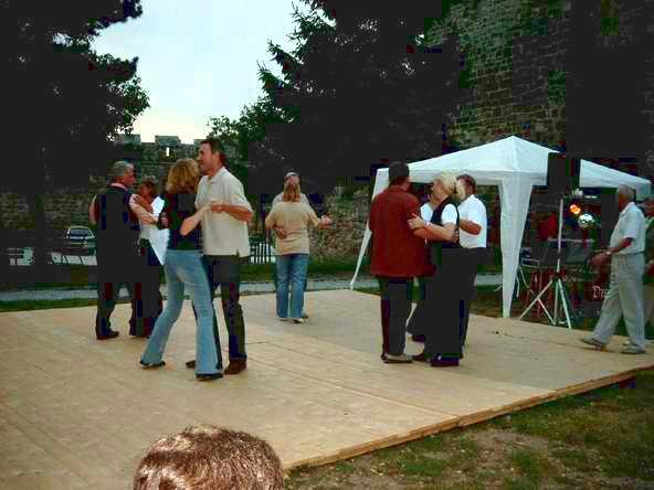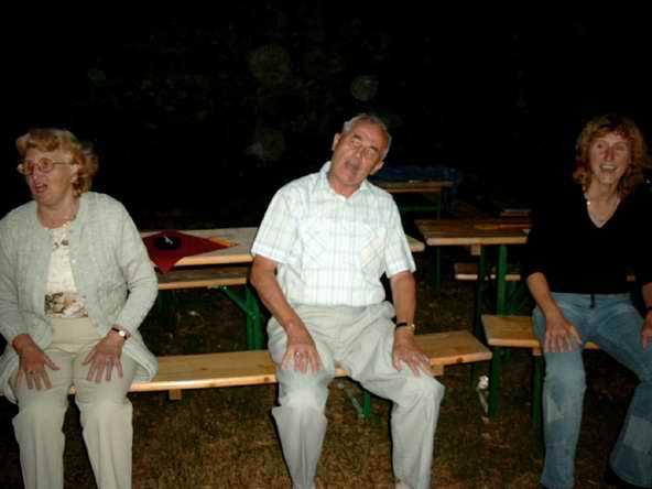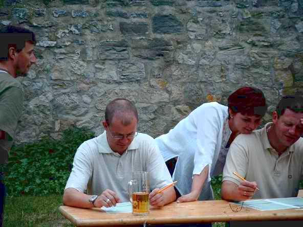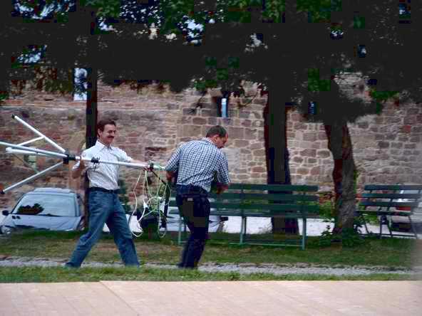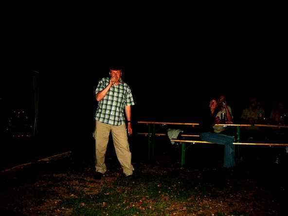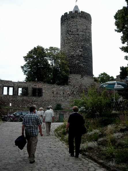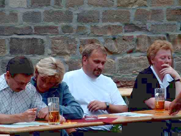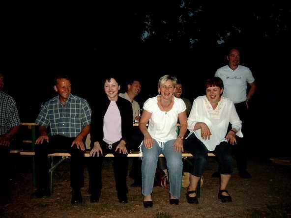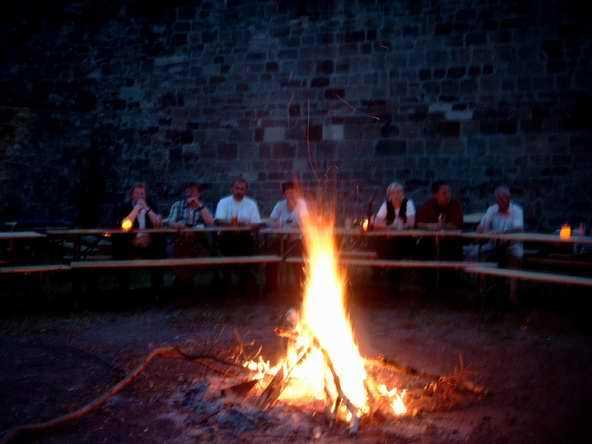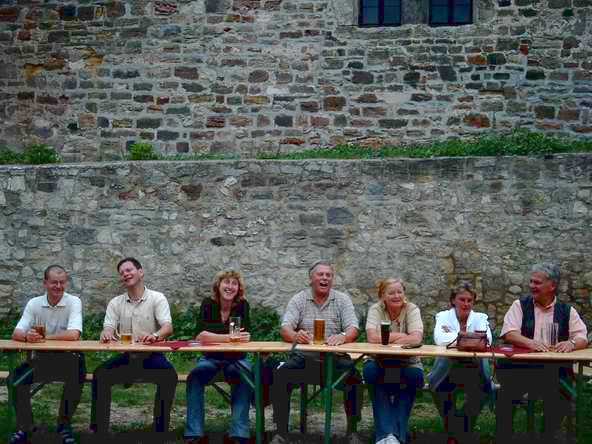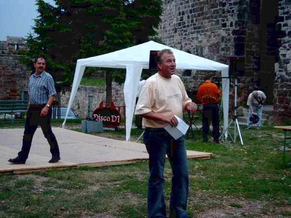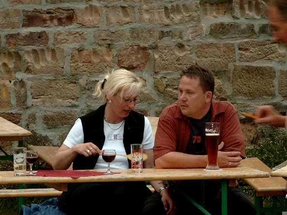 Abends ging es mit dem Bus zur Burgruine in Schönburg. Anfangs sah es fast so aus, als ob wir wegen des drohenden Regen den Abend in der Gaststätte - und dort auch noch in zwei getrennten Räumen - verbringen sollten. Doch Petrus hatte ein Einsehen mit uns. Vor dem Feiern wurde sich erst einmal an der reichlich gedeckten Tafel gestärkt. Bevor es dann so richtig los ging, musste die DJ-Anlage erst wieder nach draußen gebracht werden. Auf dem Bild sieht's aus, wie im Märchen: Der Riese trägt den Baumstamm und der kleine Mann lässt sich tragen.