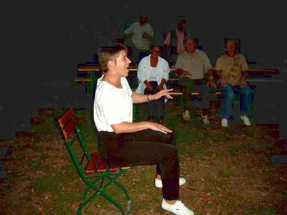 Peter Ziemann und Günter Winkler machten damit den Anfang und führten ein Stehgreif-Theaterstück auf. Danach ging es auch mit der Disco und dem Tanzen los. Allerdings wurde dies immer wieder durch weitere Einlagen unterbrochen. - Wir sind halt ein Faschingsverein, wo viele zum Gelingen des Abends beitragen. Zwischendurch wurde von einigen auch die Gelegenheit genutzt, um den Aussichtsturm zu besteigen. Selbst "Höhenuntaugliche" wie Gabi Vollstädt wagten sich nach oben. Mit "Meine Tante Anna" beglich Kathrin Pfefferkorn dann die "Spielschuld" ihres Mannes aus der Führerscheinprüfung.