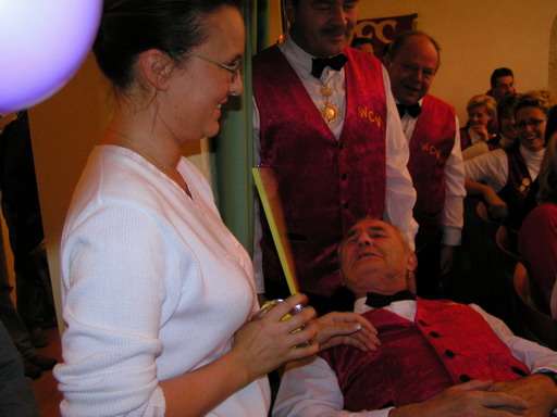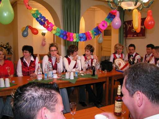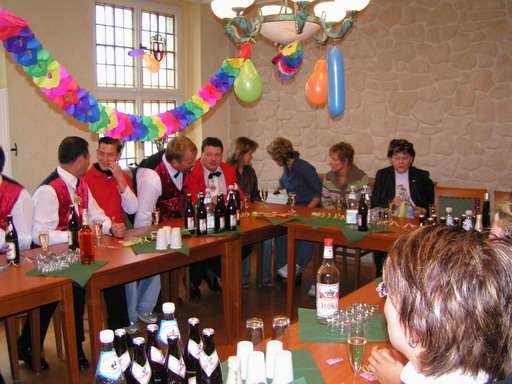 Vor dem Rathaus erwartete die Mitglieder des WCV eine halbe Baustelle: ein großer Haufen Sand war aufgeschüttet, unter dem sich der Rathausschlüssel befinden sollte. Also hieß es erst einmal schaufeln, schaufeln, ...! Am Ende stellte es sich allerdings heraus, dass die Gemeindeverwaltung diesen Arbeitseinsatz als Hilfe für den Hochwasserschutz inszeniert hatte, denn der Sand wurde gleich in die bereitliegenden Sandsäcke gschaufelt. Der Schlüssel zum Rathaus befand sich nie unter diesem Haufen.