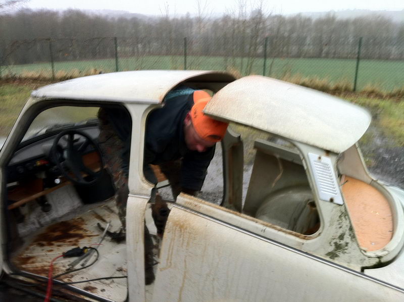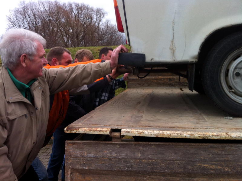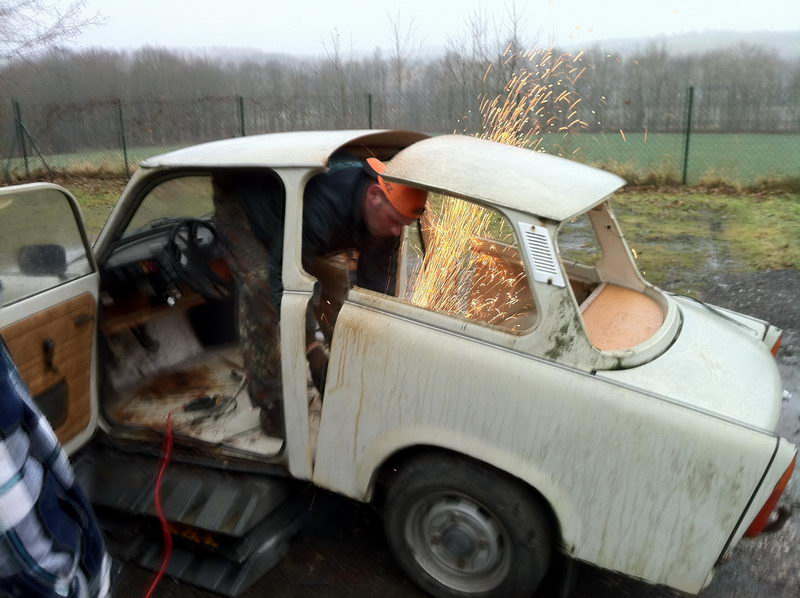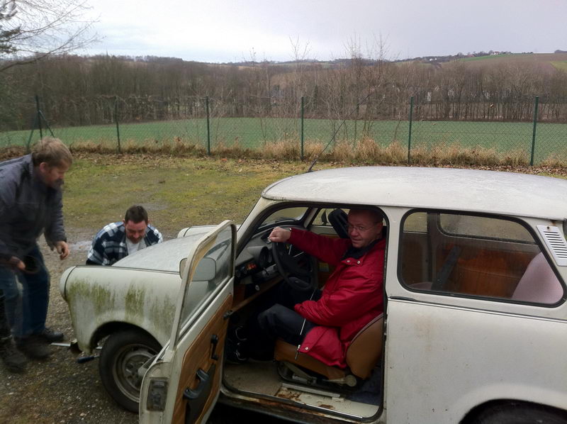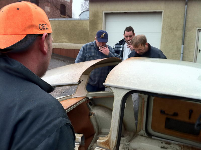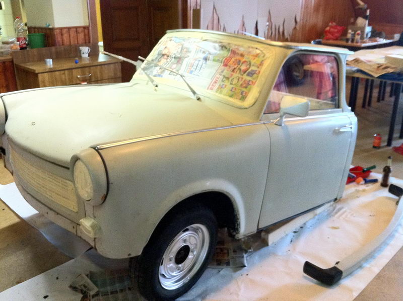 Nachdem die Idee einmal geboren war (wir bauen auf de rBühne aus einem PKW-Vorderteil eine Prinzenloge) ging es an die Suche eines möglichen PKW. Am Ende standen zwei mögliche Fahrzeuge zur Auswahl. Die Wahl fiel dann auf eien Trabent, der uns freundlicherweise vom Autohaus Sturne in Rochlitz zur Verfügung gestellt wurde. Der Trabi hatte den großen Vorteil, dass wir das Vorderteil ohne zerlegen, oder ohne Umbau an Türen oder Fenstern im Schützenhaus auch in den Saal bekommen. Fast jedes andere Auto wäre für die örtlichen Begebenheiten zu groß gewesen.