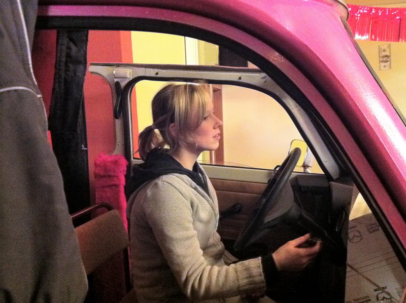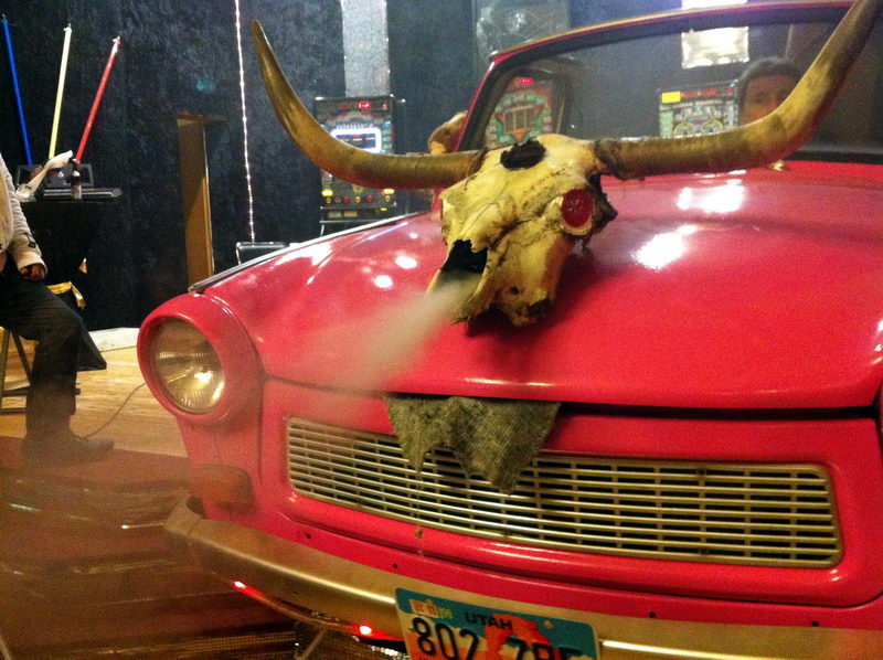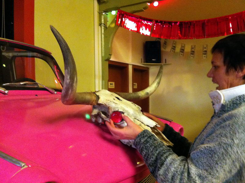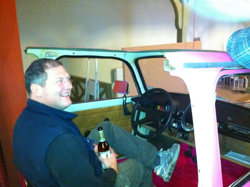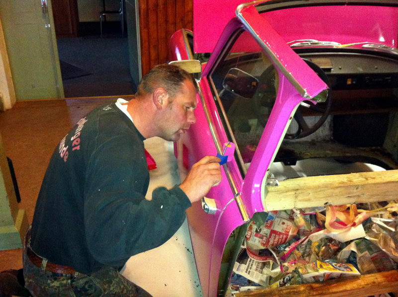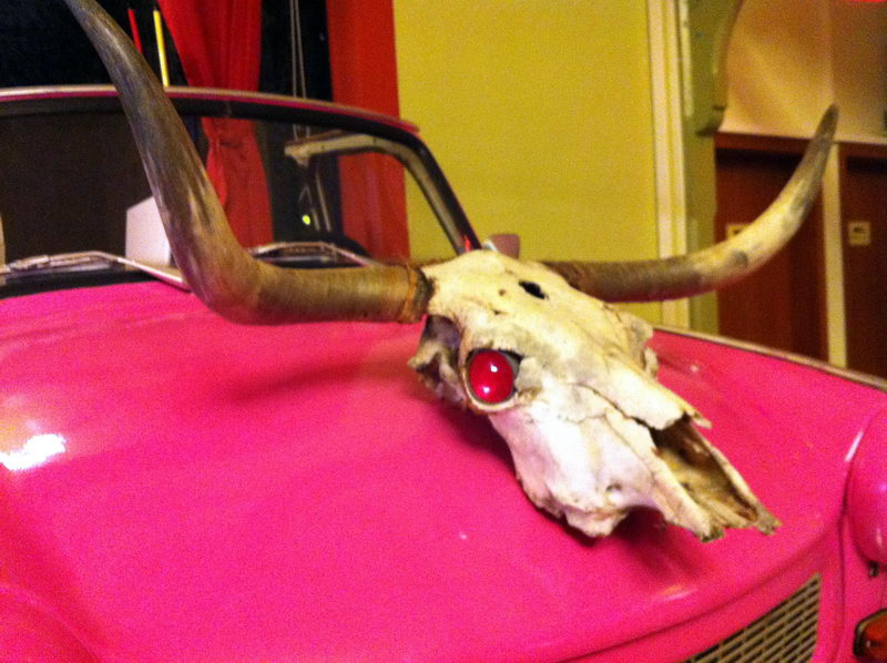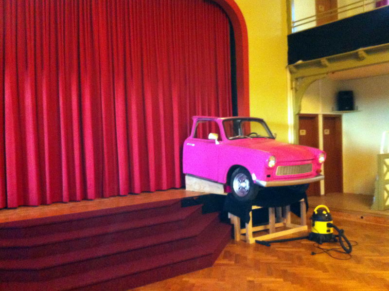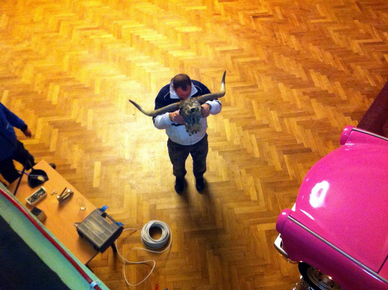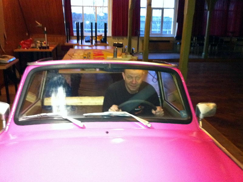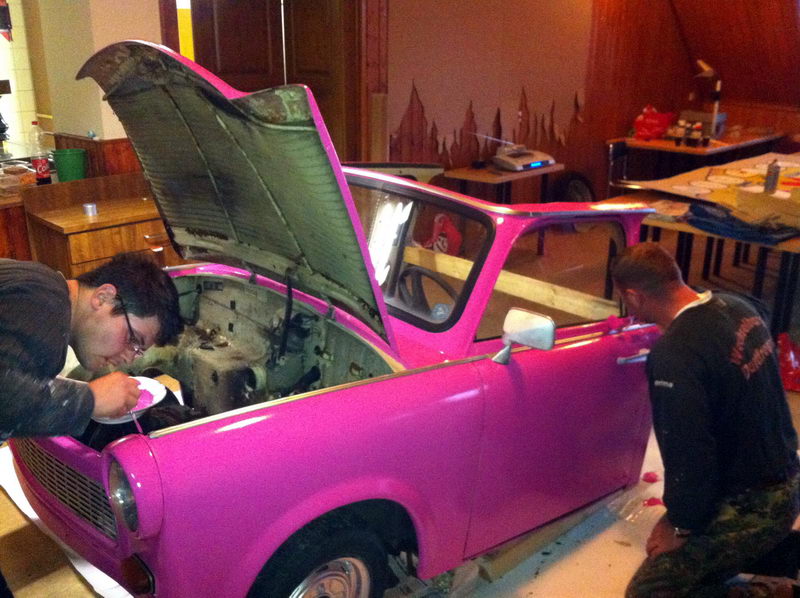Nach dem Abholen vom Autohaus Sturne wurden auf dem Firmengelände von Stefan Theuer der Trabi ausgeweidet und (seit vielen Jahren) einer ersten Grundwäsche unterzogen. Danach wurde er ins Schützenhaus transportiert. Hochkant von vier Mann getragen, passte er gerade so durch die Türen des Schützenhauses. Hier ging es erst einmal an die farbliche Gestaltung. Pink sollte es werden. - Das war der Wunsch von Prinz Rudi. auch wenn dies farblich wohl nicht ganz zum Kostüm der Prinzessin passt. Aber hier konnten wir keine Rücksicht nehmen. Frisch gestrichen wurde er dann auf sein neu gebautes Podest gehoben und entsprechend schick hergerichtet. Bis fast zum letzten Tag wurden am Trabi noch An- und Umbauten vorgenommen. Sei es die wieder-Inbetriebnahme der Beleuchtungsanlage. der Einbau einer Nebelmaschine oder das Anbringen von roten Augen am Bullenschädel.