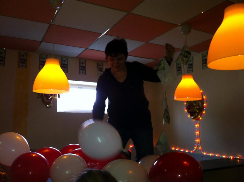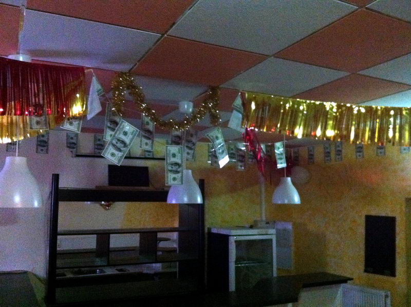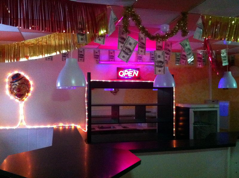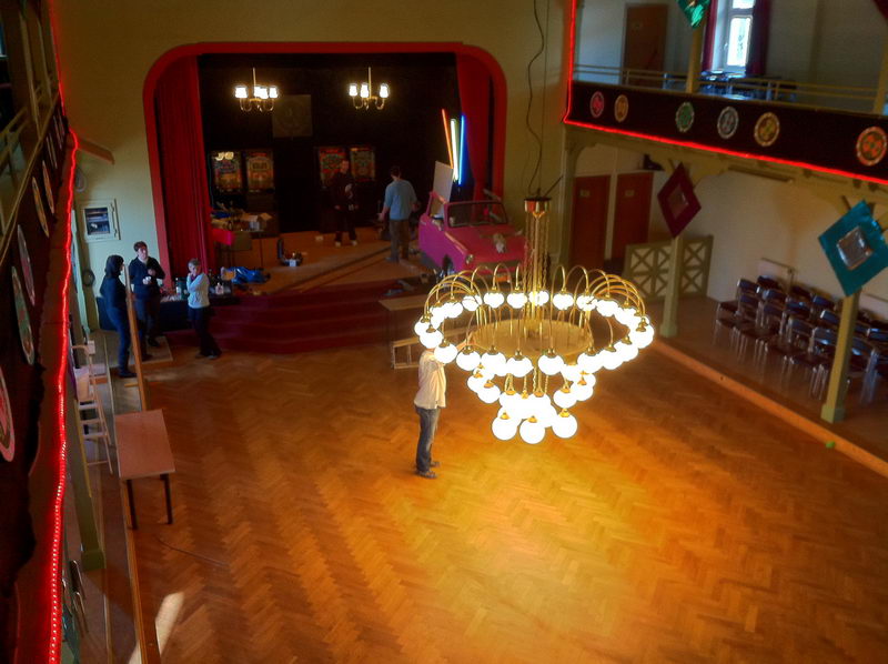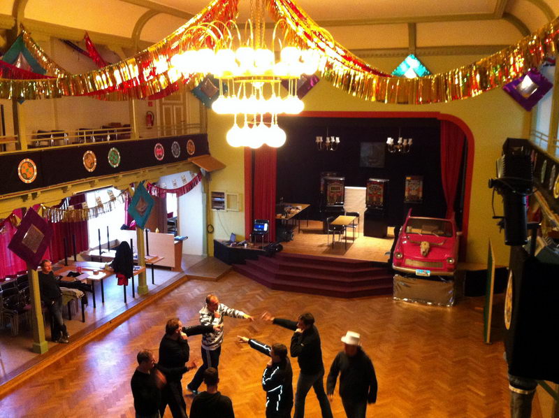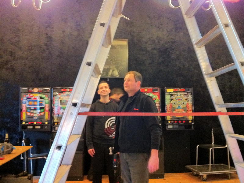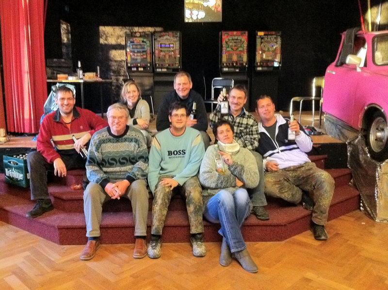 Parallel dazu wurde von Sibyll Listner die Dekoration des Saales und von der "Gruppe Bühne" - die eigentlich identisch mit dem "Trabi-Team" ist - die Gestaltung der Bühne vorbereitet. Der Saal sollte ja ein großes Casino in Las Vegas werden. David Meliczek hatte extra für die Bühne vier ausrangierte Spielautomaten besorgt, so dass die Bühne sich tatsächlich in eine Spielhölle verwandelte.