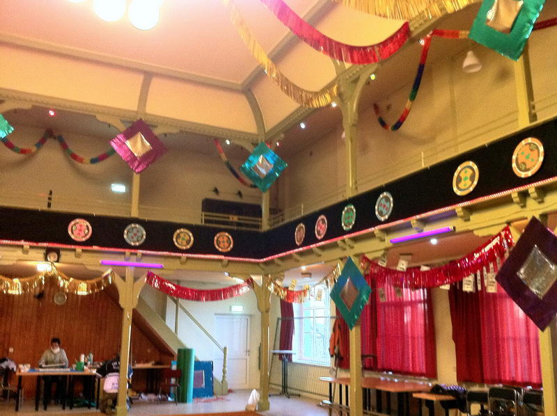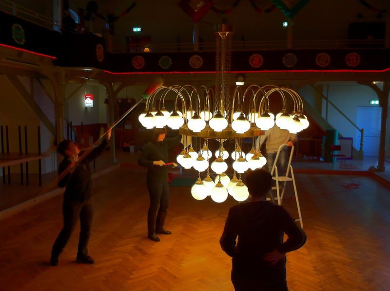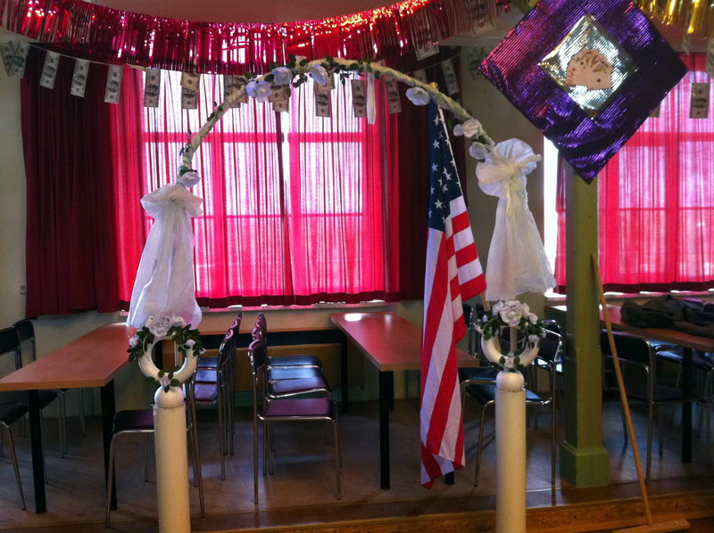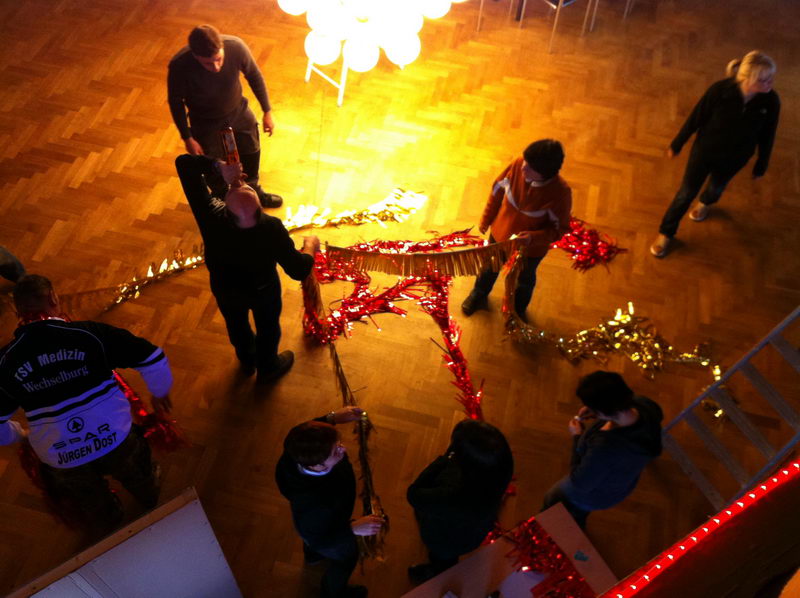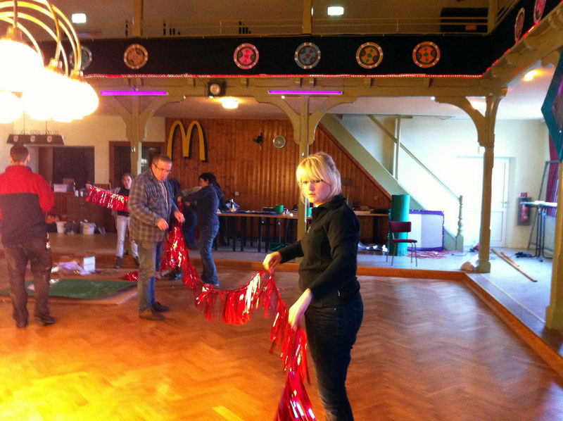 An den zwei Aufbauwochenenden wurden von vielen fleißigen Helfern des Vereines die vorbereiteten Dekomaterialien, Girlanden und ähnliches an die Wände und Decken gepappt und der Saal gesäubert. Außerdem wurden noch die notwendigen Requisiten für die einzelnen Auftritte angefertigt.