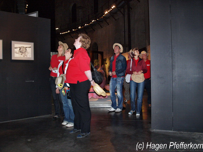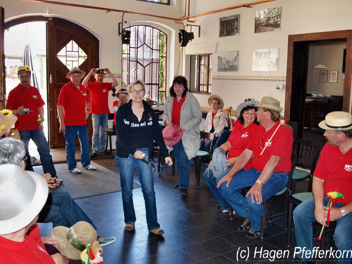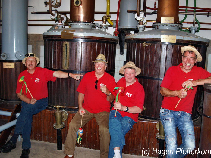In der Nordhäuser Brennerei stellten wir dann fest, dass neben uns noch eine zweite, wenn auch kleinere, Gruppe anwesend war. Daher gab es dann auch zwei Führerinnen. Eine sehr junge und eine im mehr mittleren Alter. Letztere übernahm dann freiwillig die Roten (nicht politisch, sondern wegen unserer roten Vereins-Poloshirts). Entweder wusste sie nicht, was sie damit tat oder sie wollte die jüngere vor dem Schicksal bewahren. Bei uns ging es mit Sicherheit nicht so lahm zu, wie in der anderen Gruppe, die - obwohl sie viel weniger Leute als unsere Gruppe waren - mit Sicherheit viel mehr Jahre zusammenbekommen haben. Aber unsere Führerin hatte es nicht leicht, sich gegen unseren karnevalistischen Humor durchzusetzen. Zur Hälfte der Führung versuchte sie es dann auch mit Bestechung, um uns ruhig zu stellen. Noch lange vor der eigentlichen Verkostung gab es für uns eine Sonderrunde Nordhäuser Doppelkorn zum Vorkosten. Doch geholfen hat es nicht viel. Wie geplant bildete dann die Schnapsverkostung den Abschluss der Brennereibesichtigung. Dabei konnten wir feststellen, dass in Nordhausen nicht nur Doppelkorn gebrannt wird. Wenn mein Gedächtnis zu diesem Zeitpunkt noch richtig funktioniert hat (und mich mein Erinnerungsvermögen nicht verlassen hat), waren es insgesamt sechs oder sieben Sorten, die wir verkostet haben.