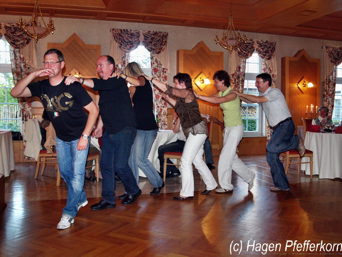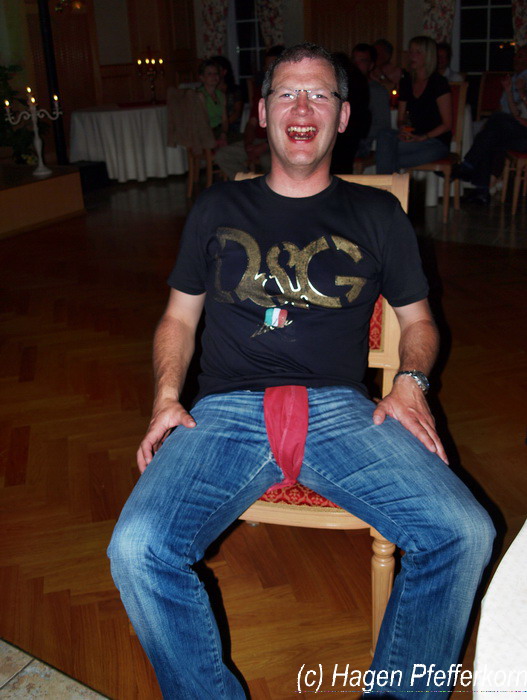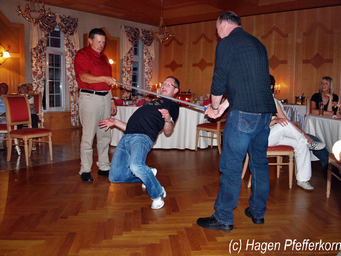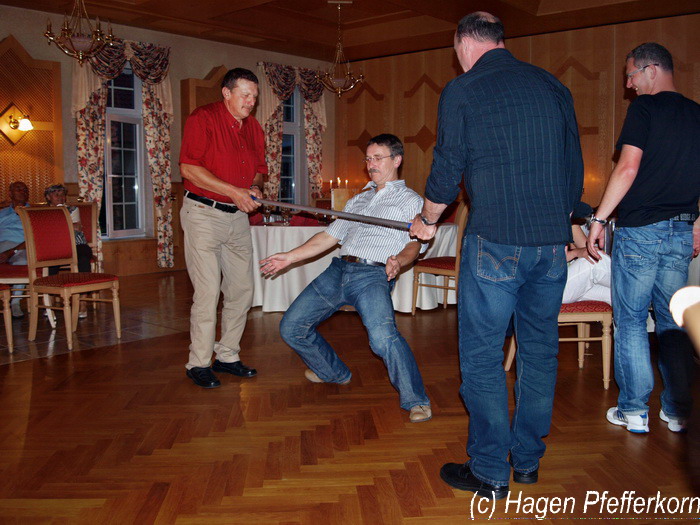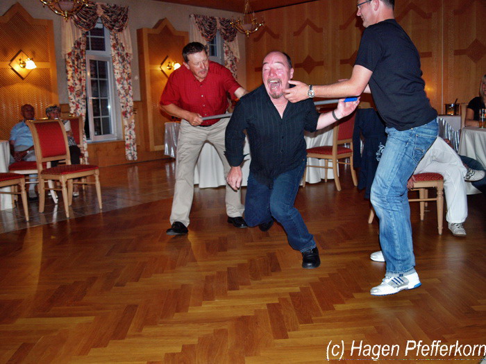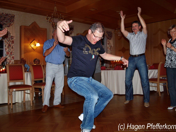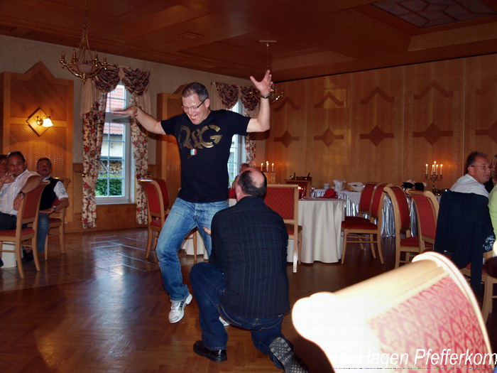 Der Alleinunterhalter war Superklasse. Und auch über unseren Christian - den Kellner unsers Saales - konnte sich keiner beschweren. Das war ein positives Gegenstück zur Bedienung bei unserer letzten Ausfahrt. Natürlich überließen wir als Karnevalisten die Gestaltung des Abends nicht allein dem Alleinunterhalter. Einige trugen eigene Darbietungen vor. Und auch sonst gab es reichlich zu lachen. Selbst eine beim Kassatschok im Schritt zerrissene Hose sorgte bei allen Anwesenden - inkl. dem Betroffenen - für Heiterkeit. Und - wir bereiten uns ja auf die nächste Faschingssaison vor - auch eine Polonaise fehlte an diesem Abend nicht. Angeführt - wie konnte es anders sein- von Sven. Weit nach Mitternacht hatten dann auch die Letzten den Weg auf ihr Zimmer gefunden. Denn früh sollten ja alle wieder fit sein für den zweiten Teil der Vereinsausfahrt.