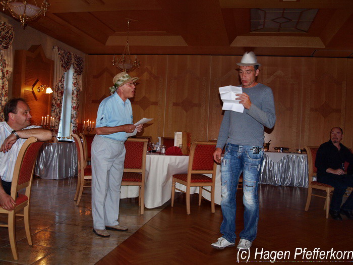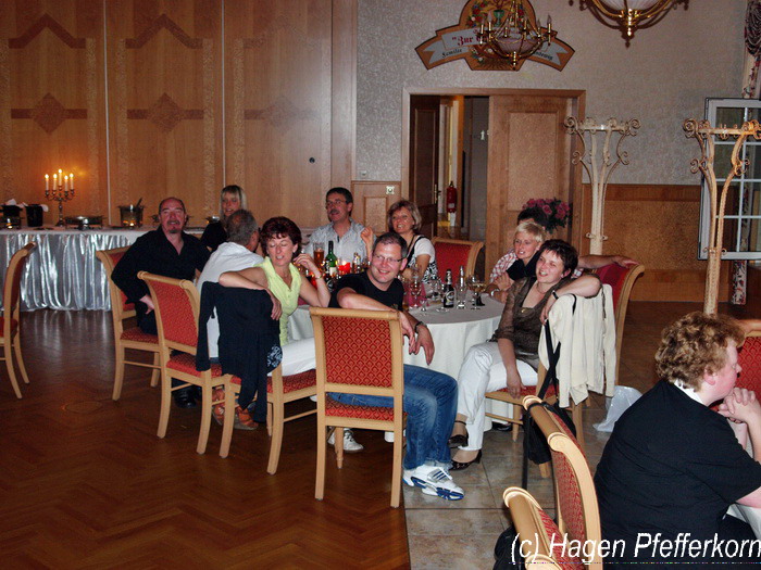 Nach der Brennereibesichtigung ging es dann nach Bielen ins Hotel. Nach dem Einchecken hatte jeder Zeit, sich noch einmal etwas für den Abend frisch zu machen. Ab 18.00 Uhr stieg dann die Abendfete. Wie schon aus den letzten Jahren gewohnt, war dazu ein Alleinunterhalter engagiert wurden. Schade an dem Abend war eigentlich nur, dass die Fete trotz schönem Wetters nicht - wie in der Ausschreibung angekündigt - im Freien auf einer Terrasse stattfand. Im Saal des Hotels war es einfach zu heiß und zu stickig. Aber dass war auch schon das einzige Negative des Abends.