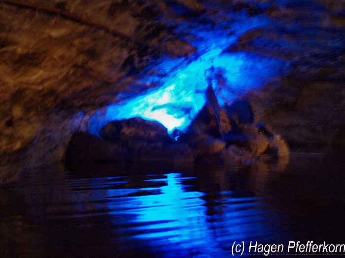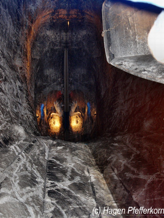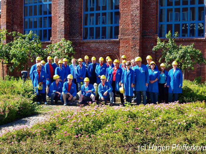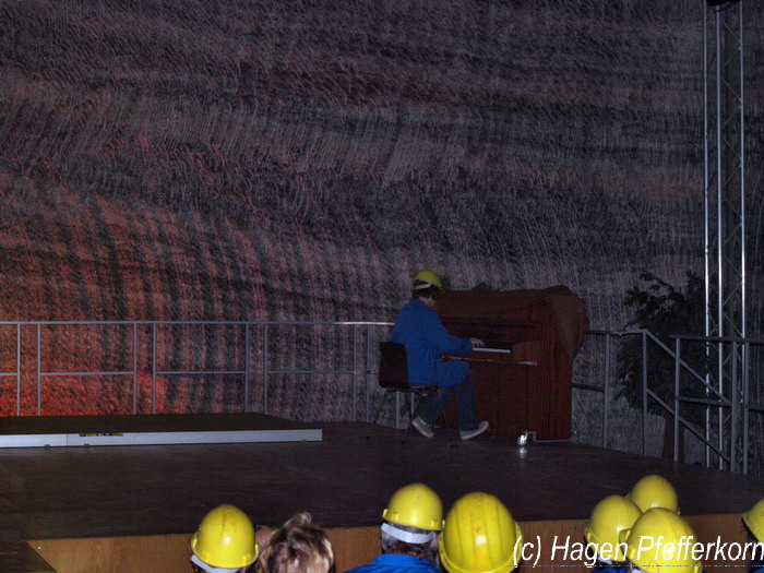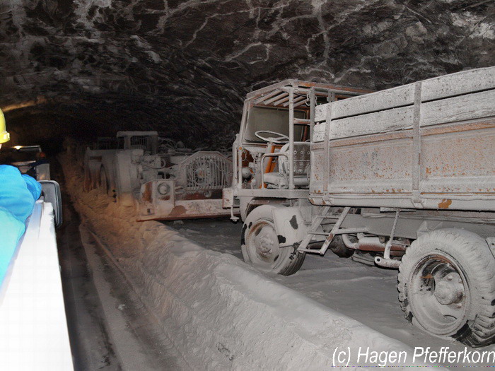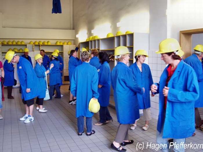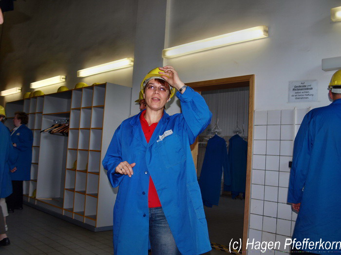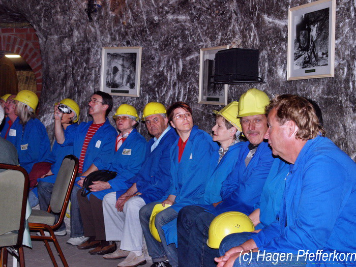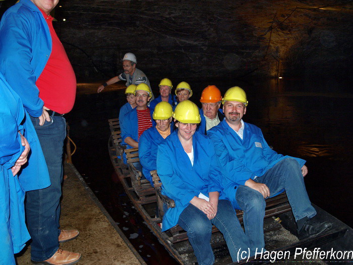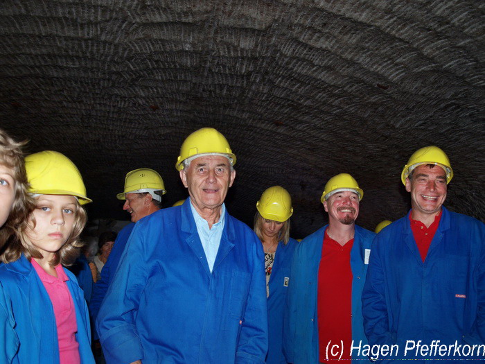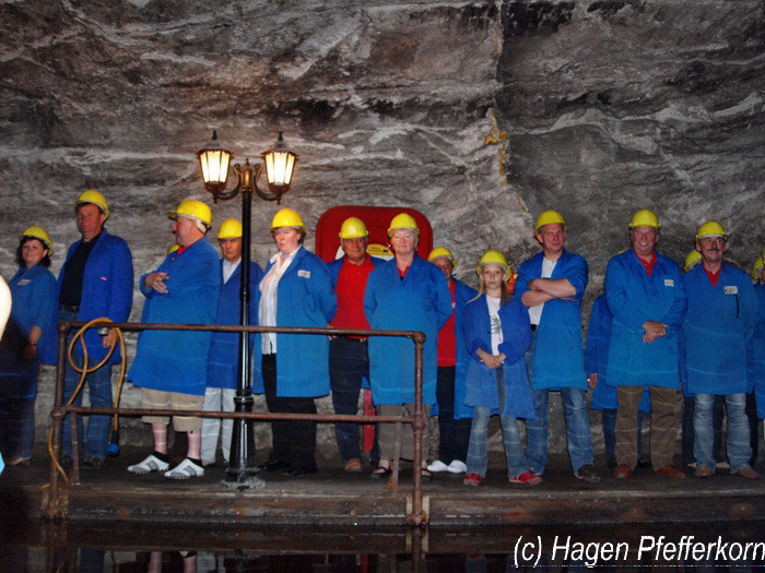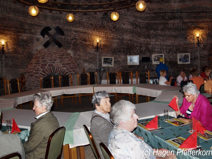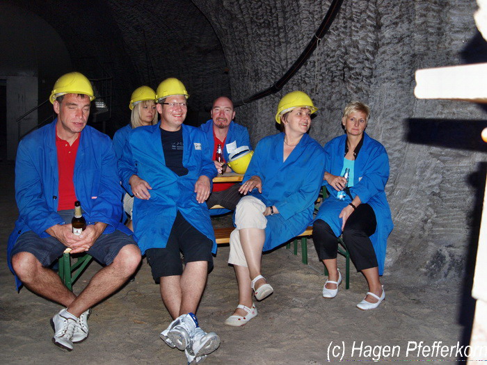 Im Erlebnisbergwerk ging es dann erst einmal an's Umkleiden. Denn Sicherheitskleidung (blauer Kittel und gelber Helm waren angesagt - wahrscheinlich gesponsort von Lok Leipzig) war angesagt. Die ca. halbstündige Wartezeit wurde mit allerlei Gequatsche verbracht. Man musste ja Einige davon ablenken, dass es gleich in einem engen Transportkorb für knapp 700 Meter hinab in den Bauch von Mutter Erde gehen sollte. So nebenbei wurde auch ein Gruppenfoto gemacht. Man wusste ja nicht, wer von den Anwesenden sich zwei Stunden später wieder an der Erdoberfläche zurückmelden würde. Dann ging es endlich los. Immer ca. 15 Personen quetschten sich in einen engen Förderkorb - und ab ging es in die Tiefe. Schon die Größe der Halle, die wir dort unten aus dem Förderkorb betraten, war gigantisch. Aufgeteilt auf insgesamt vier LKW's (es waren mehrere Gruppen, die das Wagnis "Bergwerk" auf sich genommen hatten) ging es dann los mit der Untertagetour. Und diese Fahrt war hammerhart. Laut Prospekt wird nur mit maximal 25 km/h gefahren. Unser Führer sprach von maximal 40 km/h. Doch wahrscheinlich sind wir zeitweilig um einiges schneller unterwegs gewesen (gefühlte 60 - 79 km/h). Und das alles in engen Tunnelröhren mit engen - zum Teil 120 Grad - Kurven. Und immer schön bergauf und bergab. Unser Führer sagte dazu "alle, die hier unten fahren, haben oben keinen Führerschein". Zwischendurch gab es eine Vorführung eines 10-Tonnen-Radladers. Auch die Vorbeifahrt an hunderten alten Fahrzeugen ("Fahrzeugfriedhof") war beeindruckend. Aber das alles war noch gar nichts gegen den riesigen Konzertsaal in 700 Meter Tiefe. Dieser hat Platz für 350 Besucher und hat eine Superakustik. Aus einer der mit in die Tiefe gefahrenen Gruppen hatte sich eine junge Frau spontan bereit erklärt, uns ein Stück auf dem Klavier darzubieten. Der Klang war super (und ihr Mut, das überhaupt zu machen, war es auch). Seit wenigen Jahren gibt es dort unten sogar eine Zweibahnen-Kegelanlage. Das wäre sicher auch mal was besonderes: Eine Trainingsveranstaltung unserer Vereinskegler in Vorbereitung auf den nächsten Wagner-Bau-Pokal in 700 Meter Tiefe. Da müssen wir halt mal mit unserem Schatzmeister sprechen. Nach der Besichtigung des Festsaales (hier könnte König Artus Tafelrunde stattgefunden haben) ging es dann endlich wieder in Richtung Erdoberfläche. Obwohl uns vorher freundlicherweise mitgeteilt wurde, dass 10 Prozent Verluste normal und eingeplant sind, haben es zumindest dieses Mal alle wieder zurück nach oben geschafft.