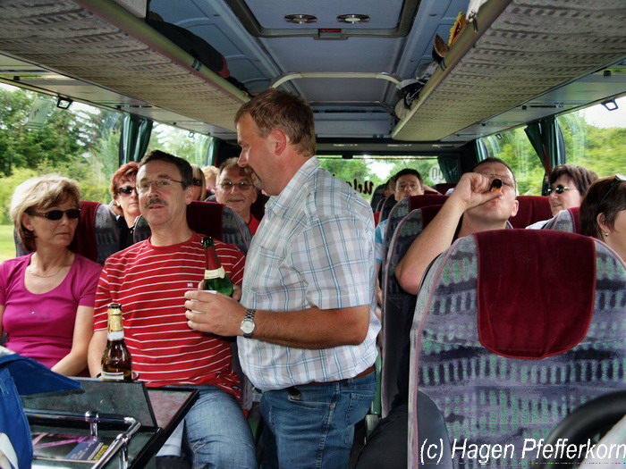 Ein Paar - die Familie Pfefferkorn - hatte es nicht ganz pünktlich zur Abfahrt geschafft. Glücklicherweise hatten sie vorgesorgt, um die fällige Strafe in Form von diversen nichtantialkoholischen Getränken begleichen zu können. Bereits vor der Abfahrt des Busses hatte Hagen diese Strafrunde bereits an alle ausgegeben. Doch unser Ziel, den frühesten Trinkzeitpunkt aller Zeiten (im letzten Jahr mit knapp fünf Minuten nach der Abfahrt aufgestellt) zu unterbieten, konnte leider nicht erreicht werden. Micha, unser Busfahrer redete und redete und redete - bis die Zeit weit überschritten war. Erst acht Minuten nach der Abfahrt - in Höhe des Zustiegspunktes der Familie Saupe in Mutzscheroda war es dann endlich soweit: Udo konnte die erste Runde der Ausfahrt 2009 zum Trinken freigeben.