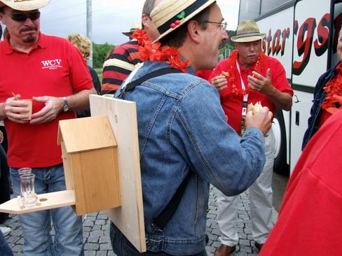 Die erste Rast wurde vor allem genutzt, um sich so richtig zu stärken, damit die Anstrengungen der Ausfahrt auch reibungslos überstanden werden konnten. Mit dabei auch ein Requisit aus der vergangenen Faschingssaison: die Zwitscherbox.