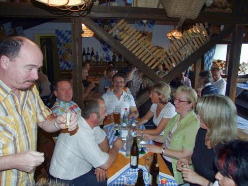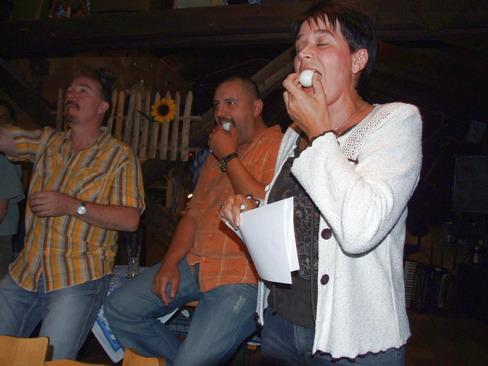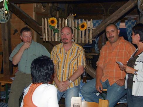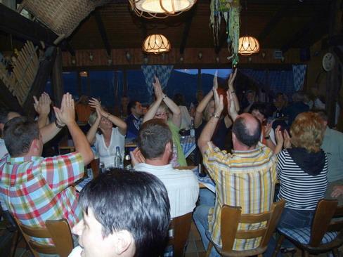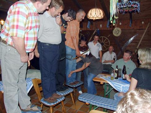 Das eigentliche gesellige Beisammensein ging dann recht beschaulich los. Der engagierte Alleinunterhalter begann sehr verhalten, so dass anfangs die meisten (jüngeren) Teilnehmer lieber den Abend auf der Terrasse vor dem Dachboden beim Quatschen verbrachten. Die einzigen Lichtblicke zu dieser Zeit waren die urigen Witze, die der Chef des Hauses zum Besten gab.