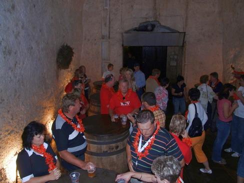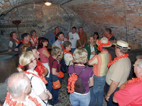 Während die meisten kurz vorher noch über die große Hitze im Freien gestöhnt hatten, erwartete uns dabei ein Abenteuer der besonderen Art: Leicht bekleidet (die Jacken waren im Bus geblieben, denn keiner wusste, was uns erwartete) ging es in die historischen Kühlkeller der Brauerei. Etwa neun Kilometer Gänge bei gleich bleibend 7 (!) Grad Celsius sollten wir zum Teil durchwandern. Ganz schnell wurde das Kuschelbedürfnis bei den Meisten um vieles größer. Da wurde jeder gezeigte Filmbeitrag zur Qual verlängernden Folter. Unsere behaarten Vorfahren waren für so etwas eindeutig besser gerüstet.